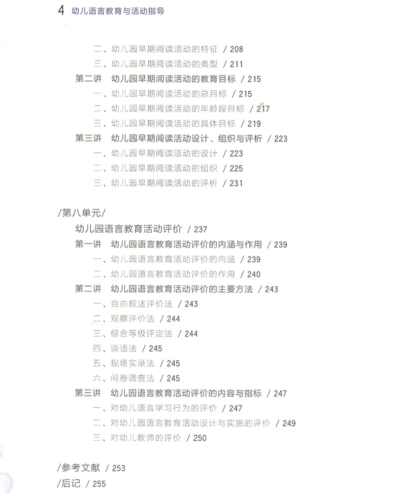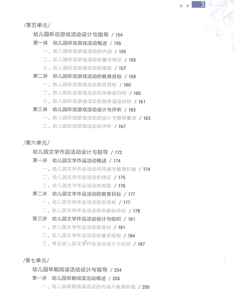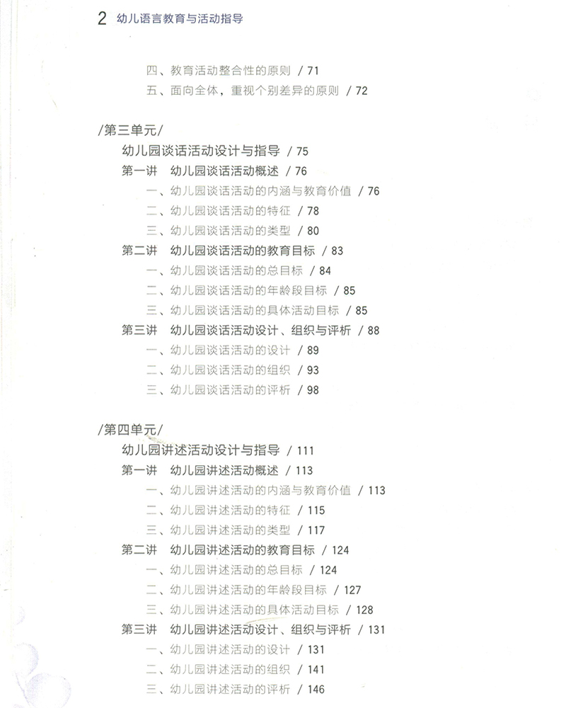 本书遵循“以就业为导向,以能力为本位,以学生为中心”的原则,全书在编写体例和编排上一改传统的章、节结构,以单元模式编写,每个单元设有问题导入、思维导图、学习目标、理论知识、案例评析、学以致用、过关检测等内容。并适当安排了“相关链接”“互动平台”、“扫扫二维码”等栏目,突出对有价值的幼教故事、幼儿教师资格证考试考纲与考题、幼教前沿理论的吸收,拓展了学生的知识视野、强化了学生实践能力的训练。全书内容分为八个单元,包括幼儿语言教育概述、幼儿园语言教育活动设计与指导、幼儿园谈话活动设计与指导、幼儿园讲述活动设计与指导、幼儿园听说游戏活动设计与指导、幼儿园文学作品活动设计与指导、幼儿园早期阅读活动设计与指导以及幼儿园语言教育活动评价。