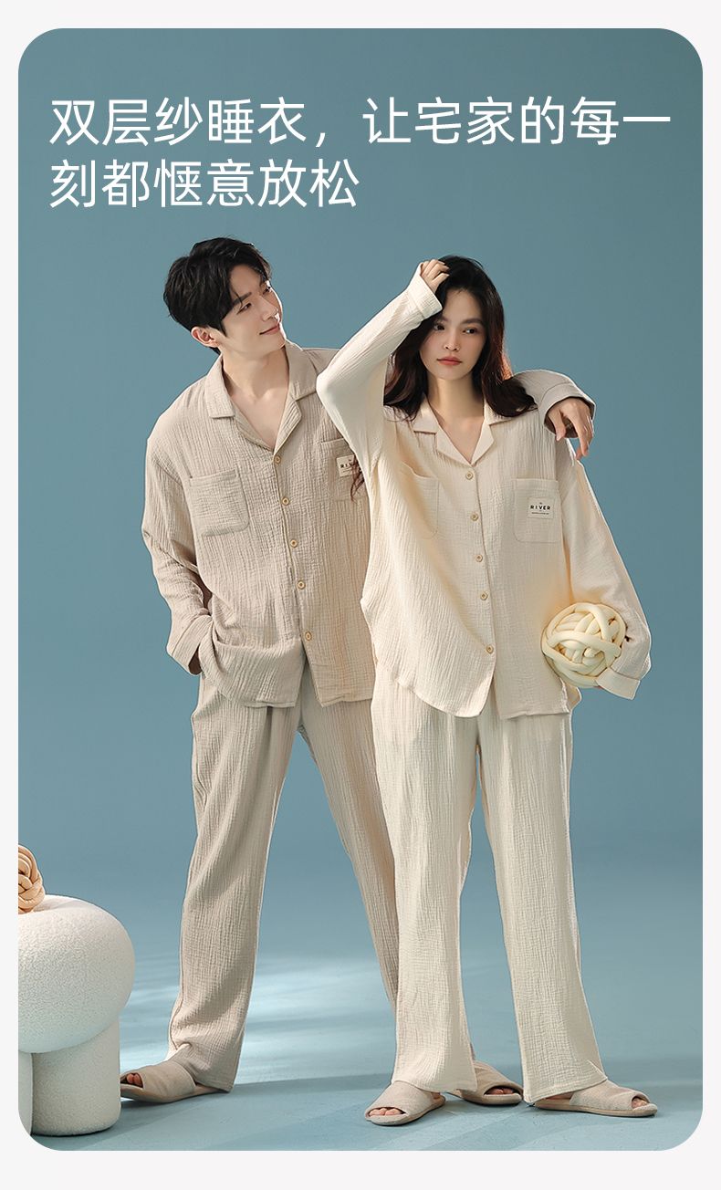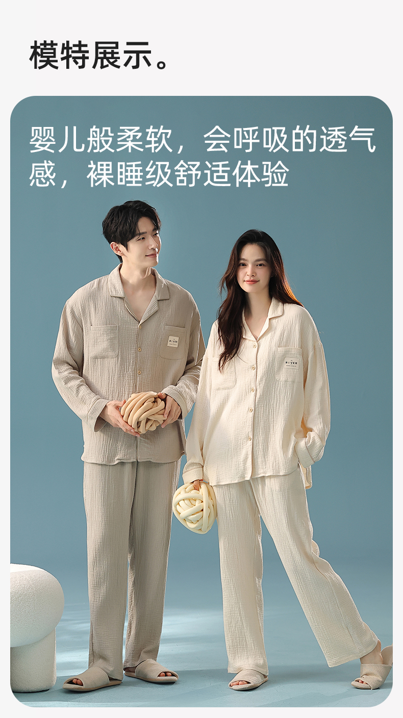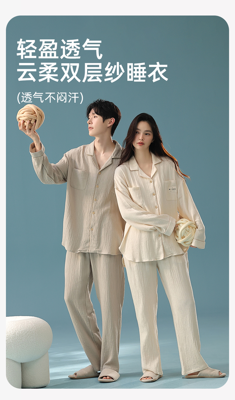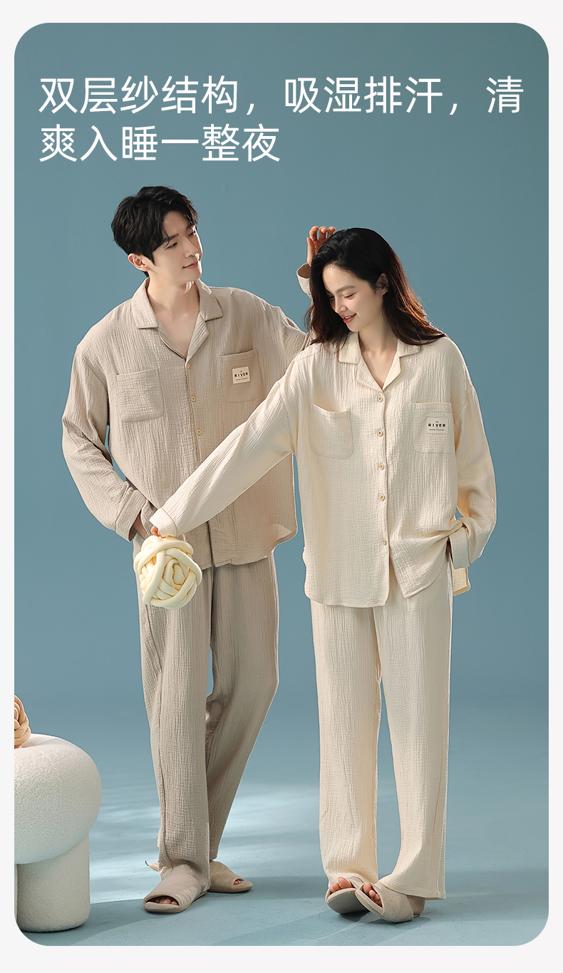【透气婴儿棉】自然醒「椰椰奶泡」双层纱秋季柔软全棉情侣长袖睡衣A类简约家居服套装JLM