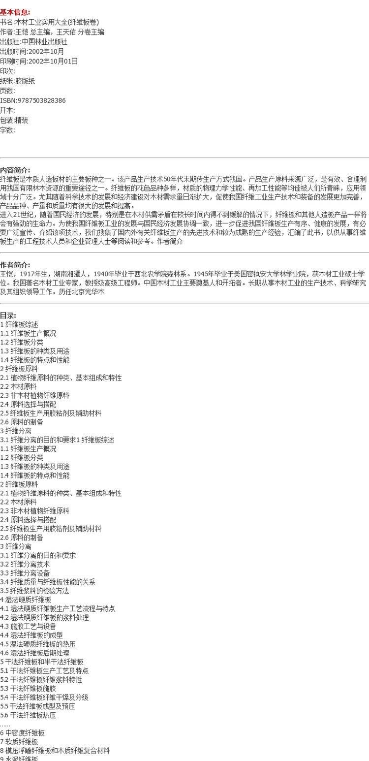 木材工业实用大全纤维板卷2838王恺 编中国林业出版社正版畅销书