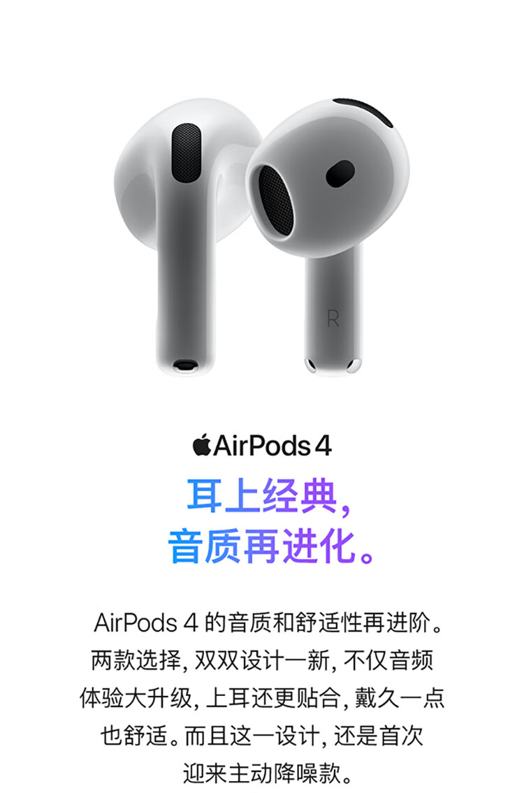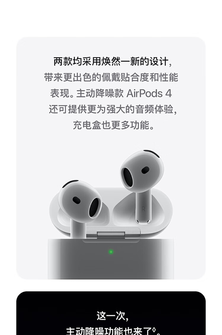 积分免费兑:Apple/苹果 AirPods 4(支持主动降噪)搭配无线充电盒(USB-C)苹果耳机 蓝牙耳机适用iPhone/iPad 四代