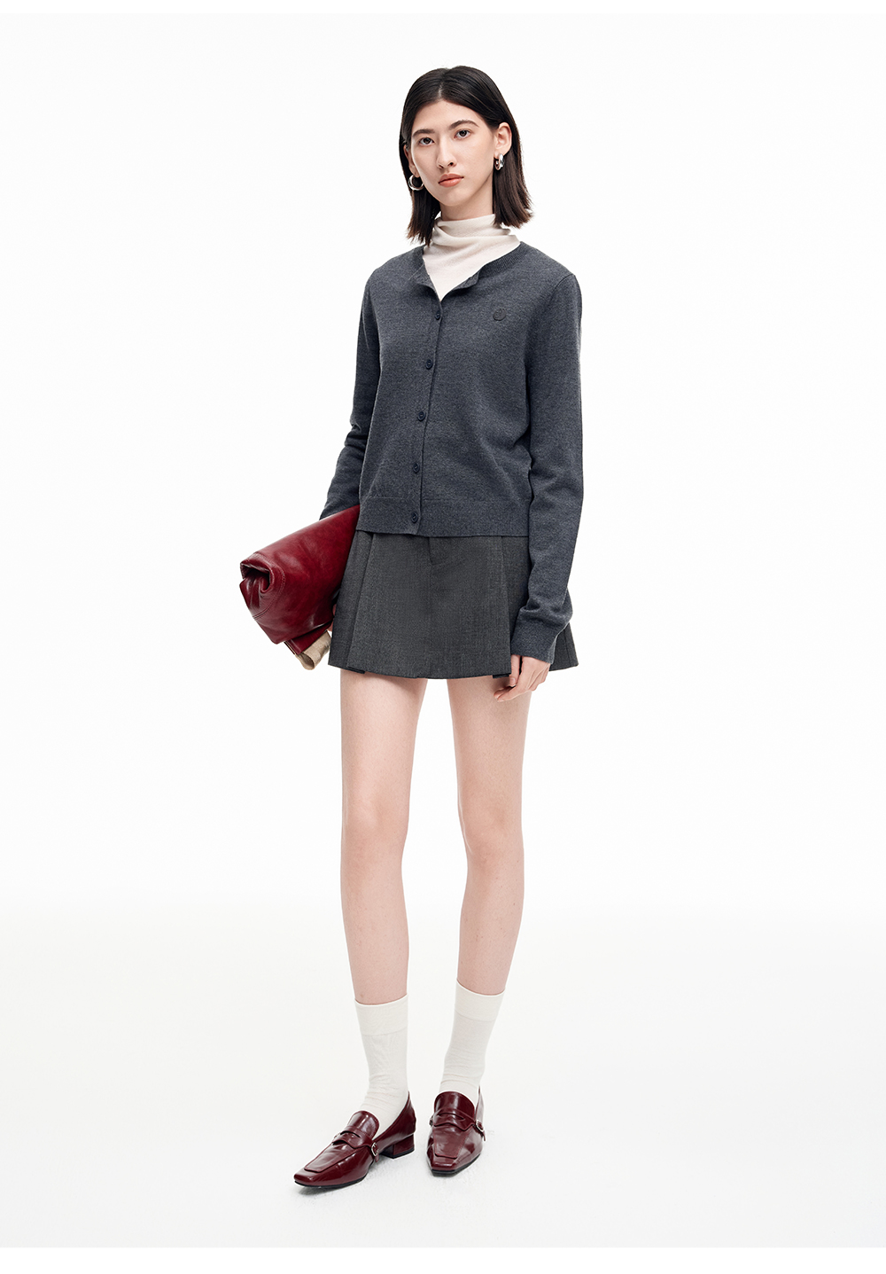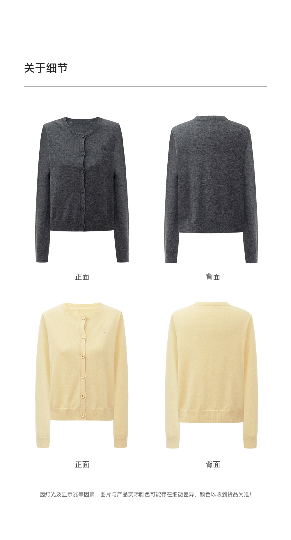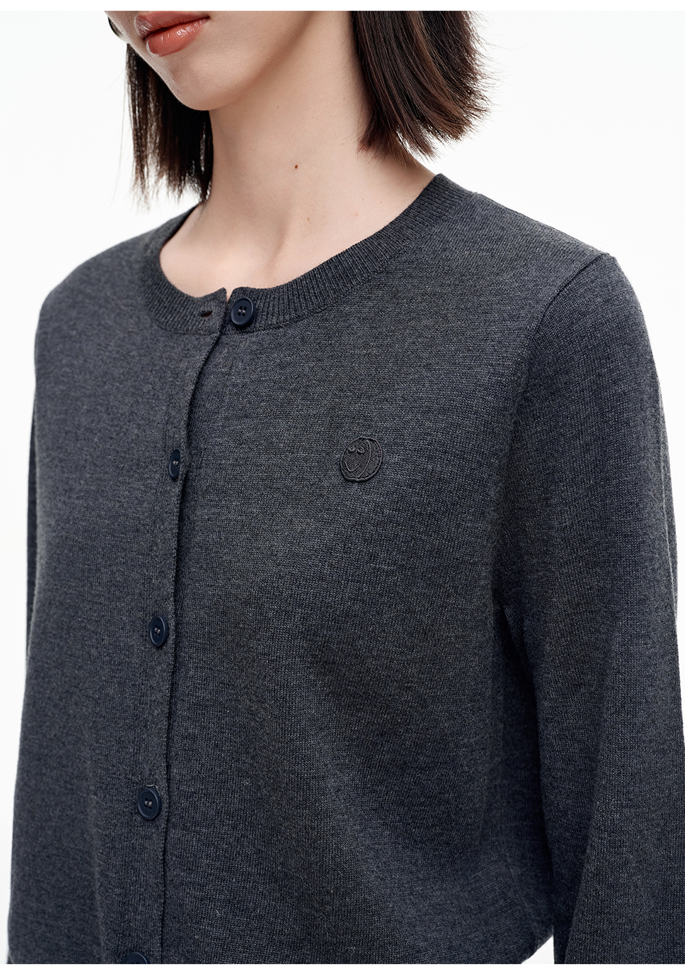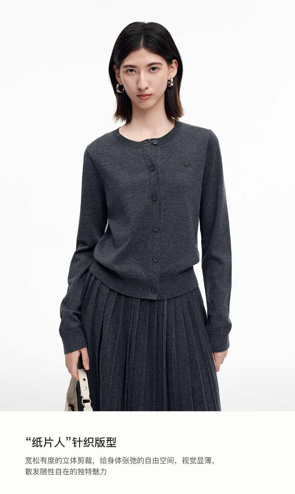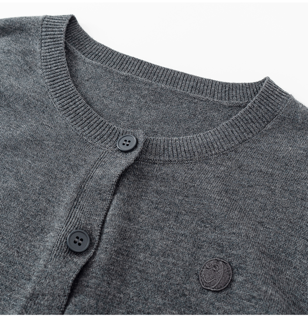 SELFWHO绵羊毛混纺笑脸绣章针织开衫女2025秋季新款保暖圆领上衣