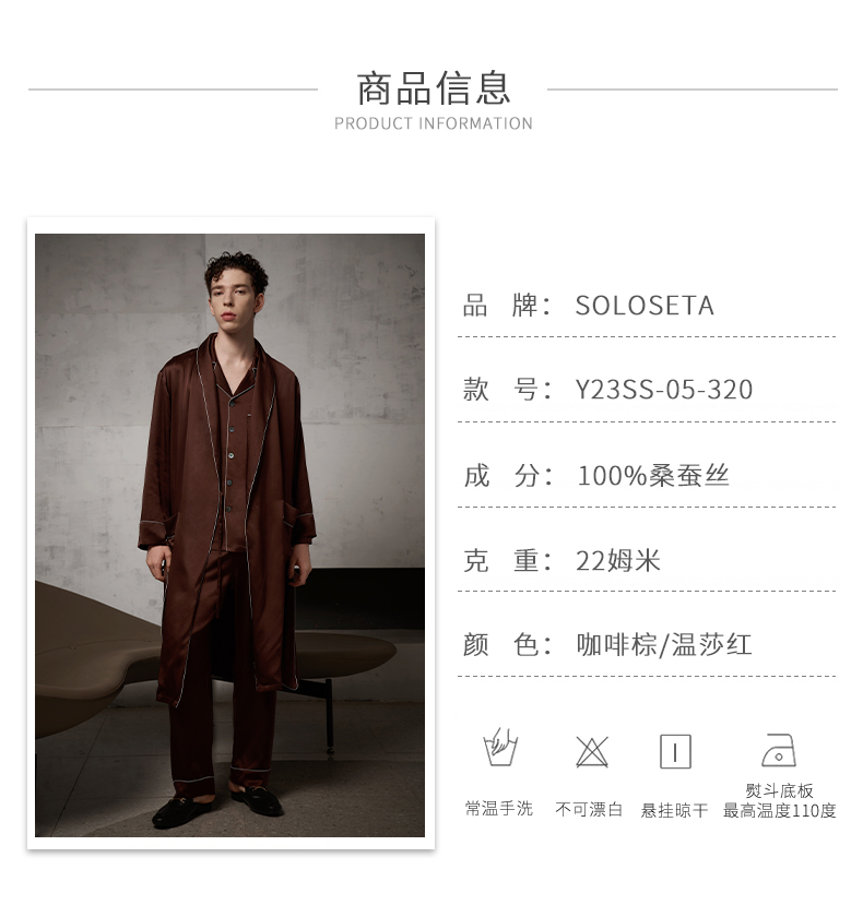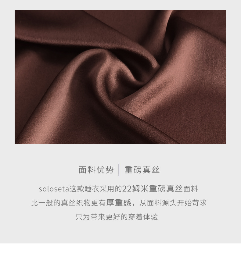 - soloseta专注于真丝织物,灵感源自意大利语,中文含义为“只做真丝”的意思。让睡衣变时尚,居家和外出瞬间切换,使其更具有出街,度假,参加宴会等功能。