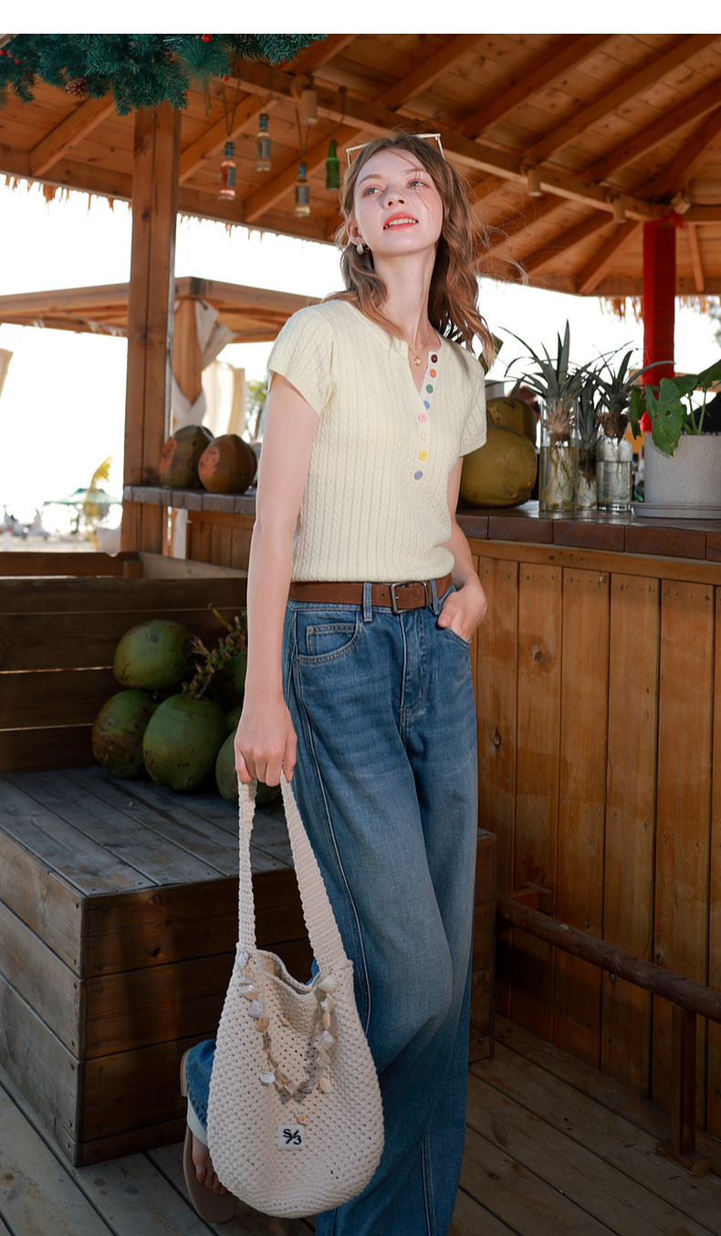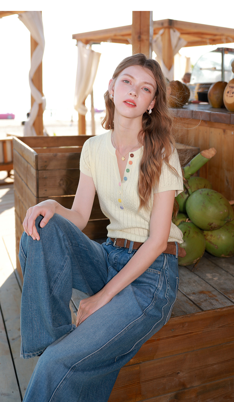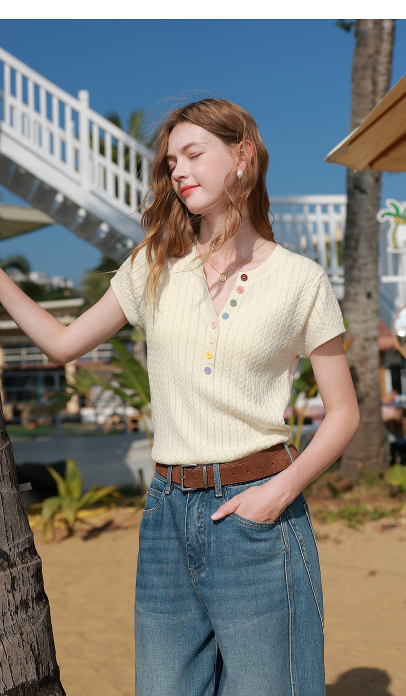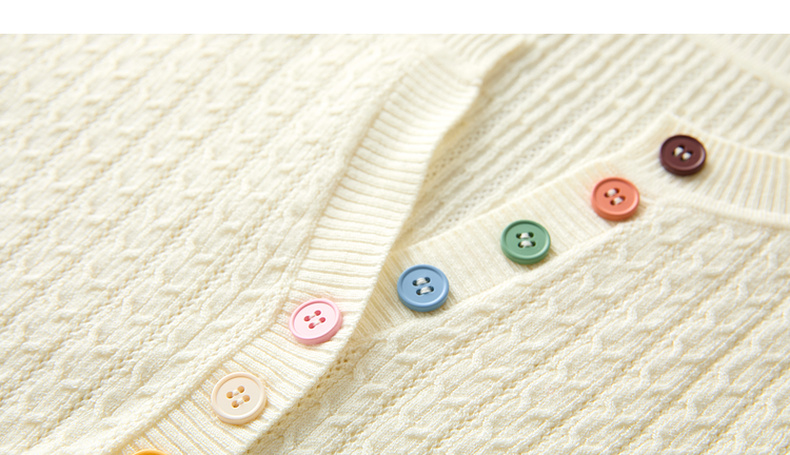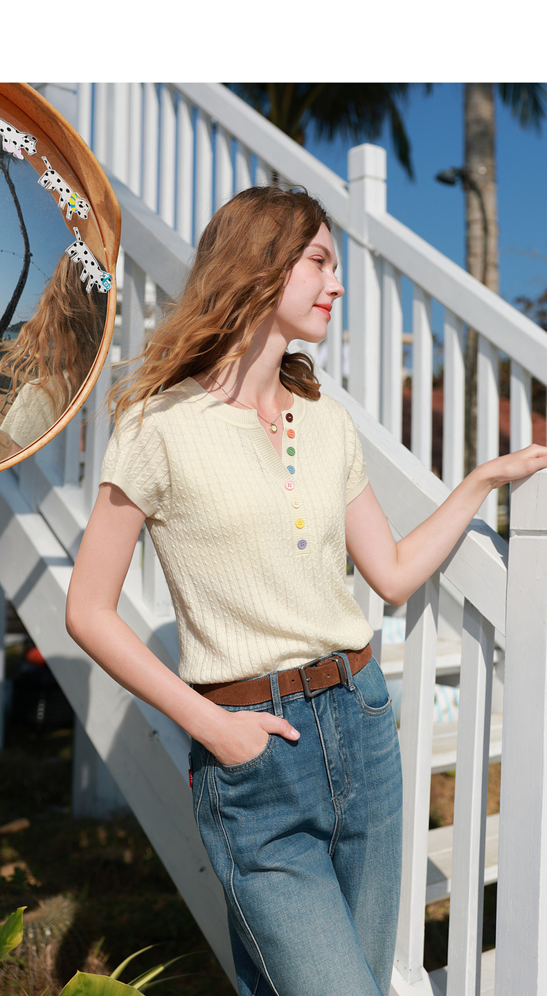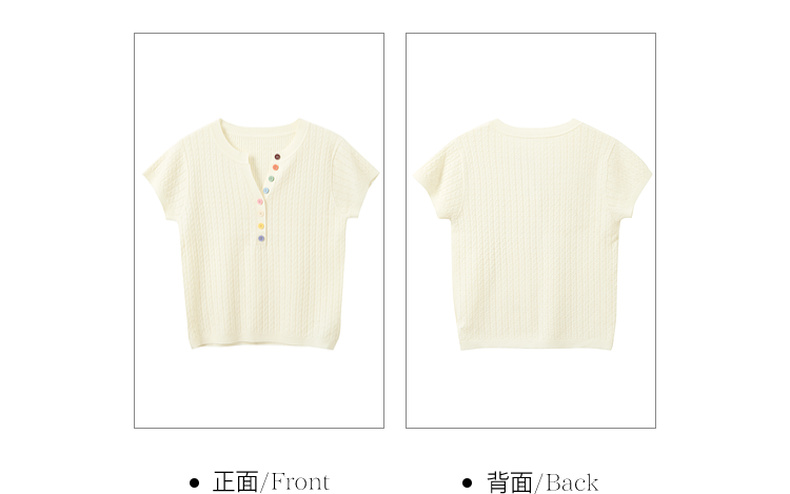 三彩2026春季新款彩色纽扣绞花毛衣套头毛衫修身短袖V领上衣M