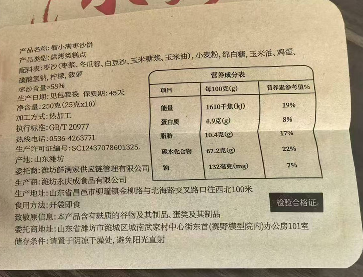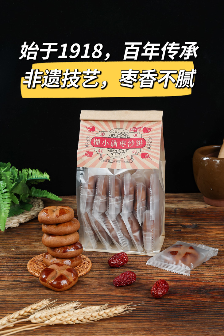 【产品亮点】 1.始于一九一八,百年传承的中式糕点,匠心打造,枣香不腻,老少皆宜,是家中不可缺少的美味。 2.枣沙饼单枚约25克,独立包装,干净卫生,方便携带。 4.非遗技艺,古法传承,共24道工艺。馅料为红枣研磨成枣泥,加入鸡蛋,绵白糖熬制,起锅后加入柠檬菠萝提香,无添加防腐剂色素香精,馅料枣香醇正,劲道不散口。 5饼皮的制作,先用纯净水跟新鲜红枣古法熬制糖浆,经过45天转化熟成,再加入饼皮中,久放不硬,口感绵香,无色素香精防腐剂 6.枣泥及饼皮所用的枣是乐陵金丝小枣,平均制作一粒枣沙饼需要3粒金丝枣。正所谓一日食三枣,容颜永不老。枣沙饼更应该家中常备。 7.枣沙饼枣沙含量>58%,饼皮中鸡蛋含量21%,满口醇香,甜而不腻。 8.榴小满糕点,零反式脂肪酸,零添加防腐剂,零添加香精,每一份都是做给家人,用匠心传承幸福天然味道。