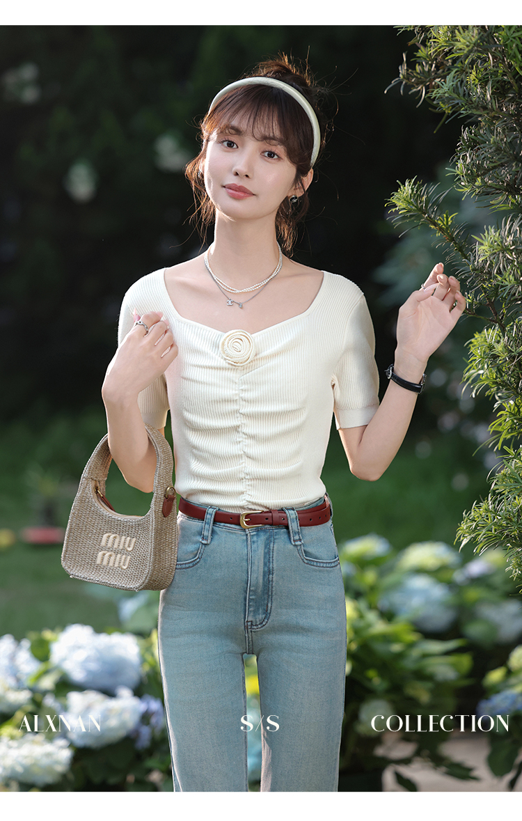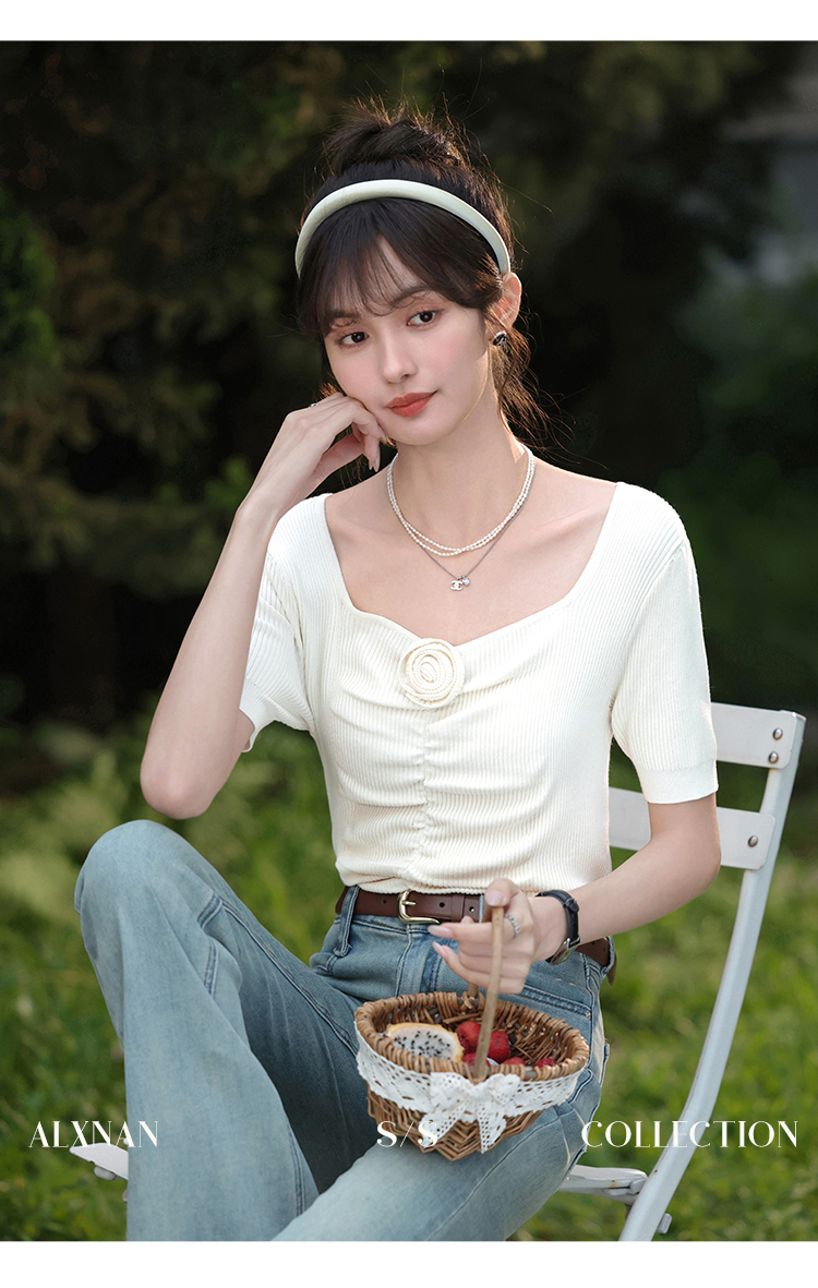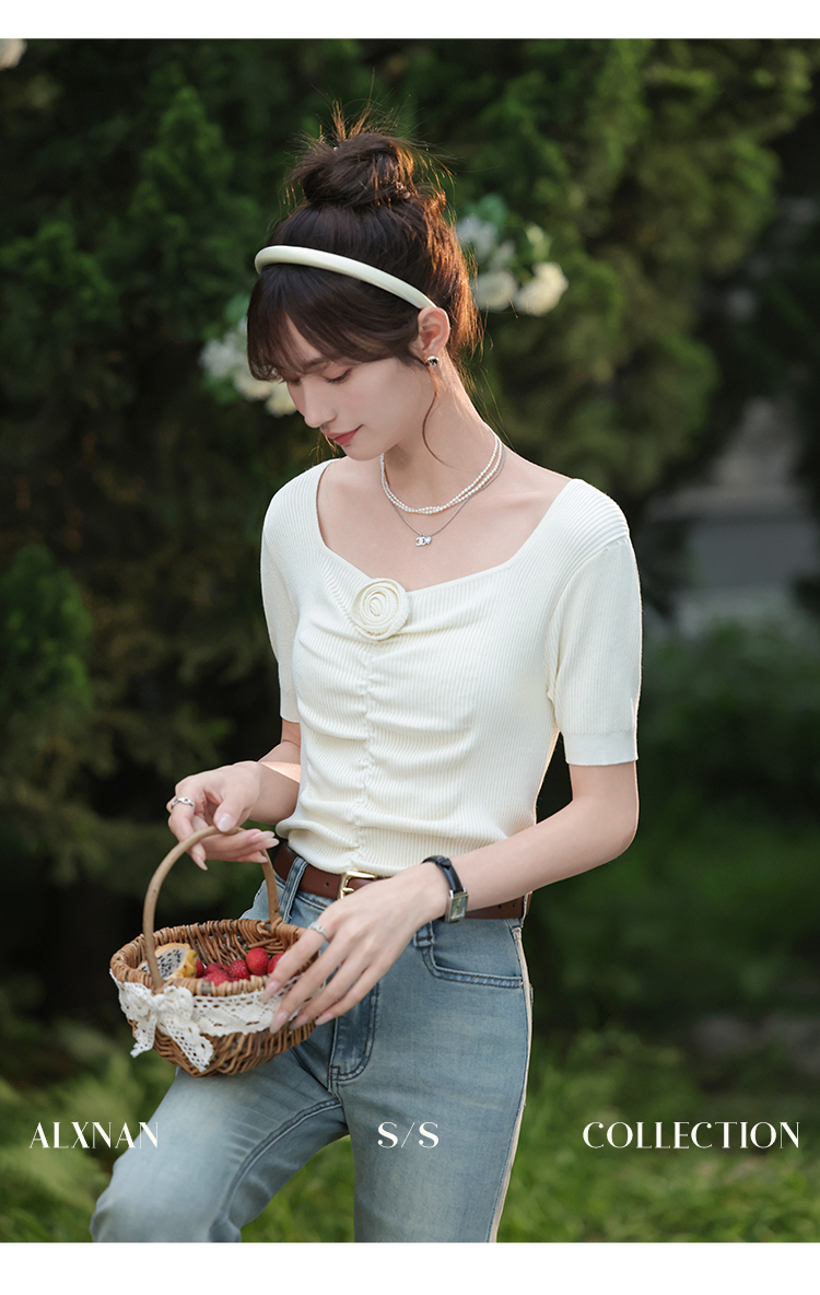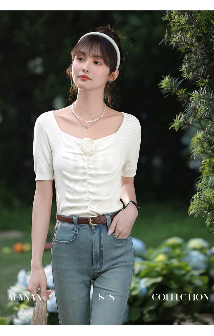 【65折秒杀】鹿向南「洁白茉莉」气质短袖针织衫年夏季法式显瘦打底上衣女L36228