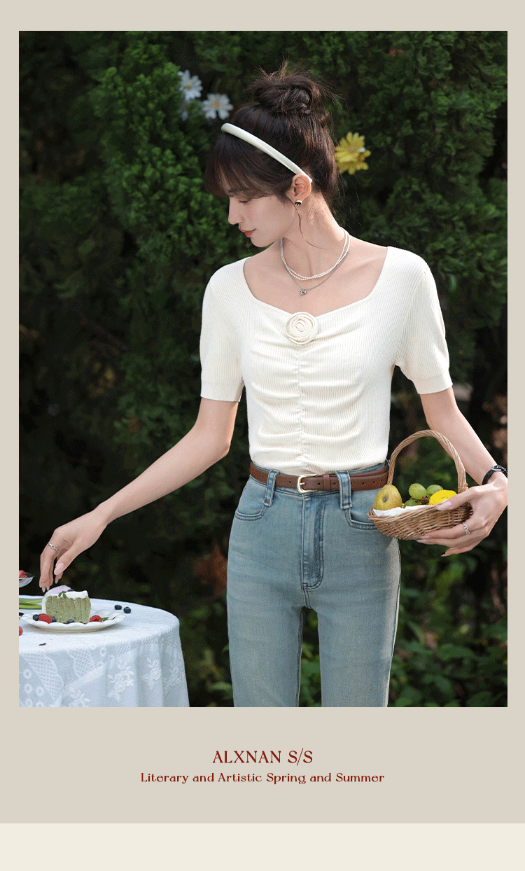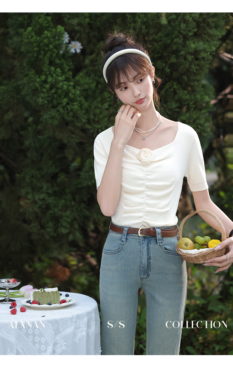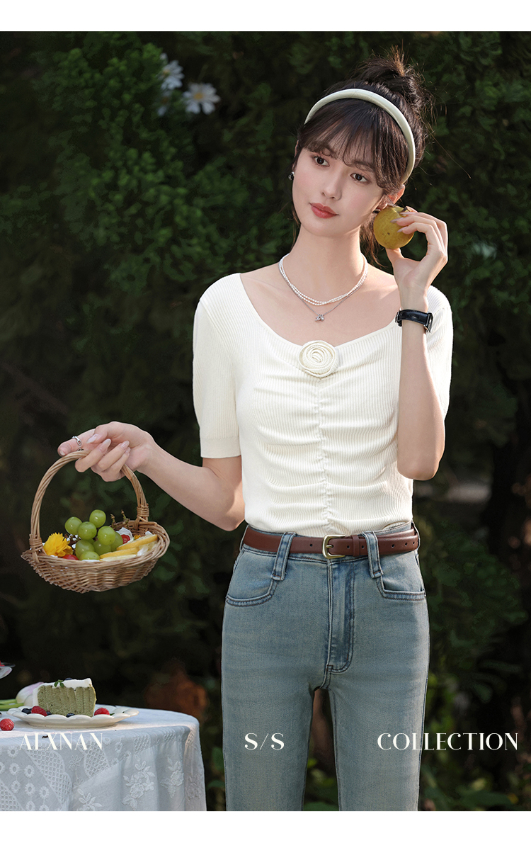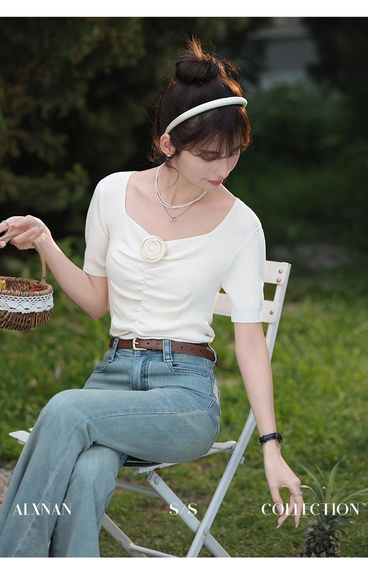 【65折秒杀】鹿向南「洁白茉莉」气质短袖针织衫年夏季法式显瘦打底上衣女L36228