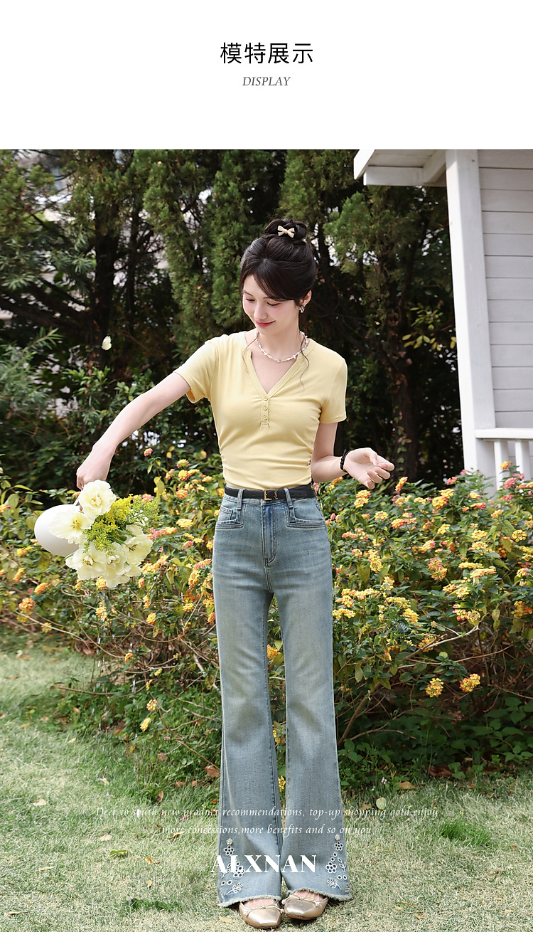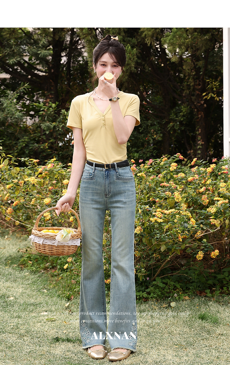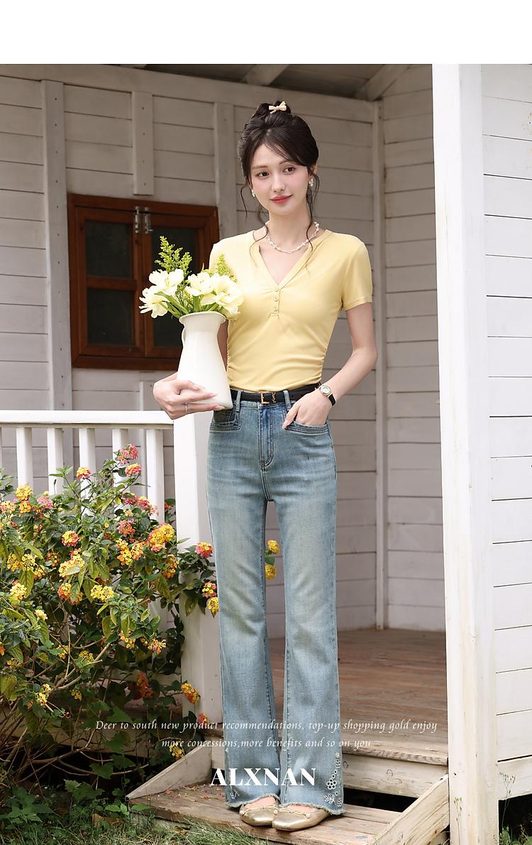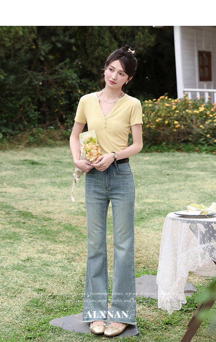 鹿向南「蓝屿花影」复古蓝色高腰显瘦牛仔裤女夏季小个子直筒长裤