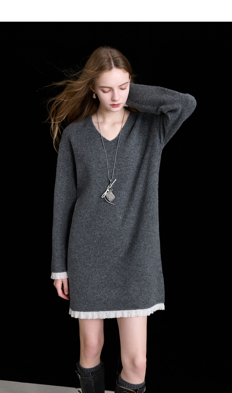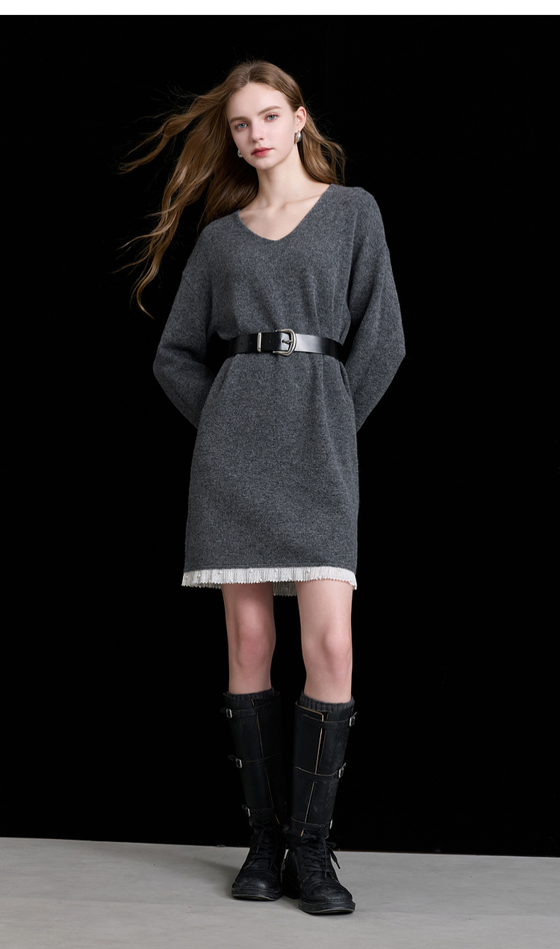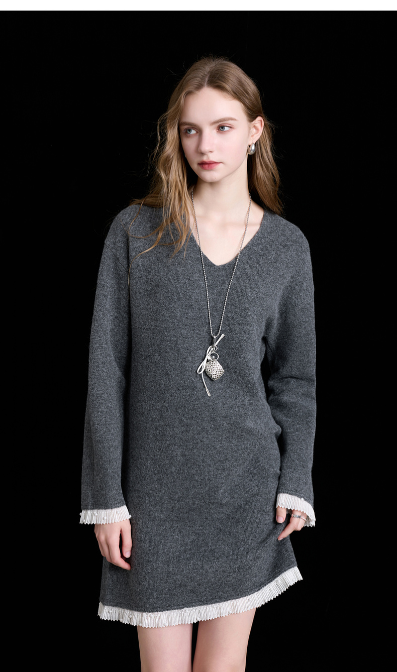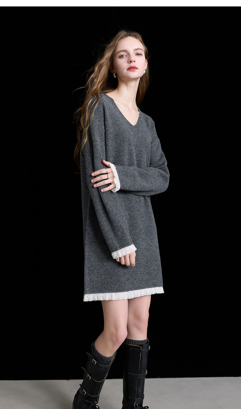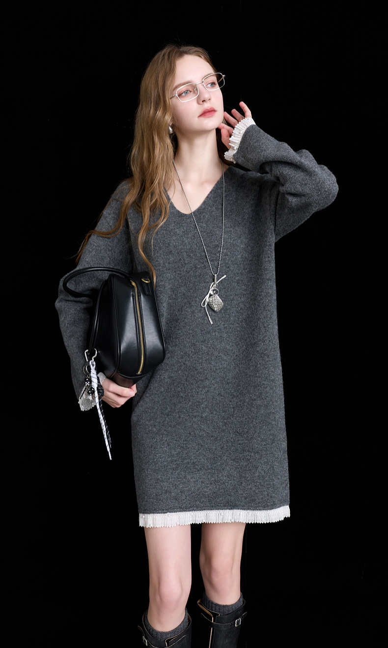 三彩2025冬季新款针织连衣裙V领花边长袖宽松短裙气质简约M
