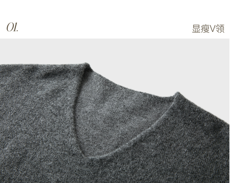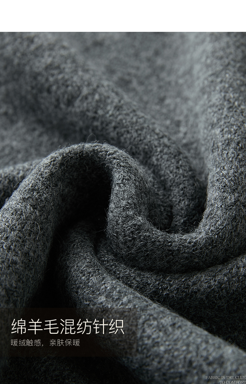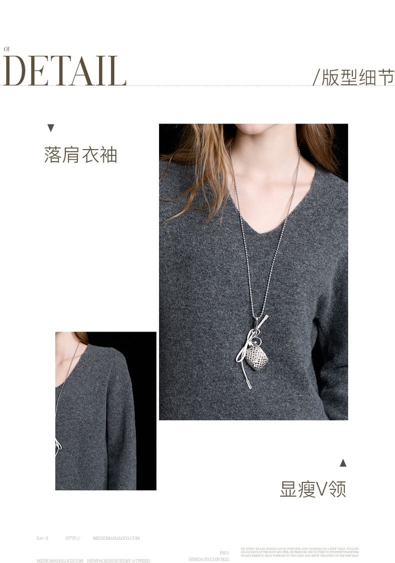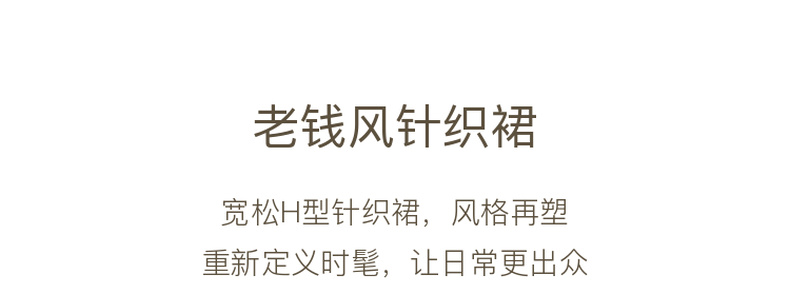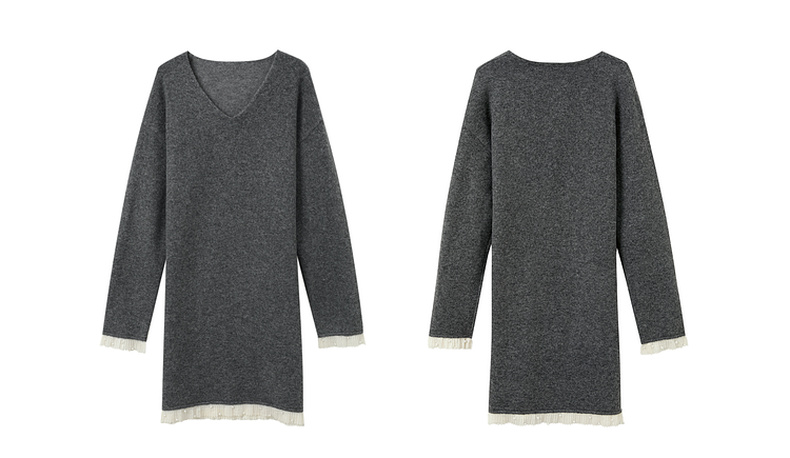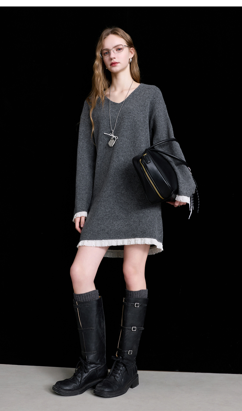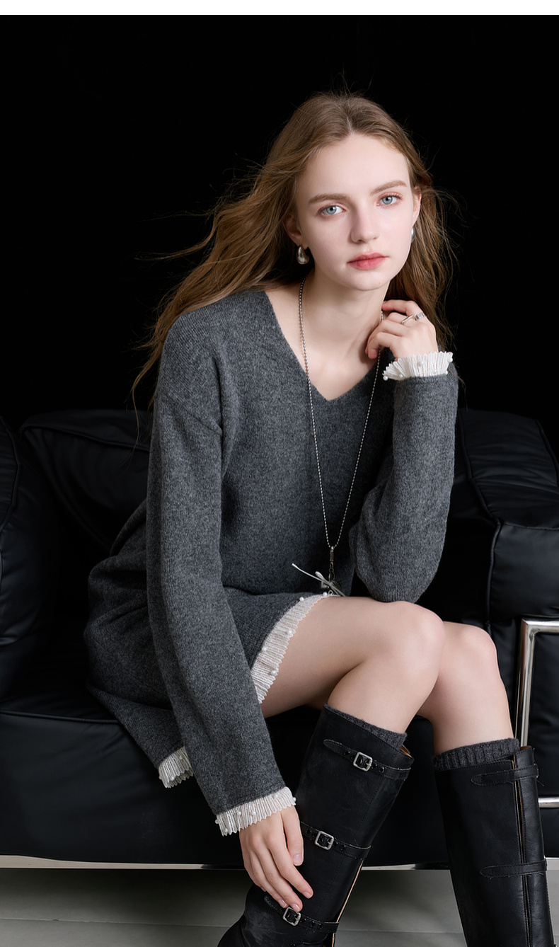 三彩2025冬季新款针织连衣裙V领花边长袖宽松短裙气质简约M