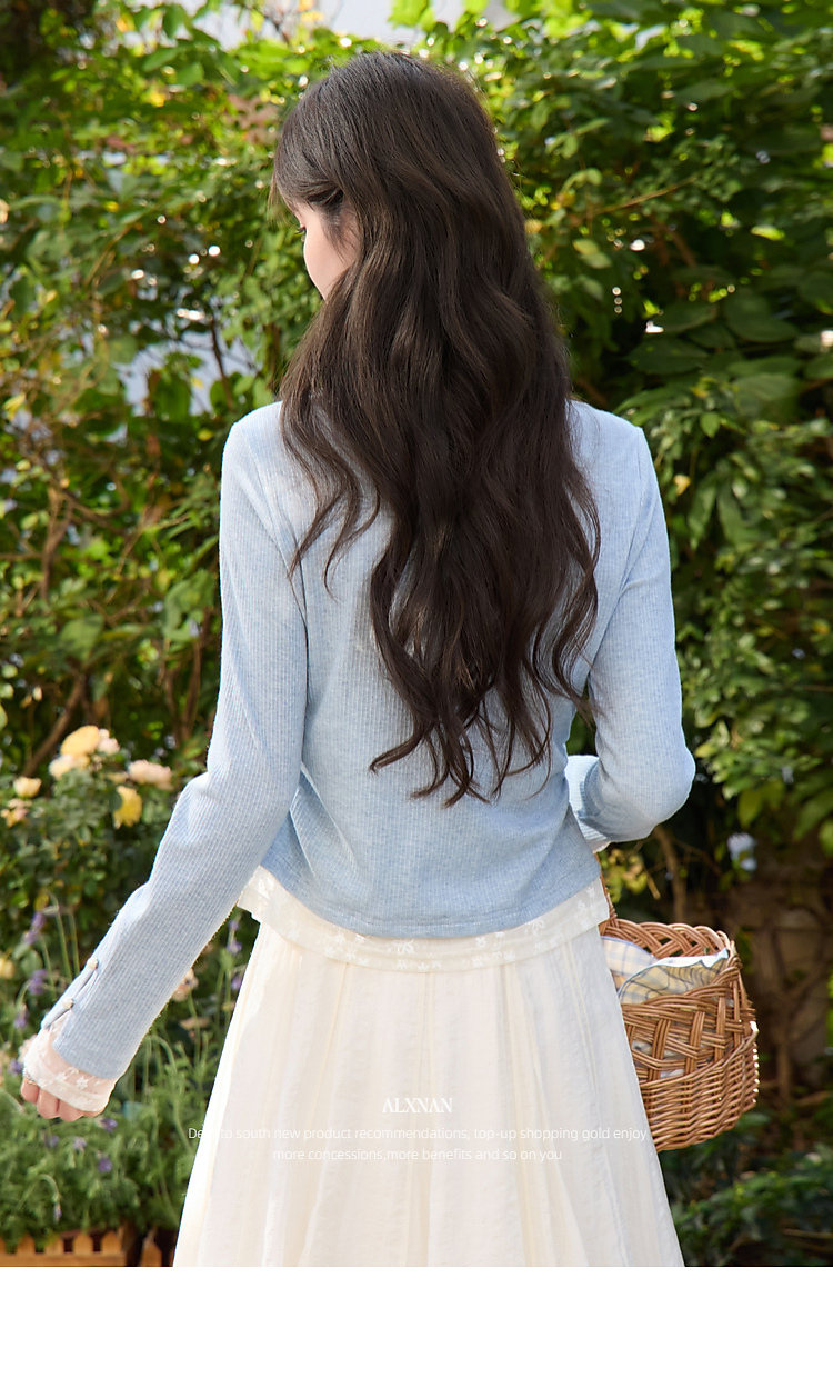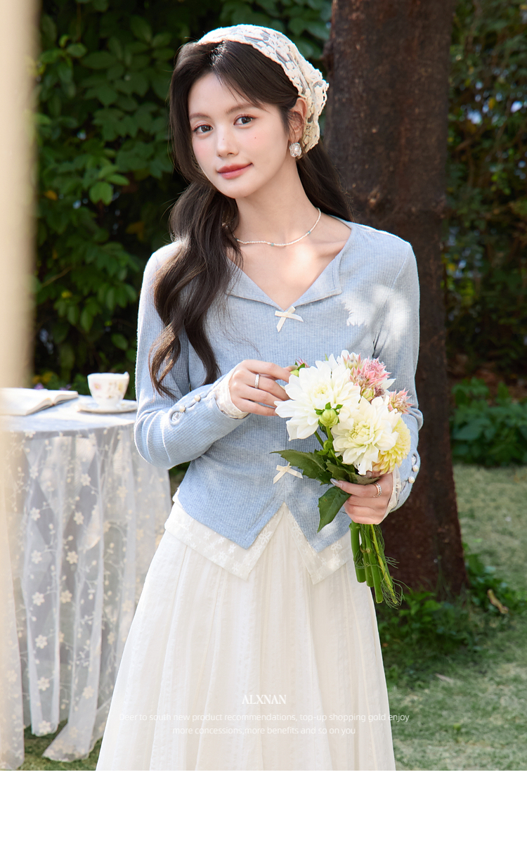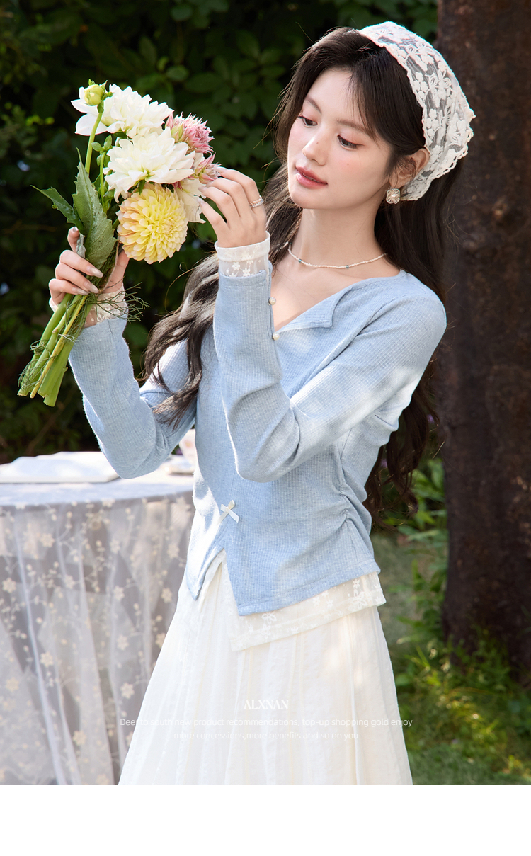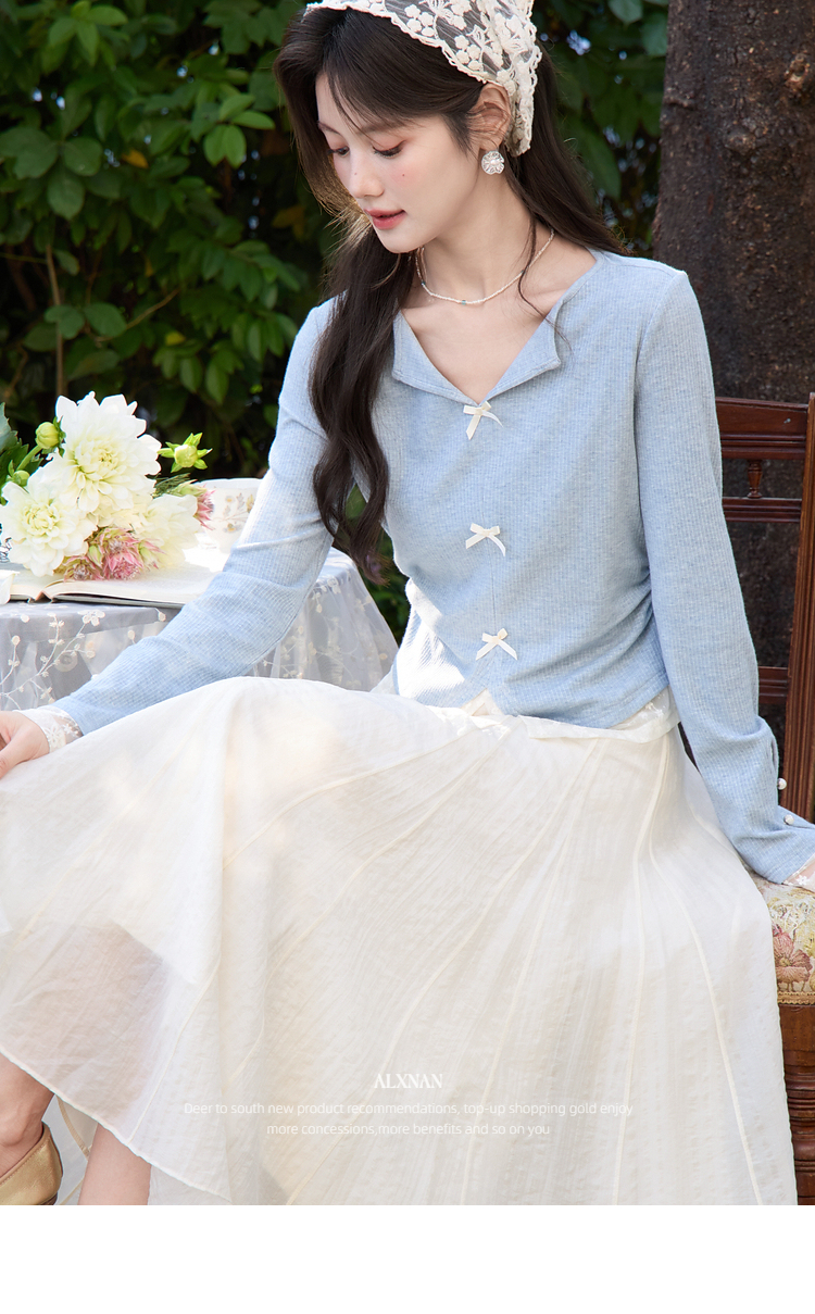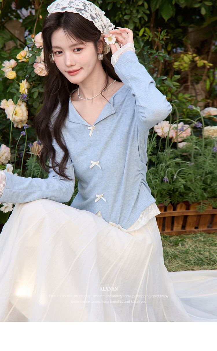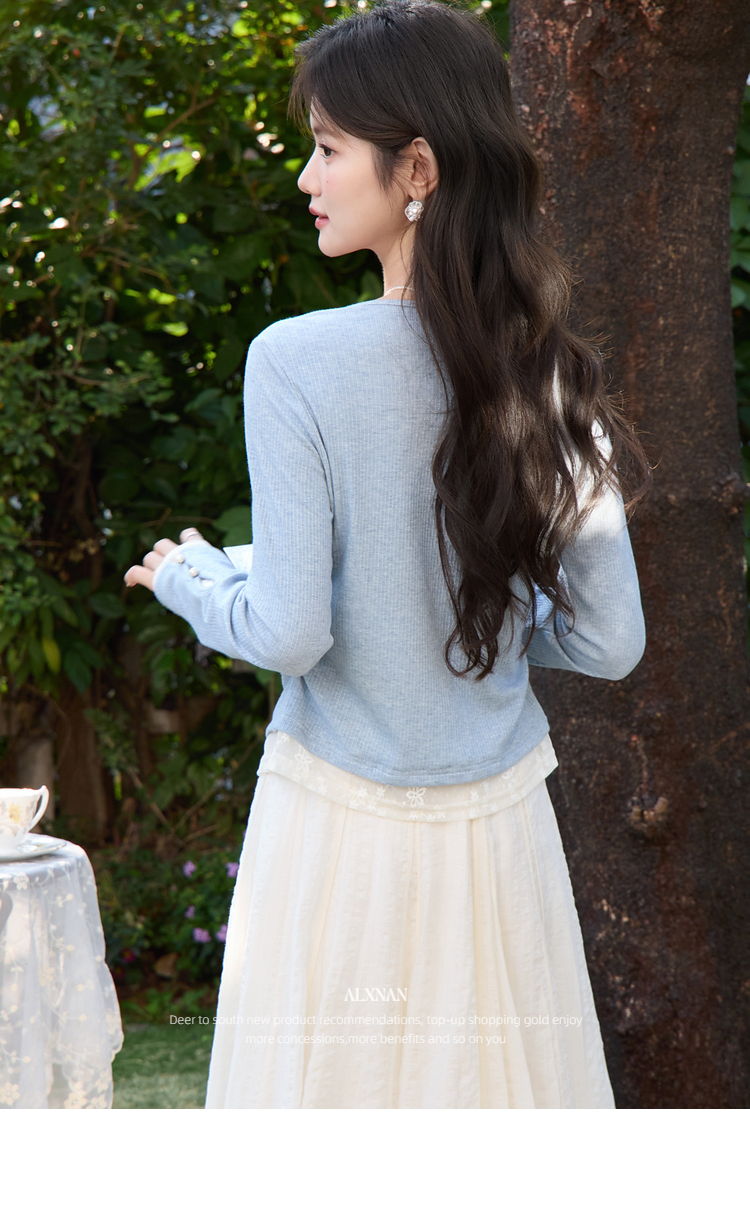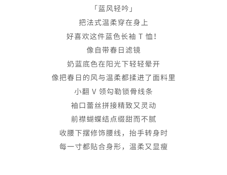 鹿向南「海盐日记」假两件蓝色长袖t恤女春轻薄收腰短款法式上衣