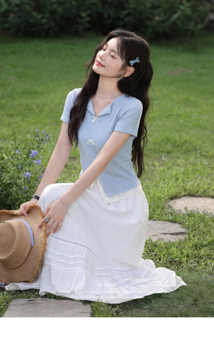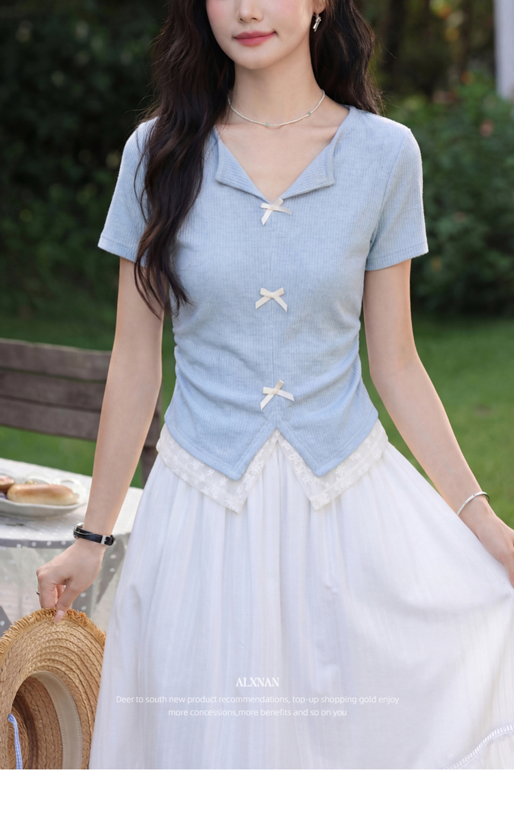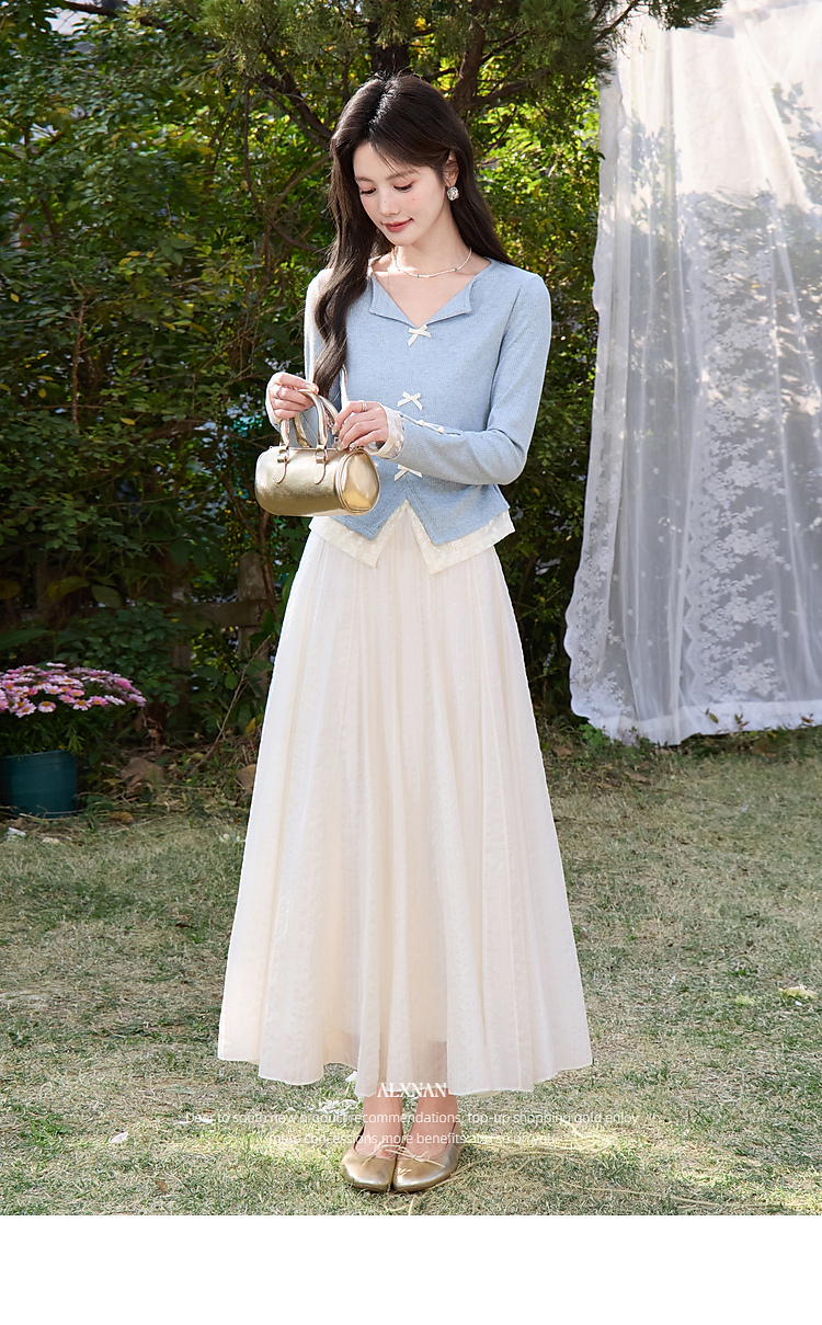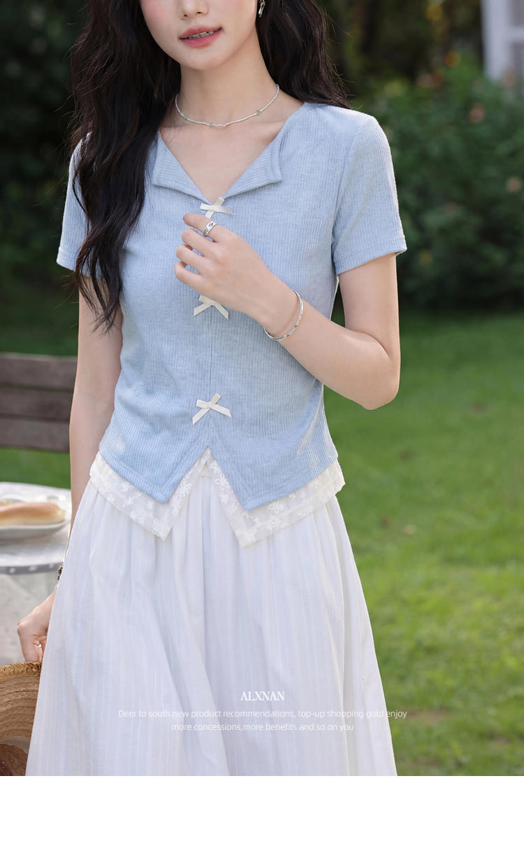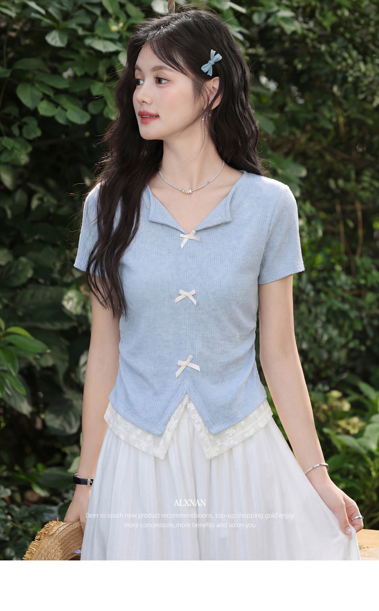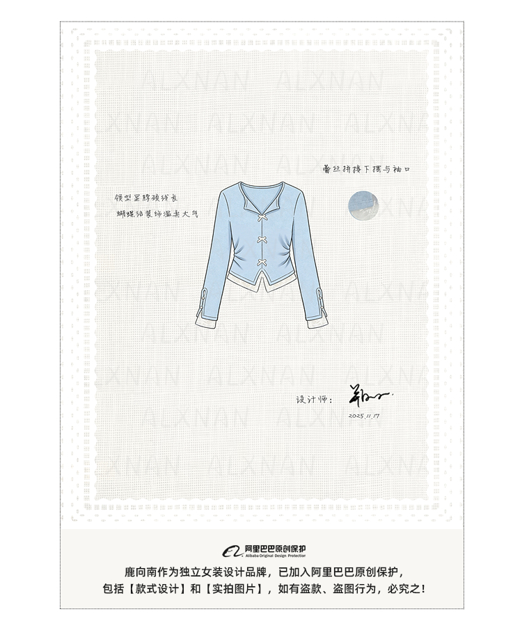 鹿向南「海盐日记」假两件蓝色长袖t恤女春轻薄收腰短款法式上衣