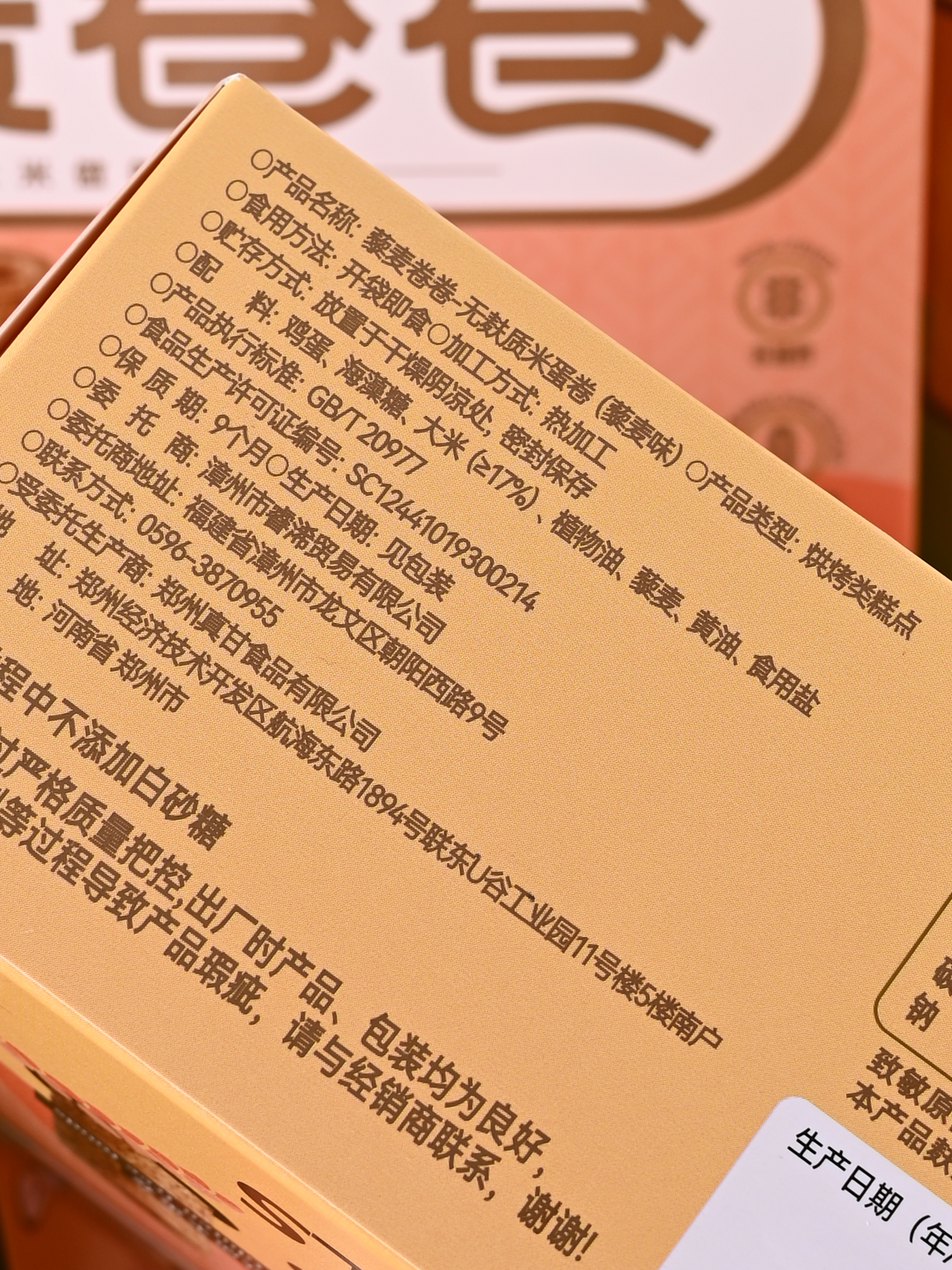 【品名】:无麸质米蛋卷(藜麦卷卷&芝士卷卷) 【产品规格】:90g(内含9条) 【保质期】:9个月 【藜麦卷卷配料表】:鸡蛋、海藻糖、大米(≥17%)、海藻糖、藜麦、黄油、食用盐 【只是卷卷配料表】:大米(≥23%)、鸡蛋、海藻糖、植物油、芝士粉、黄油、番茄酱、食用盐 【致敏物提醒】含有鸡蛋、乳及乳制品,本产品麸质成分未检出,生产过程中不添加白砂糖。 【储存方式】:存放于干燥、凉爽处,开封后请立食用。 【发货地】:福建漳州 【发货时效】:72小时内发出,中午12点前给订单 【发货快递】:中通、申通随机发不指定 【补运费地区】:北京,上海➕一元,甘肃、内蒙古、宁夏运费每件➕14元,青海、新疆、西藏运费每件➕16