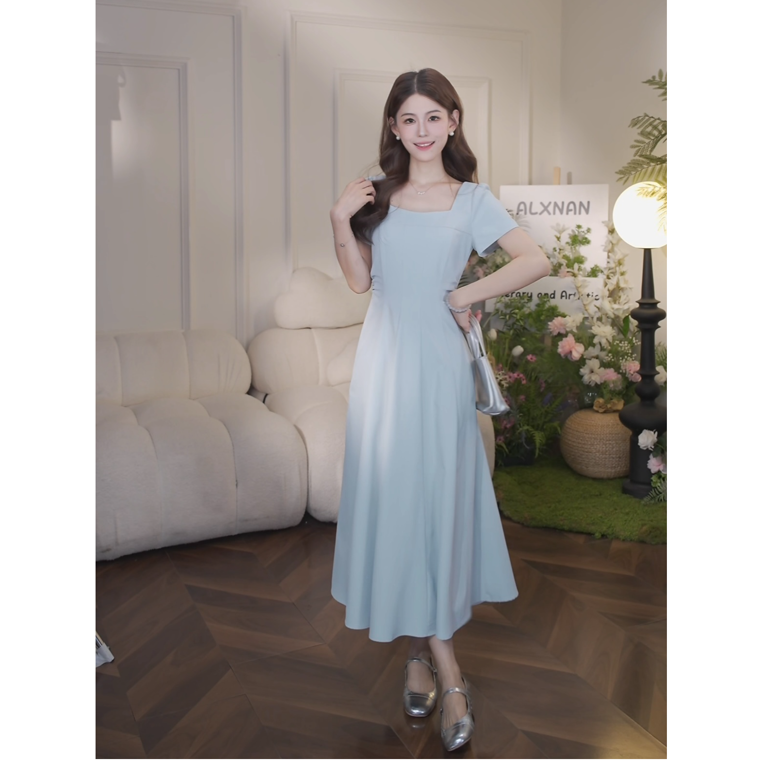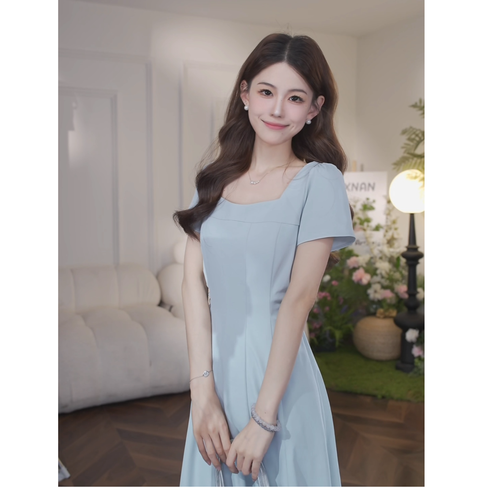 鹿向南「蓝风铃语」夏季新款法式方领气质浅蓝色短袖连衣裙长裙女