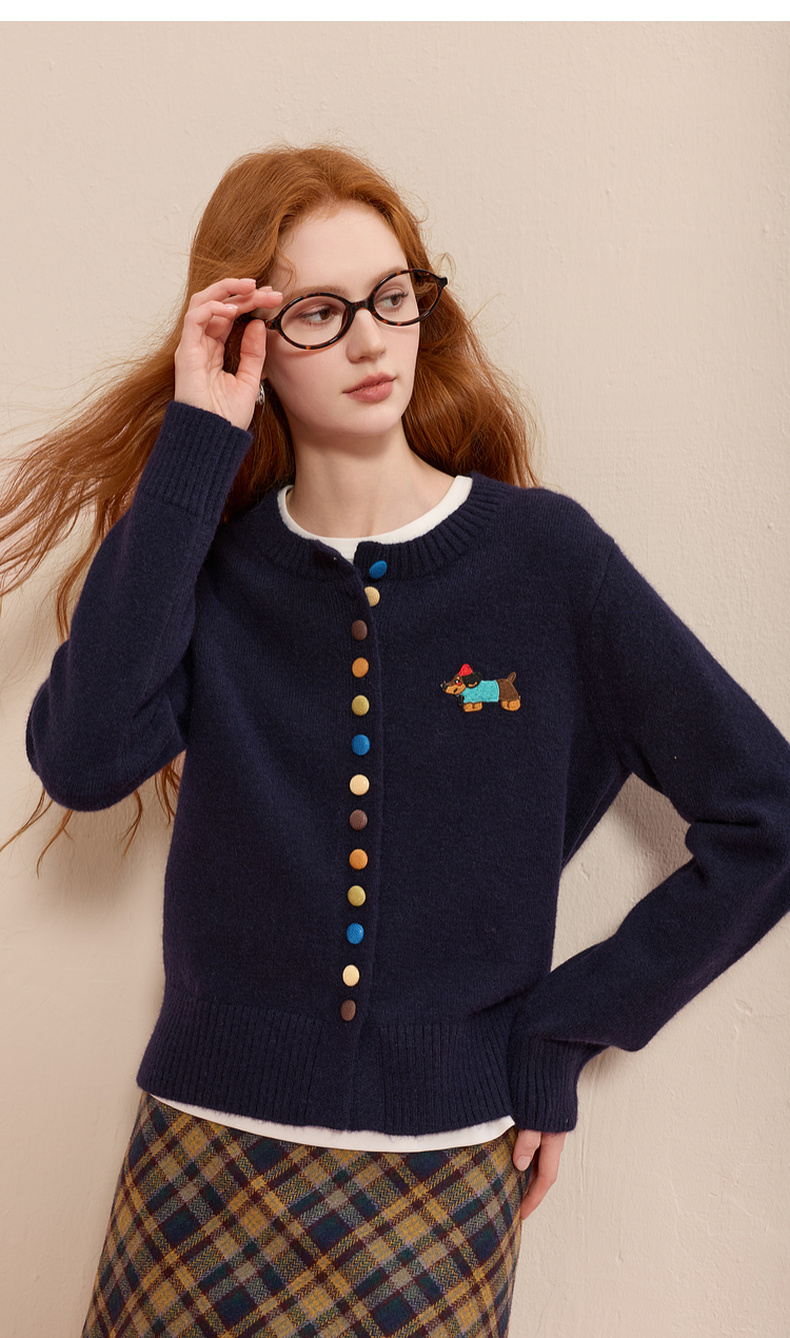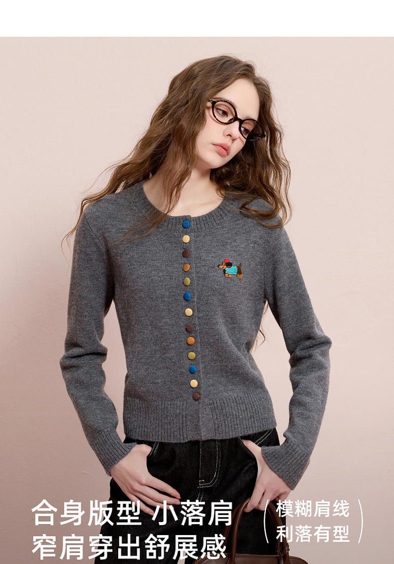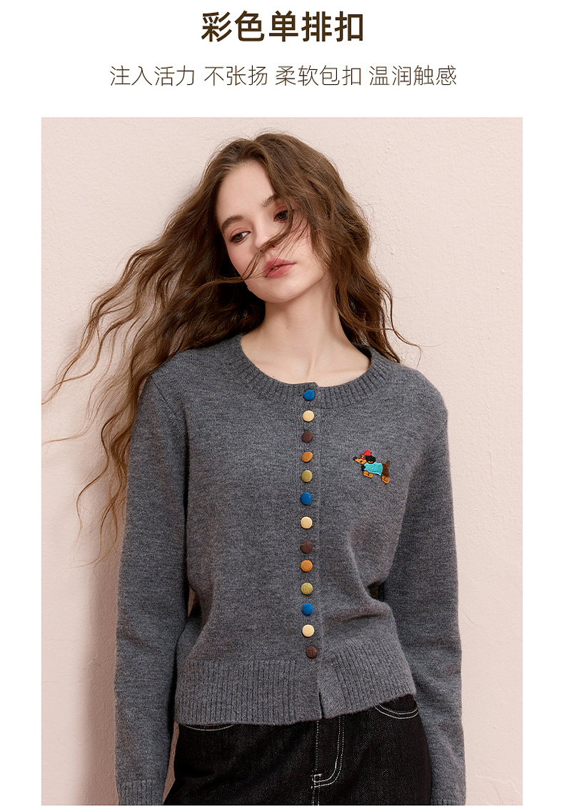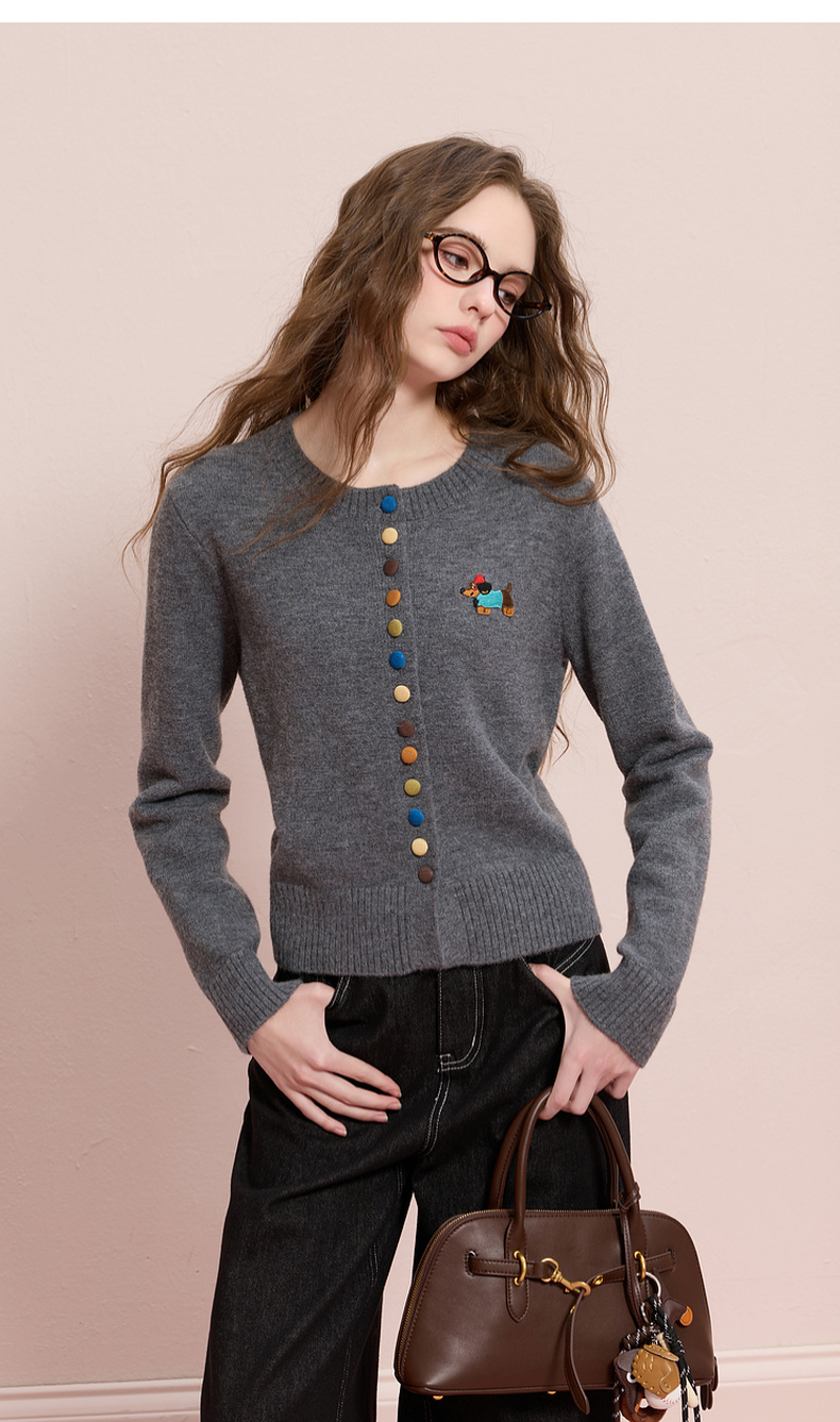 三彩2025冬季新款彩色单排扣小狗针织衫开衫外套圆领长袖百搭M