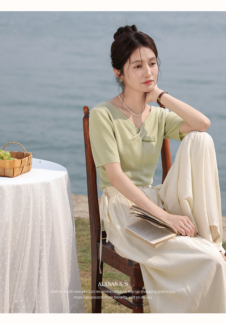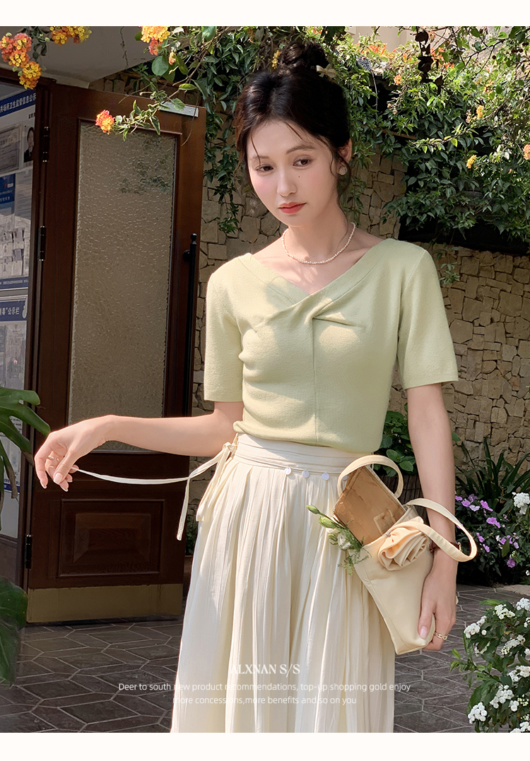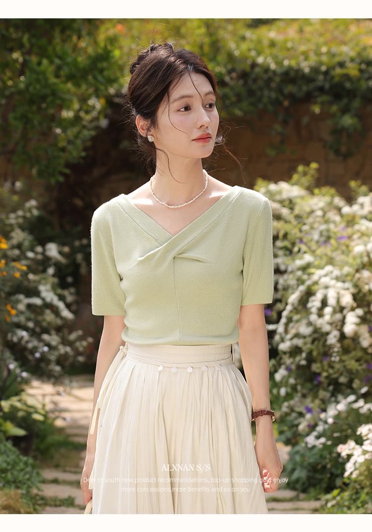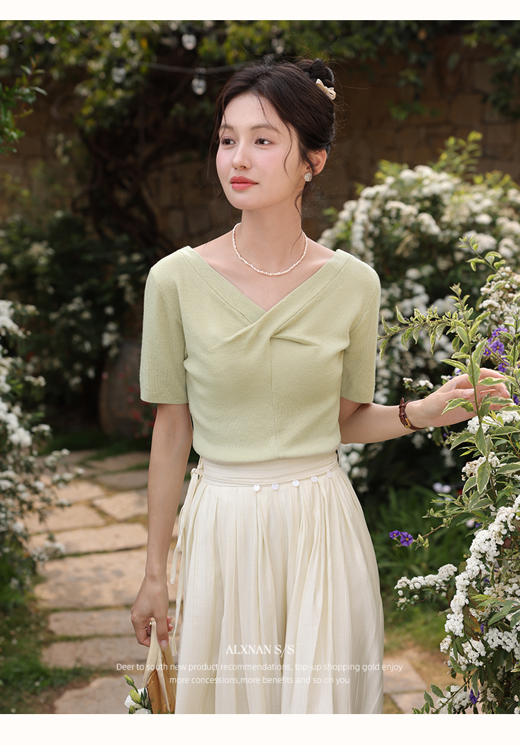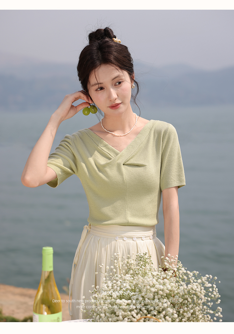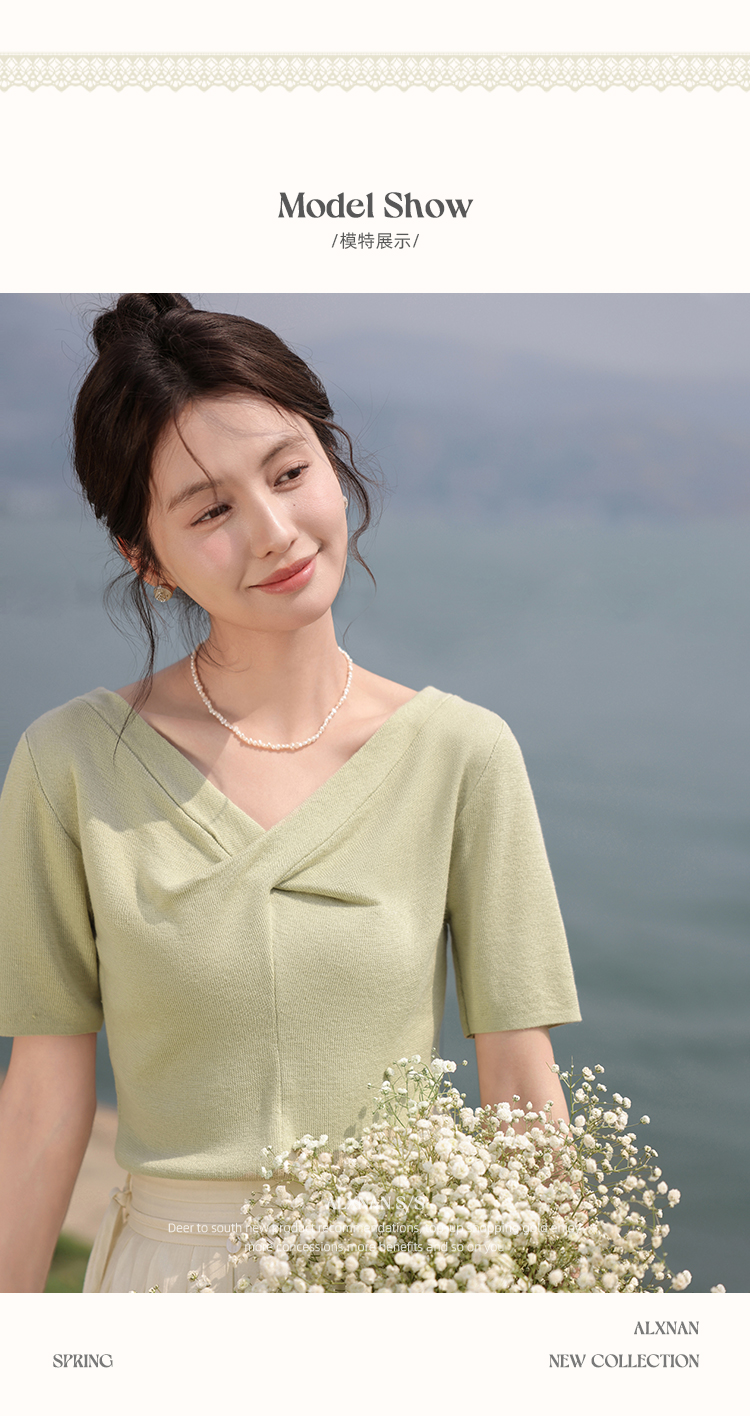 鹿向南「小乡谷米」法式时尚V领针织衫女夏季设计感短袖T恤上衣L55577