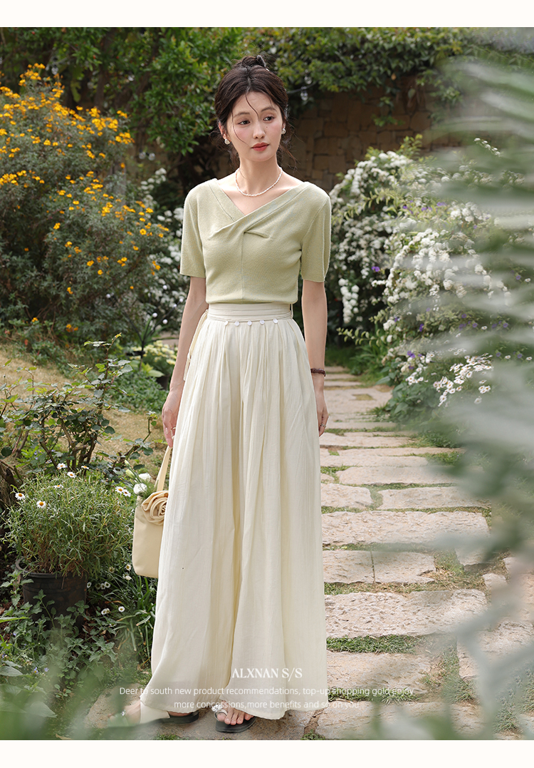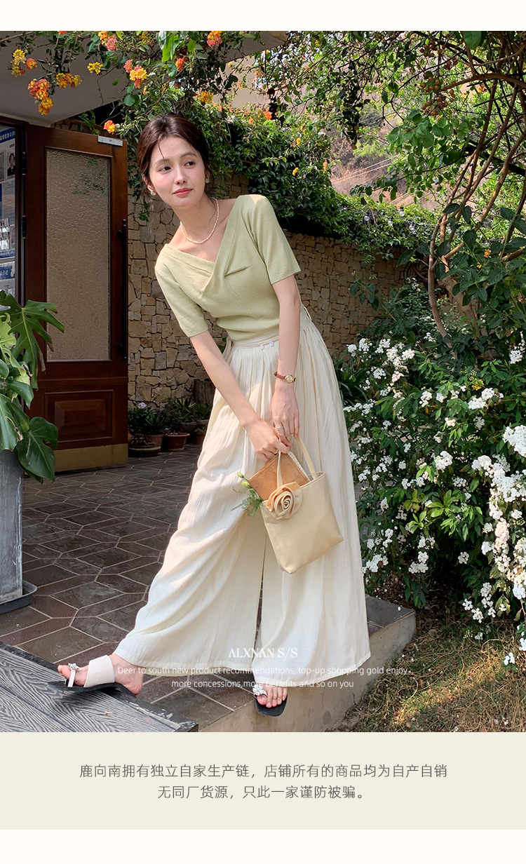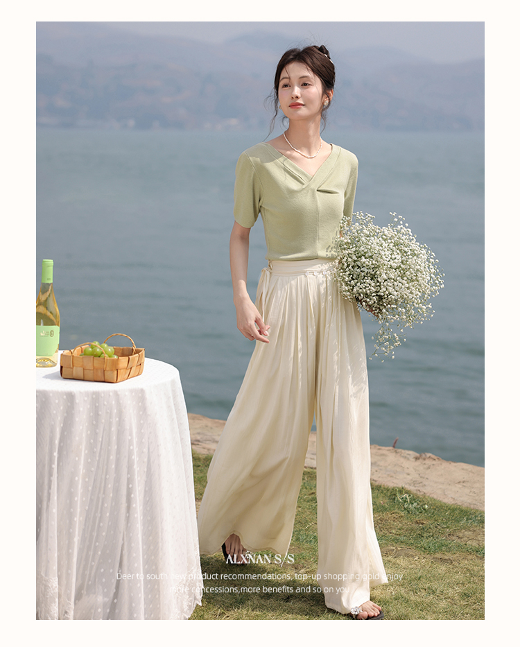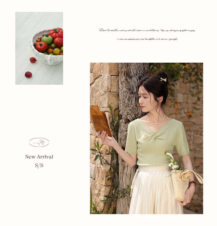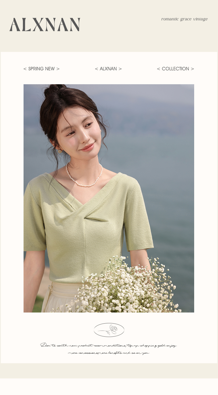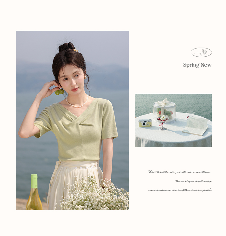 鹿向南「小乡谷米」法式时尚V领针织衫女夏季设计感短袖T恤上衣L55577