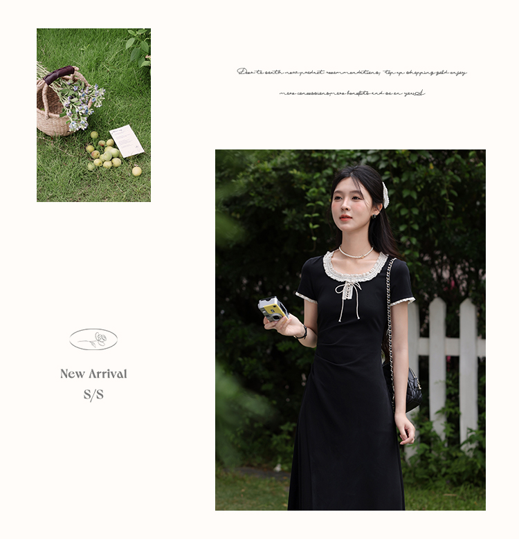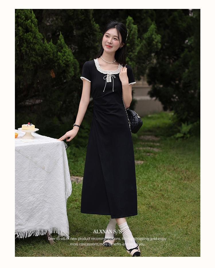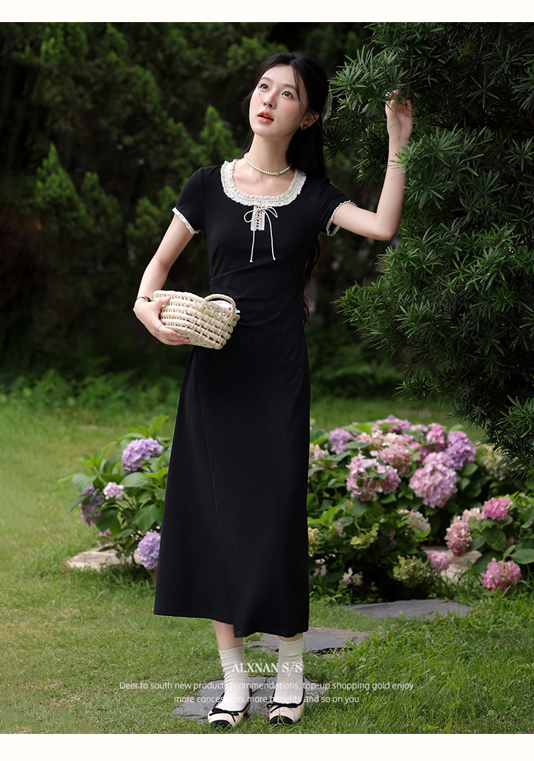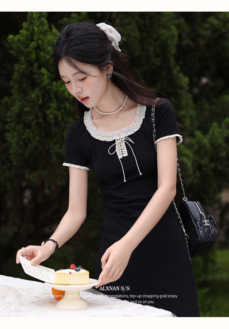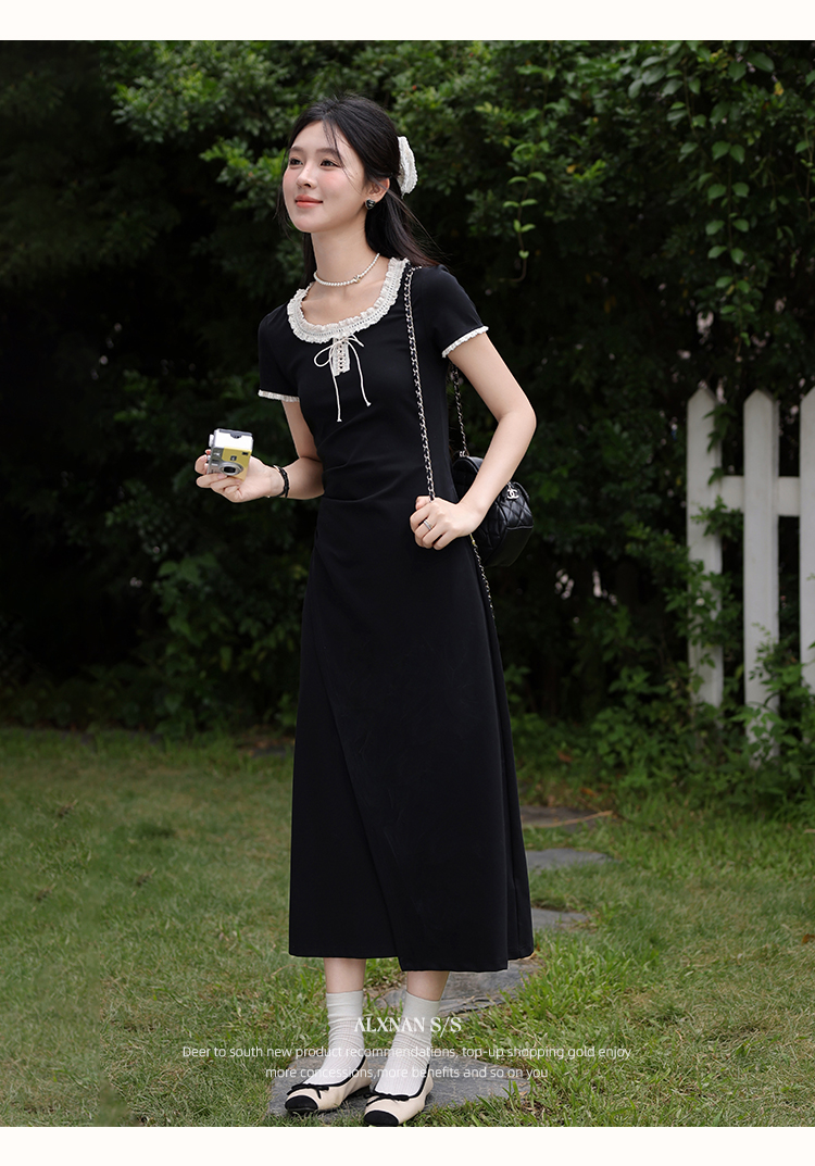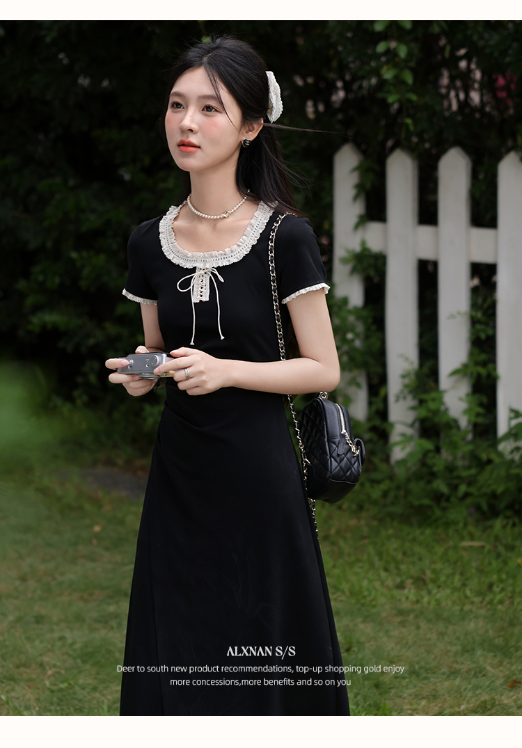 鹿向南「星月夜港」法式U领黑色短袖连衣裙女夏撞色系带A字长裙