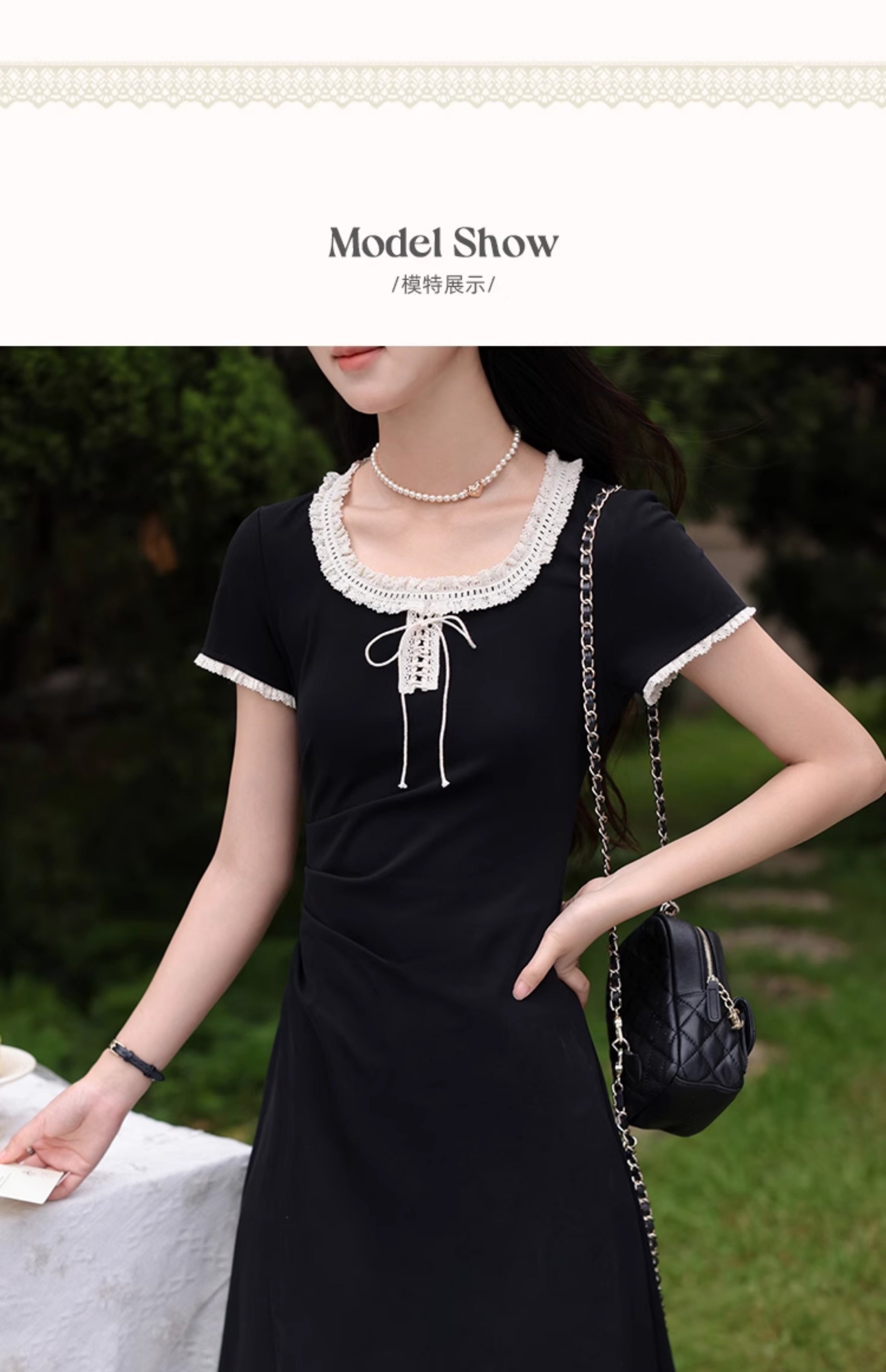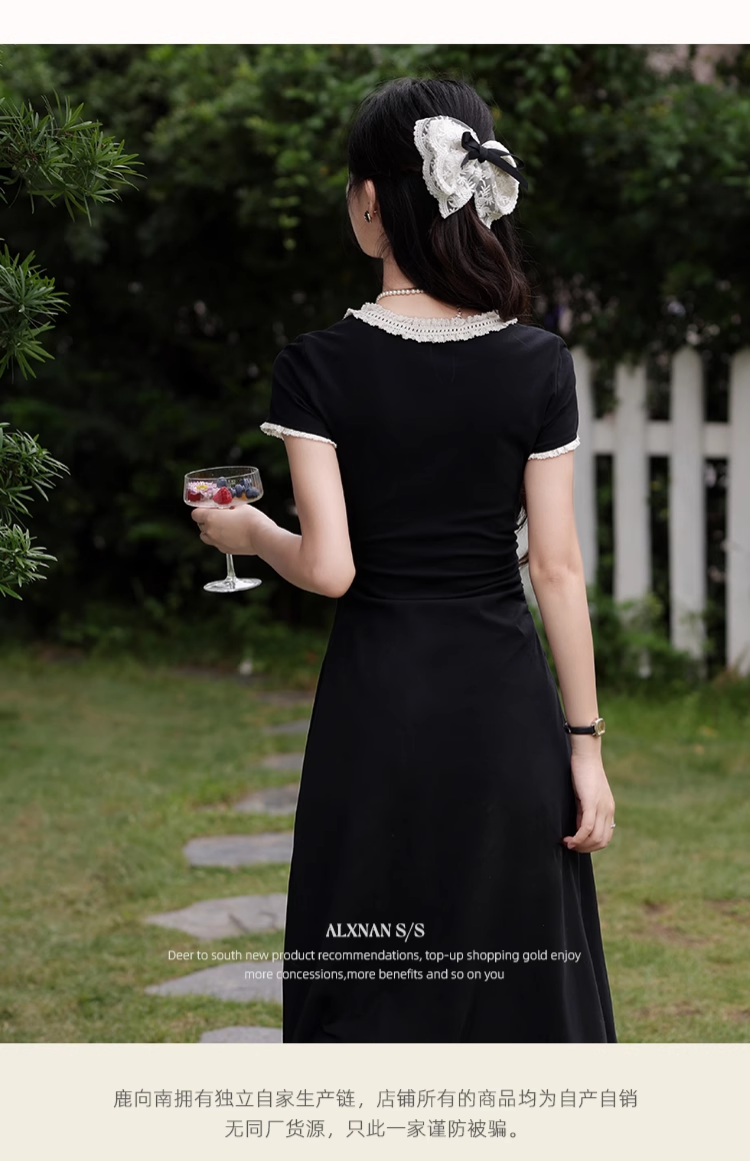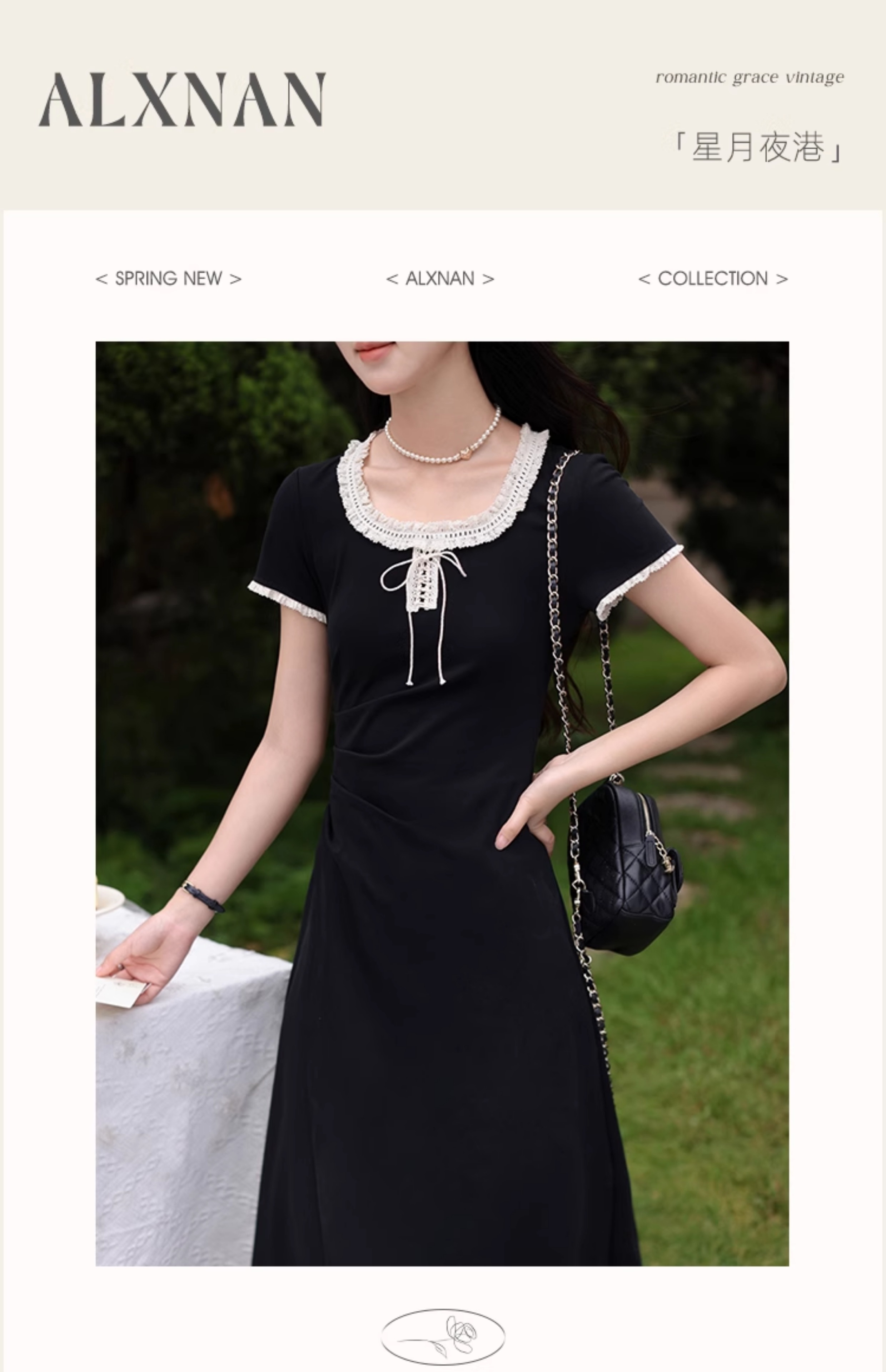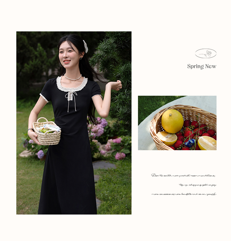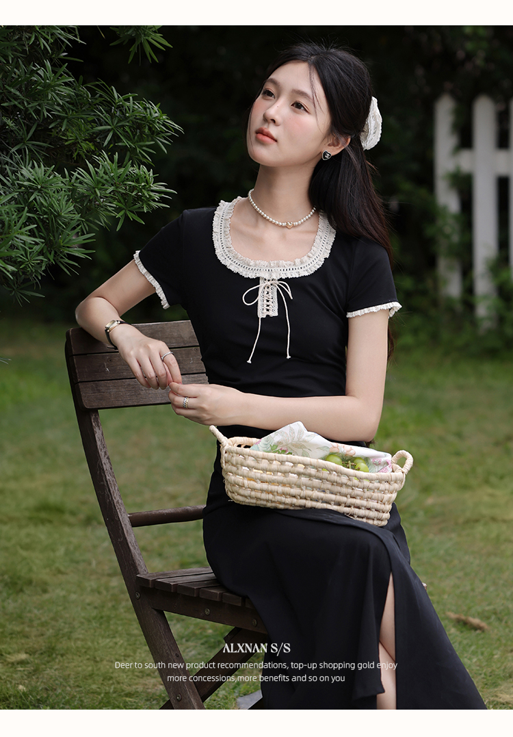 鹿向南「星月夜港」法式U领黑色短袖连衣裙女夏撞色系带A字长裙
