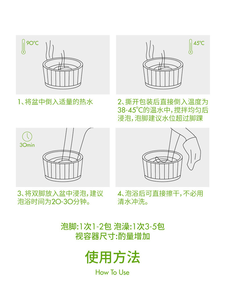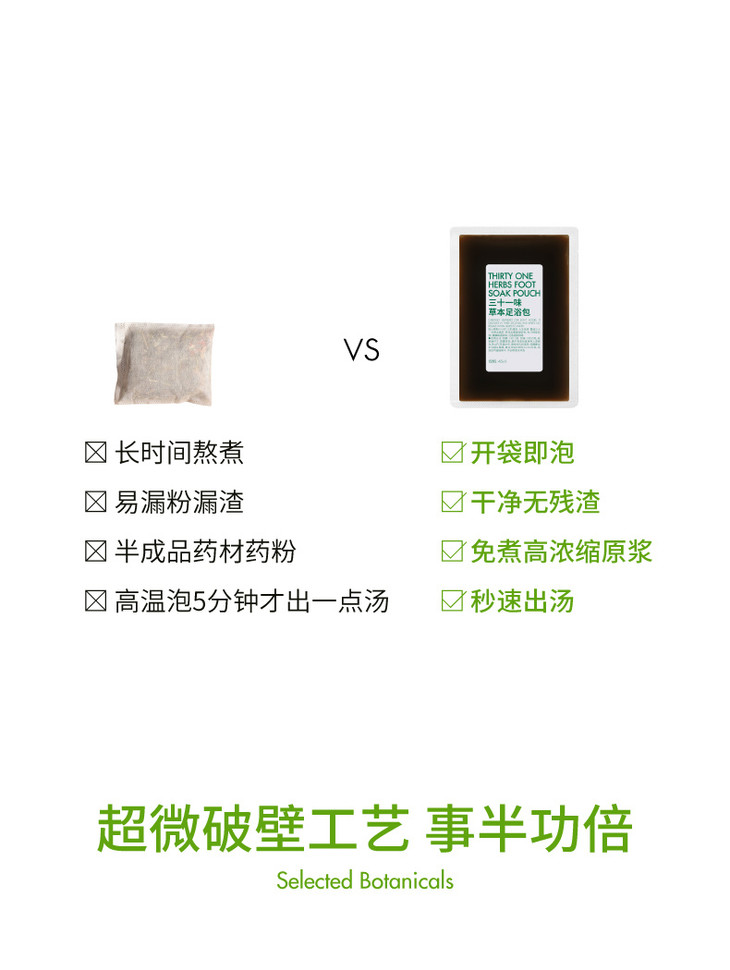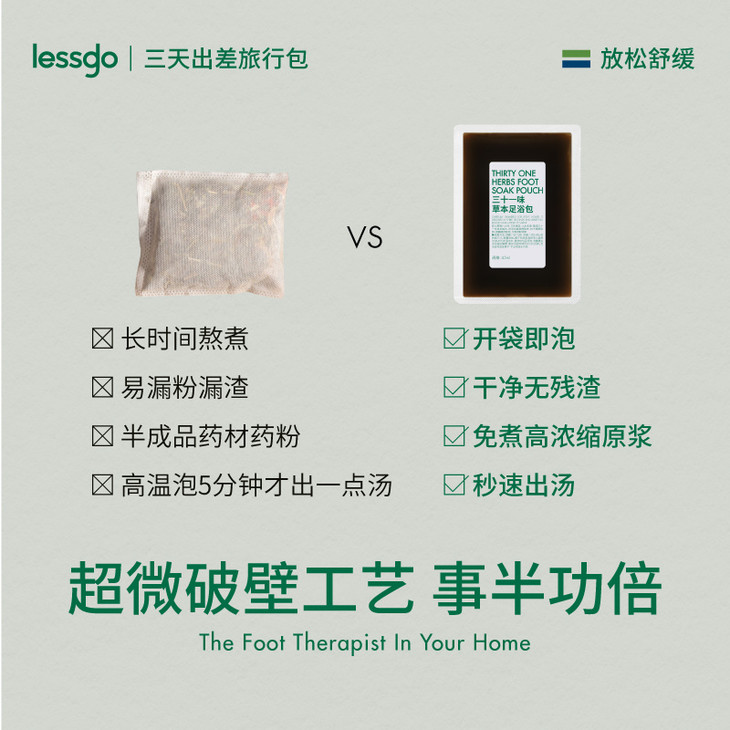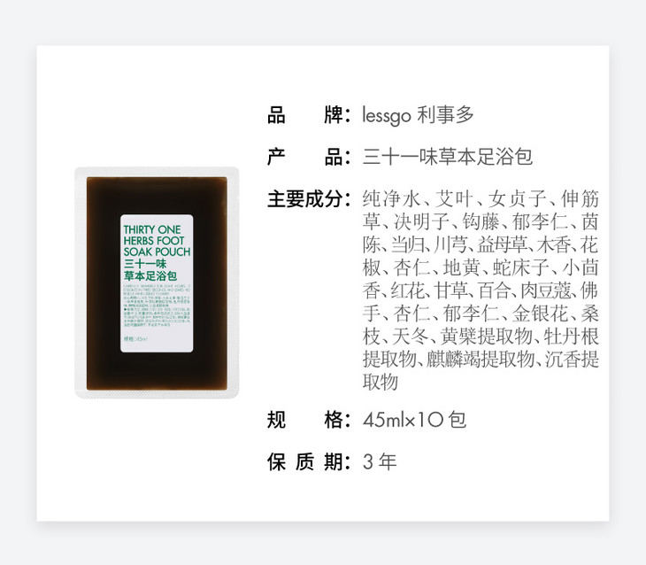 【品牌】lessgo利事多 【产品名称】三十一味草本足浴包 【规格】45ml*10包 【产地】河南 【市场零售价格】19.9 【生产日期】以收到实物为准 【保质期】3年 【成分】纯净水、艾叶、女贞子、伸筋草、决明子、钩藤、郁李仁、茵陈、当归、川芎、益母草、木香、花椒、杏仁、地黄、蛇床子、小茴香、红花、甘草、百合、肉豆蔻、佛手、杏仁、郁李仁、金银花、桑枝、天冬、黄檗提取物、牡丹根提取物、麒麟竭提取物、沉香提取物 【使用说明】泡脚:1次1-2包;泡澡:1次3-5包。视容器尺寸,酌量增加。 撕开包装后直接倒入温度为38-45°C的温水中,搅拌均匀后浸泡,泡脚建议水位超过脚踝,建议泡浴时间为20-30分钟。泡浴后可直接擦干,不必用清水冲洗。 【注意事项】本品只可外用,禁止内服;开放性损伤禁用,孕妇心脏病者慎用。本品为居家日用品,不代替任何药物和医疗器械使用。 【适用范围】手脚冰冷、失眠熬夜、工作乏累、排毒养颜、排湿散寒 【保存方法】常温保存,避免高温及阳光直射。 【发货时间】48小时内发货 ,节假日周末72小时 【发货物流】申通 【发货地】上海/义乌 【偏远地区】海南、甘肃、青海、内蒙、宁夏+运费12元 【不发货地区】新疆,西藏不发货 【售后注意】 1、拆封使用后,不支持七天无理由退货。 2、如有质量问题等情况,务必在签收24小时内申请售后,提报售后请提供快递面单图,产品问题图 3、所有的售后都基于提供照片或视频为凭证,未提供凭证或超过售后时效,不予处理,请理解!