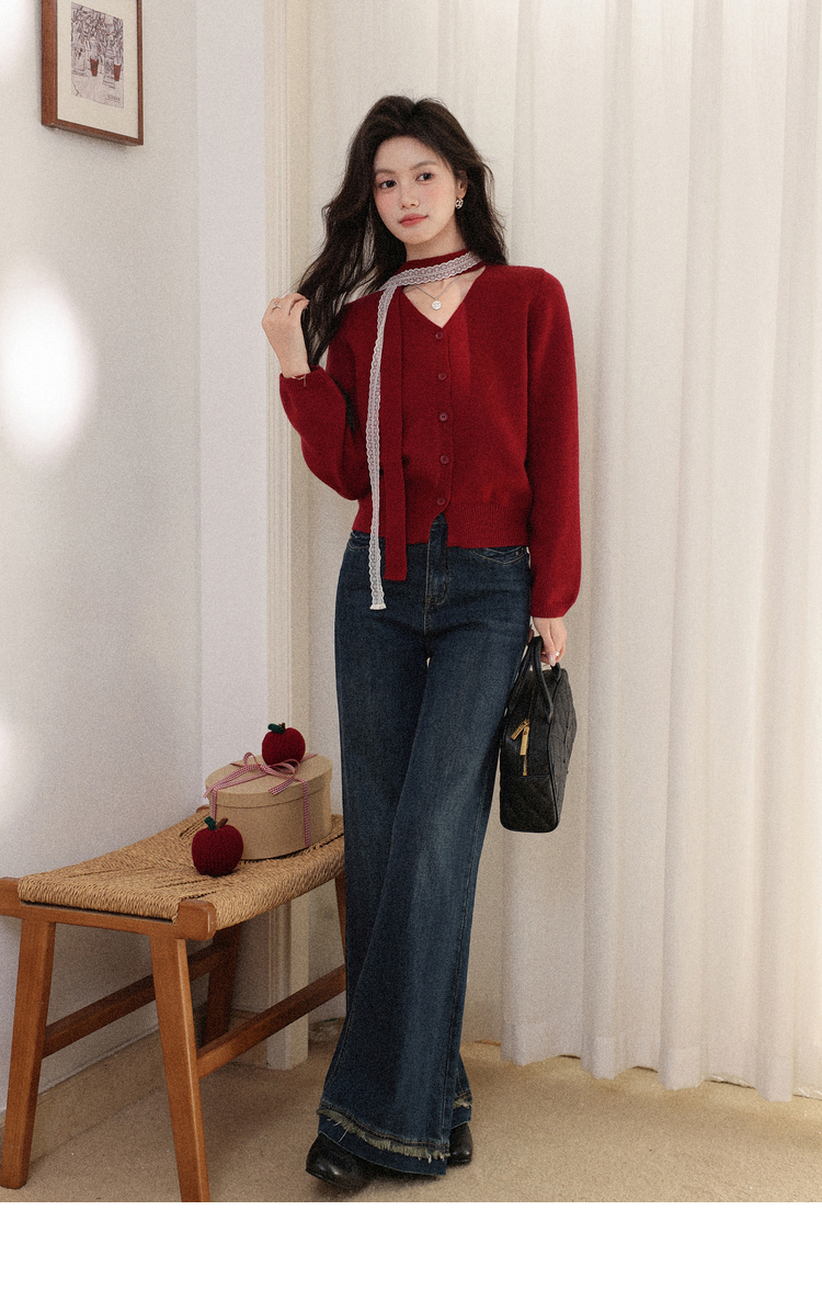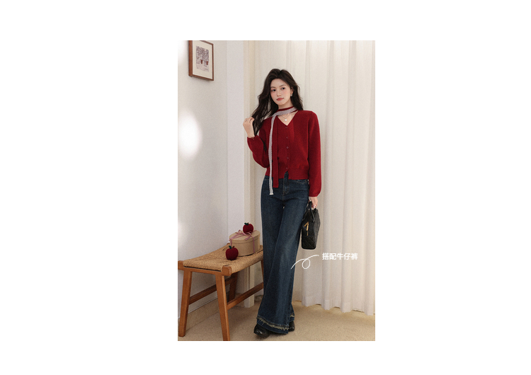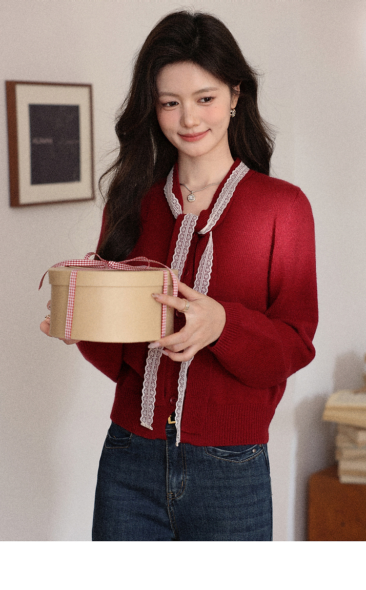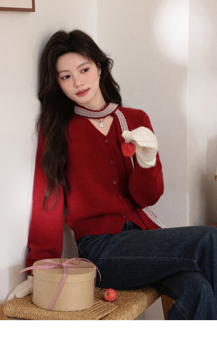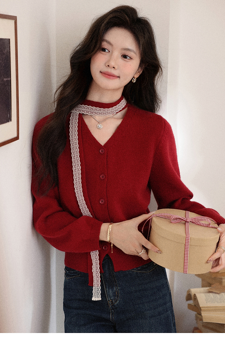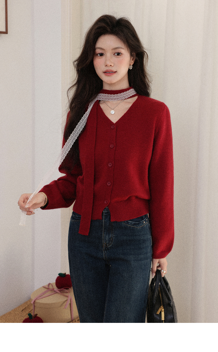 鹿向南「冰雪玫瑰」复古红色毛衣女秋冬高级感气质优雅针织衫上衣