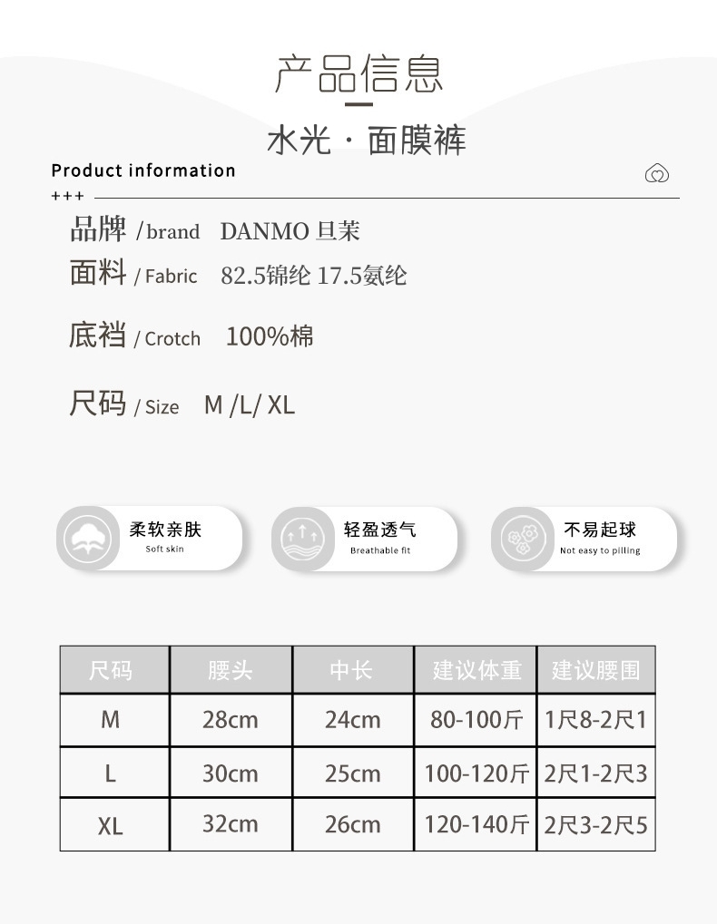 品牌:旦茉 品名:水光·面膜裤 规格:6条装【浅粉+浅咖+肤色+浅绿+浅紫+黑色】 产地及发货地:广东 发货时间:下单一般48小时内发货(周末、节假日除外) 发货快递:韵达快递 运费模板:该商品全国部分地区包邮(内蒙古需补差运费10元 /件,新疆,西藏,港澳台不发货,请知悉) 售后政策:内衣属于贴身衣物,为了您和他人的健康,非质量问题不退不换,请知悉 |