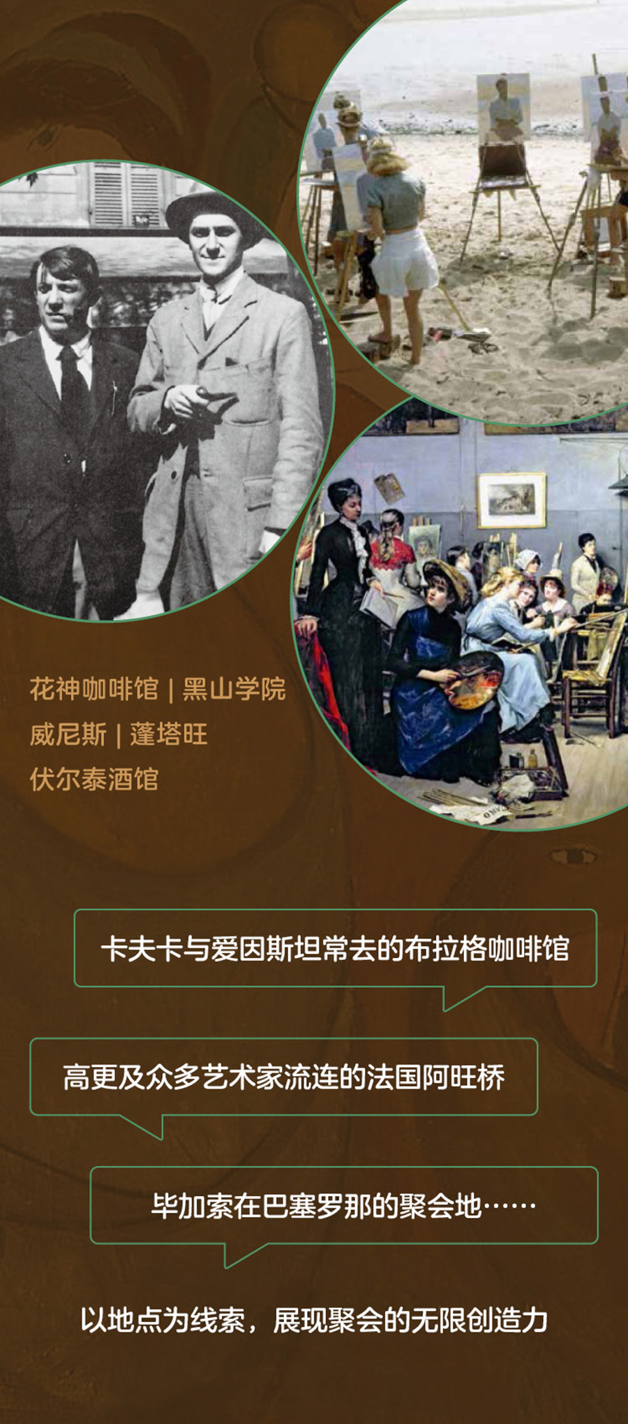 十九世纪末至二十世纪中期,现代主义热潮兴起。从城市街道、自然村落到海岸岛屿,从私人住宅到公共咖啡馆,知名艺术聚集地及聚会场所激发了无数艺术家的创造力。