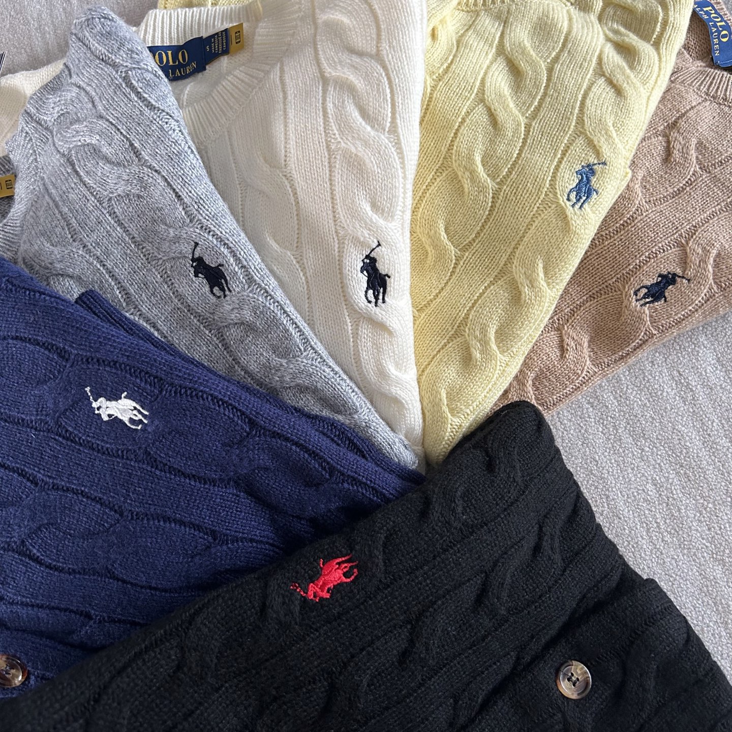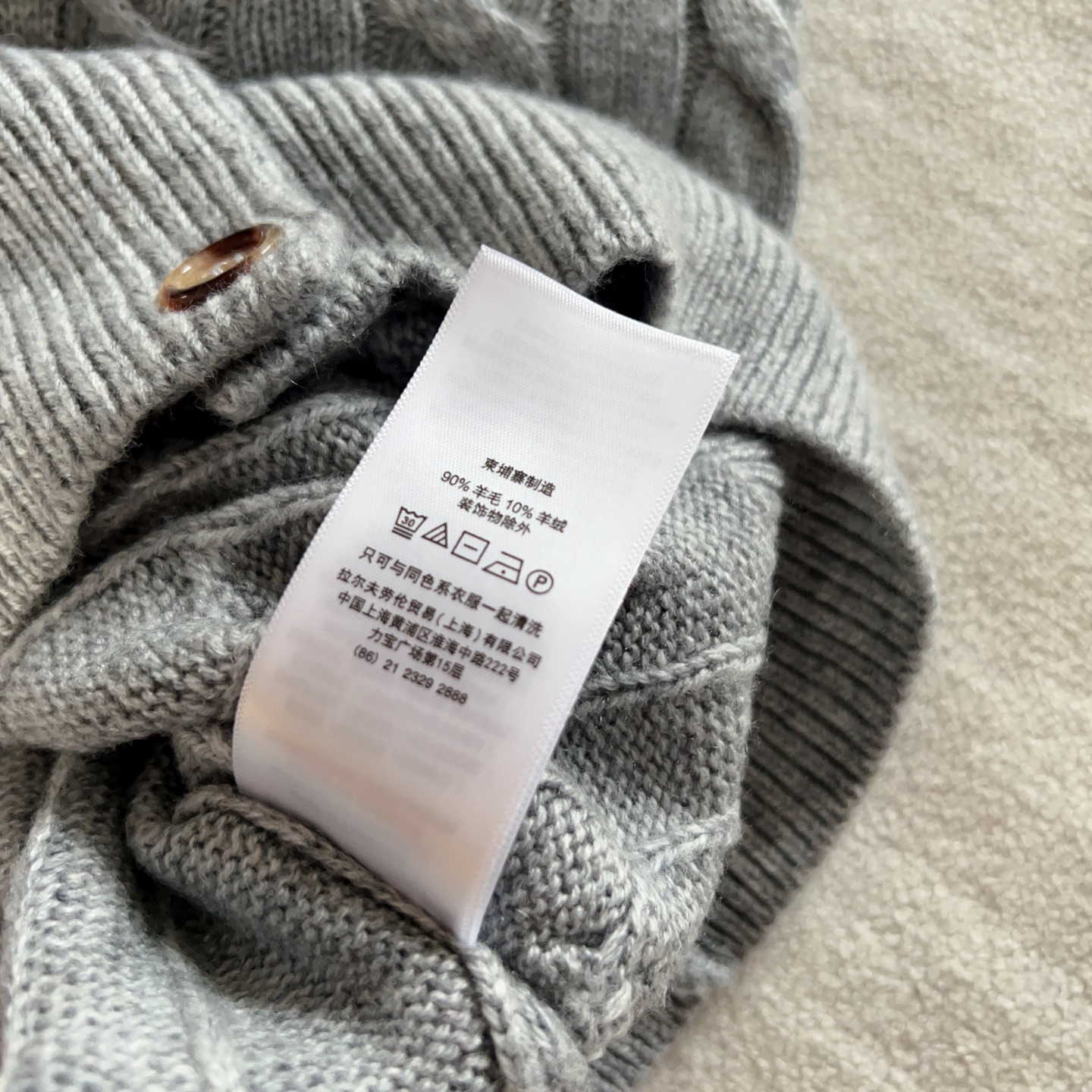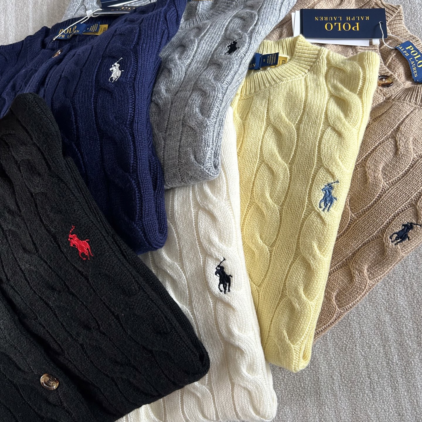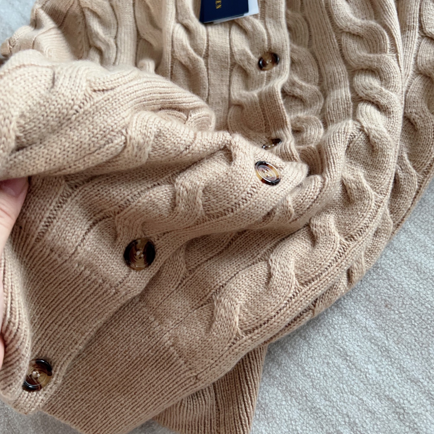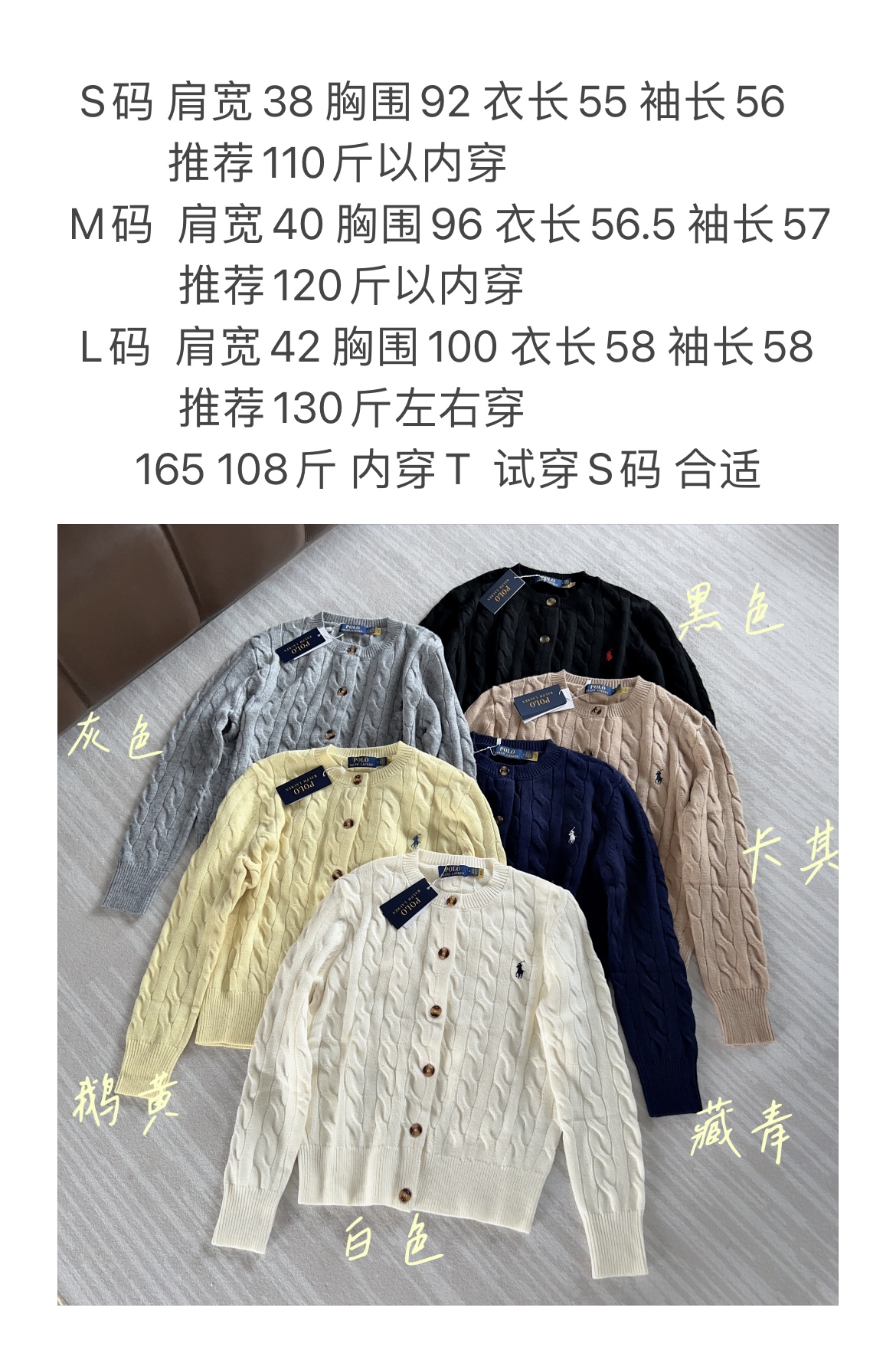 上新 ❤️ RL Polo 绞花编结针织羊毛开衫 羊毛混纺面料 蓬松柔软,保暖亲肤舒适,版型常规偏大一点,腰身与肩线利落贴合,袖长会偏长一点但不影响,袖口有做收紧,绞花纹理纵向延伸,视觉上显瘦显薄,轻松隐藏腰腹赘肉,无论什么身材都能穿出优雅曲线。 左胸经典小🐎标采用精密刺绣工艺,绣工精湛,彰显品牌身份,低调又不失格调 。天然牛角扣开襟,延续品牌经典设计,质感十足,开合顺滑,基础百搭,强烈推荐 包装吊牌齐全 亲人自留都合适。 6️⃣色可选 黑色藏青白色卡其 灰色 鹅黄 码数 S M L