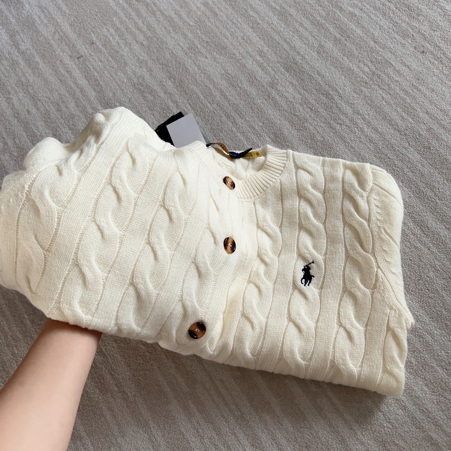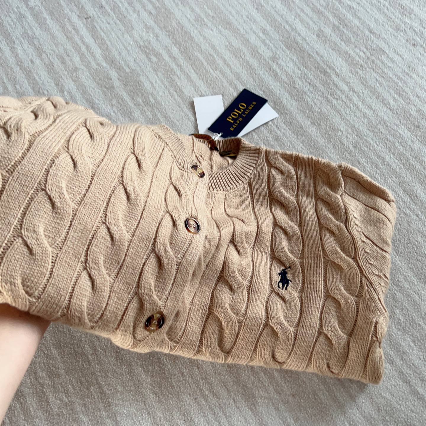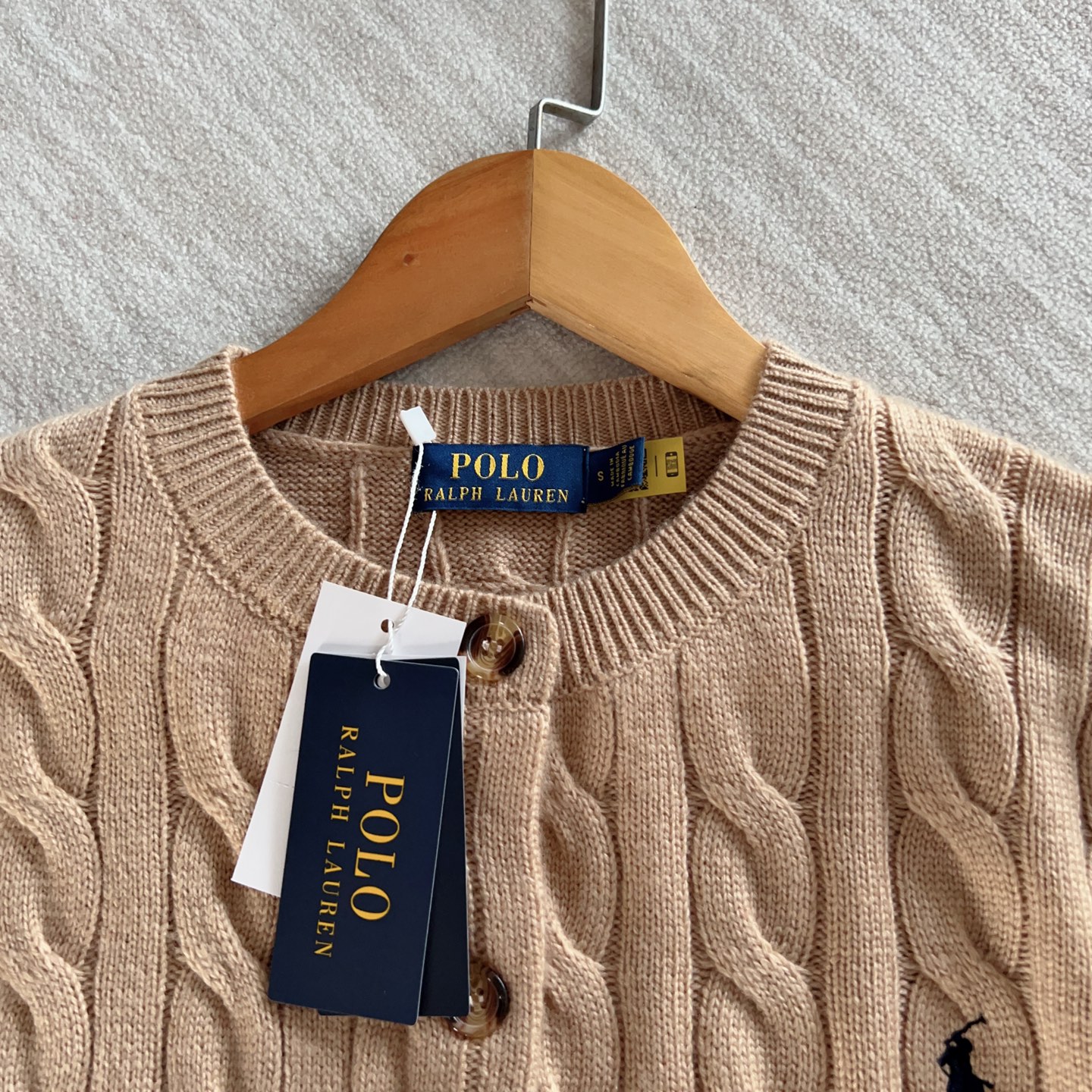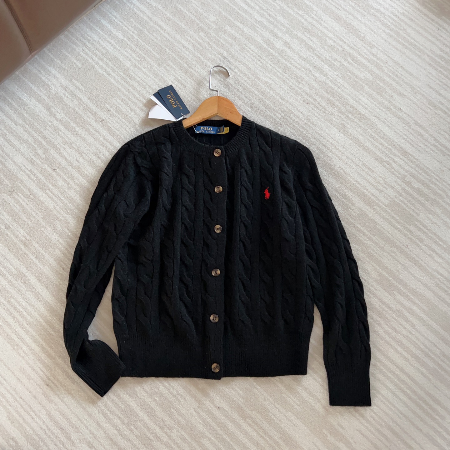 上新 ❤️ RL Polo 绞花编结针织羊毛开衫 羊毛混纺面料 蓬松柔软,保暖亲肤舒适,版型常规偏大一点,腰身与肩线利落贴合,袖长会偏长一点但不影响,袖口有做收紧,绞花纹理纵向延伸,视觉上显瘦显薄,轻松隐藏腰腹赘肉,无论什么身材都能穿出优雅曲线。 左胸经典小🐎标采用精密刺绣工艺,绣工精湛,彰显品牌身份,低调又不失格调 。天然牛角扣开襟,延续品牌经典设计,质感十足,开合顺滑,基础百搭,强烈推荐 包装吊牌齐全 亲人自留都合适。 6️⃣色可选 黑色藏青白色卡其 灰色 鹅黄 码数 S M L