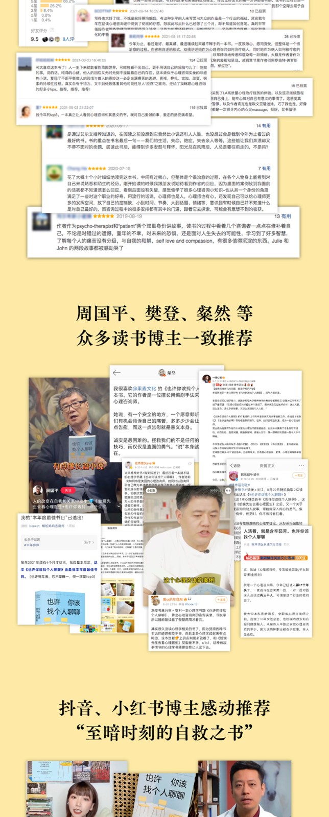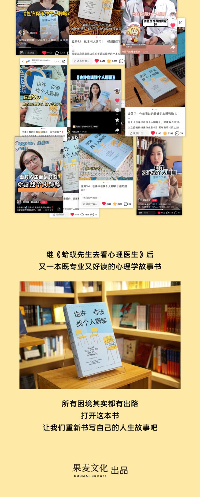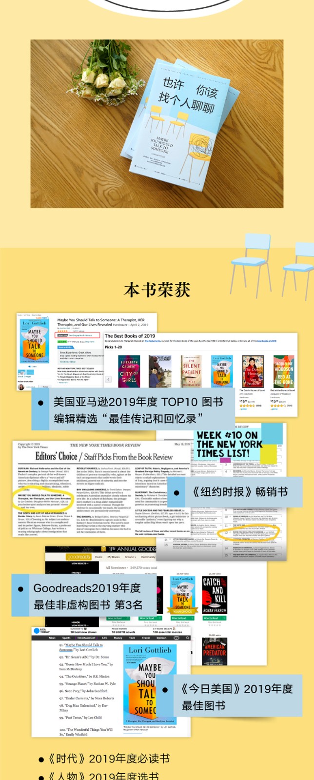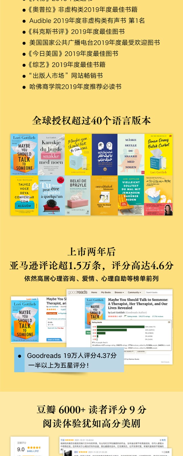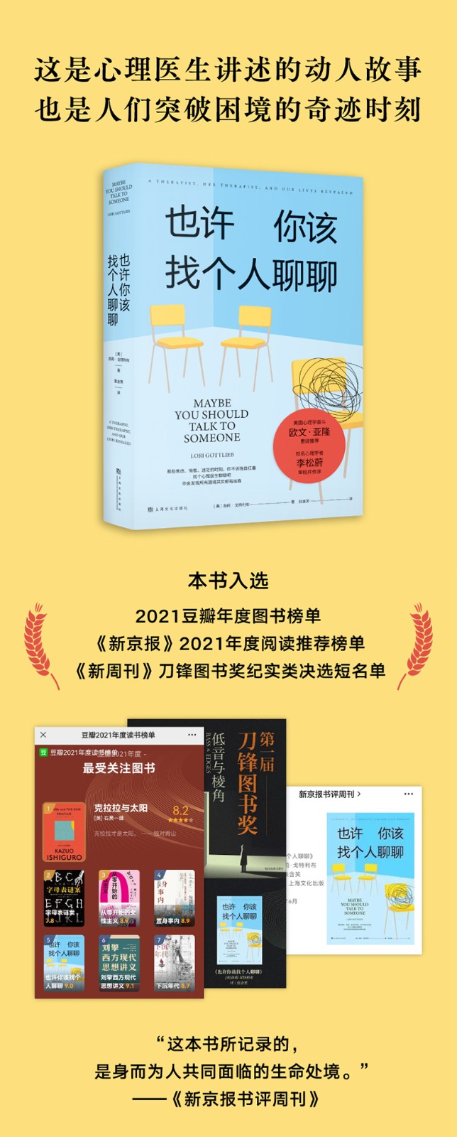 本书是2019年美国众多媒体推荐的心理自助书——它荣登《纽约时报》《时代》《人物》《综艺》等媒体年度必读书榜单,是美国亚马逊当年度销售TOP十图书、哈佛商学院年度推荐图书,它的有声书版本也是当年Audible非虚构类有声书***。 刚上市一个月,这本书就冲上了美国亚马逊图书总榜;出版两年来,已经在全球授权了四十多个语言版本,总销量超过七十万册,并且正在拍摄电视连续剧,由曾出演《绝望主妇》的知名演员伊娃·朗格利亚担纲主演。 享誉全球的心理学泰斗、美国斯坦福大学精神病学终身荣誉教授欧文·亚隆为这本书写下推荐语:“我读心理治疗的书超过半个世纪了,但从来没见过这样的书:这么大胆、这么直白、这么多好故事,又这么深刻而引人入胜。” 国内知名心理学家李松蔚为这本书担任专业审校,并写下推荐序:“读这本书的过程,就是在灵魂的方寸之地一寸寸探索。越往下,越是晦暗幽深,于无声处听惊雷。” 本书作者洛莉·戈特利布曾在好莱坞从事编剧工作,参加过《老友记》《急诊室的故事》等知名剧集的制作,后来改变职业轨道,成为一名心理治疗师。她出色的故事写作技巧与丰富的心理治疗经验相结合,让这本书兼具了专业性和可读性,机锋处处、温柔风趣,既幽默犀利,更催人泪下,像一部精彩的美剧一般令人手不释卷。阅读这本书,人们可以深刻地理解心理治疗的意义,更能体会到一个简单而深刻的真理——你以为自己被困住了,但其实你是有可能做出改变的。 关于写作和阅读这本书的意义,作者是这样对我们说的: “作为一个治疗师,在治疗的间隙痛哭流涕,睫毛膏沿着泪痕淌过脸颊,这画面或许令人难以接受,但这就是故事的起点。在这个故事里,你将遇见一小撮正在苦苦挣扎的人类,这群人将和自己生而为人的本性展开艰苦卓绝的斗争,我自己也不例外。”“我希望人们面对生活中的挣扎时,不必感到寂寞。我希望大家读完本书之后,对自己、对他人都能多一点慈悲。”