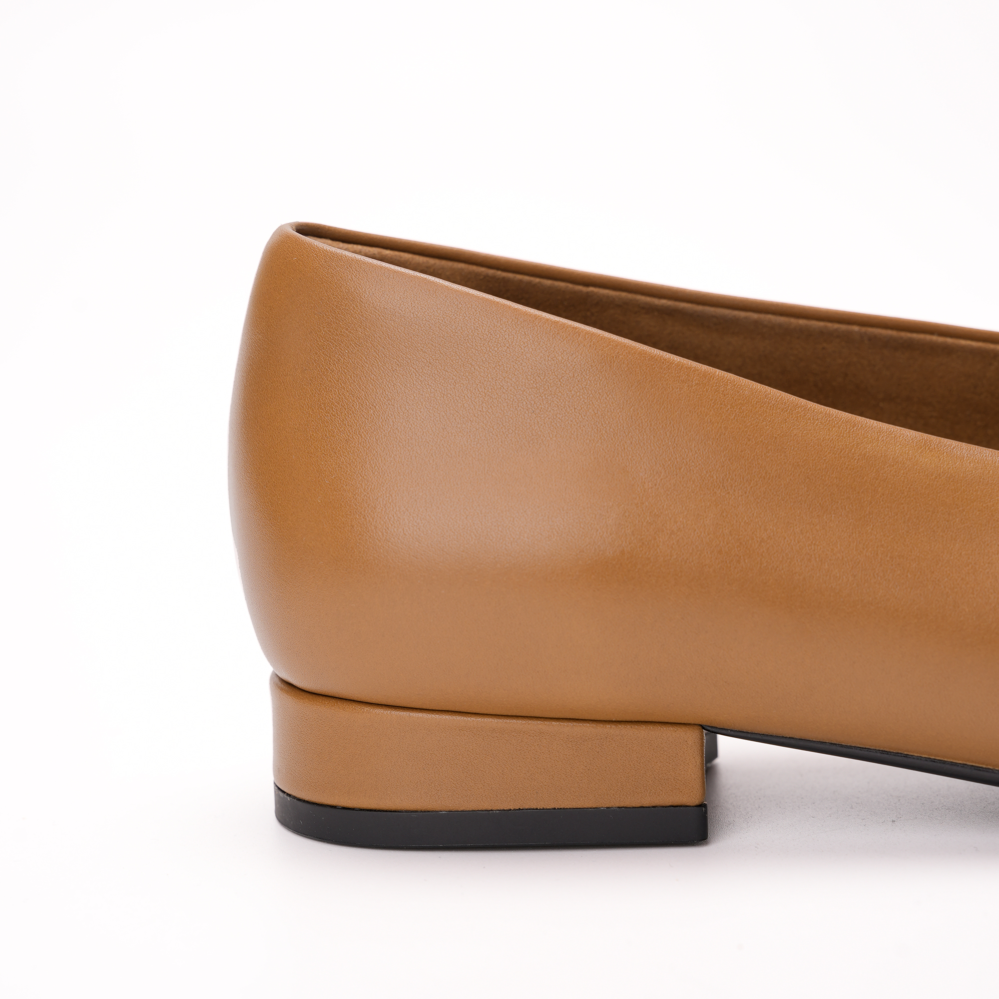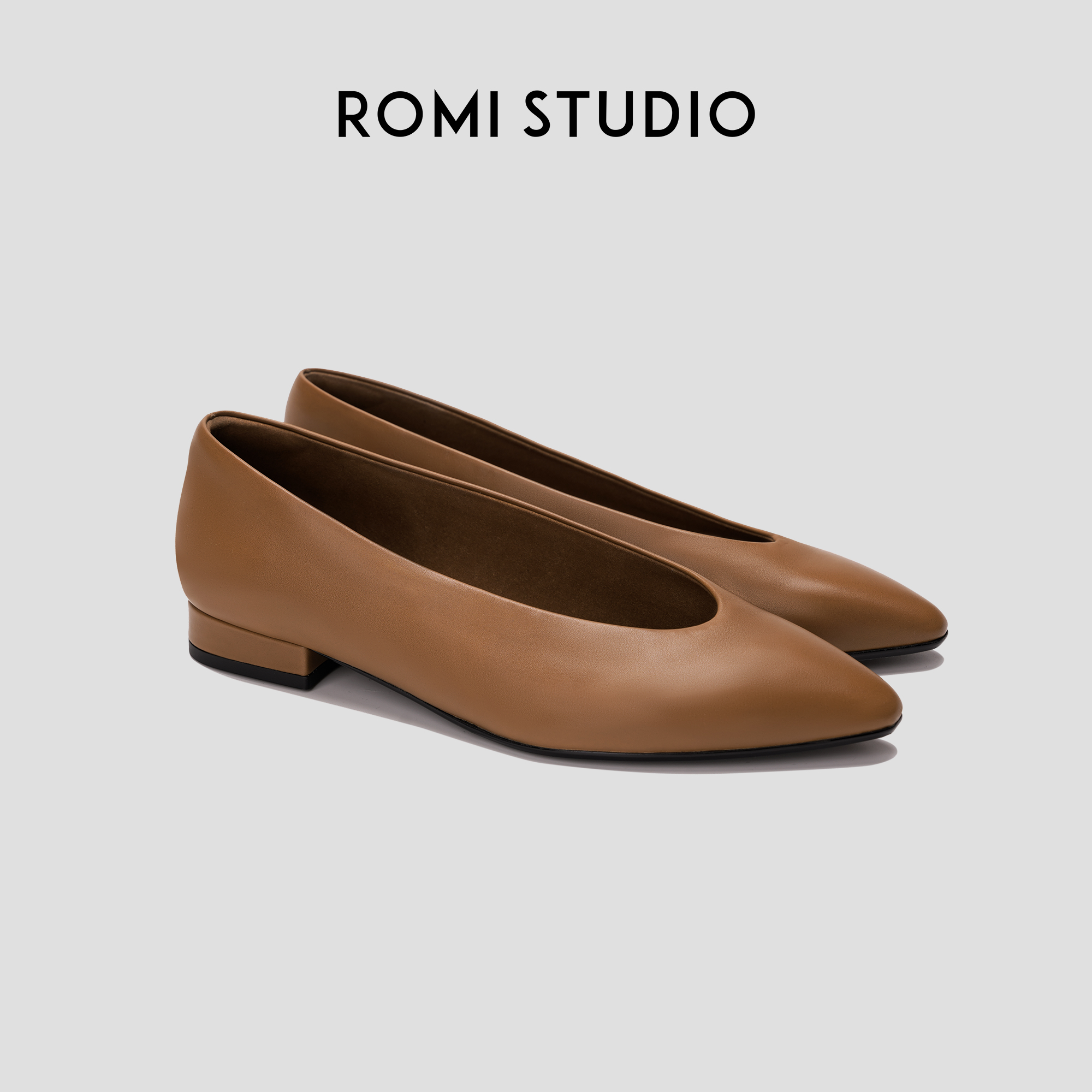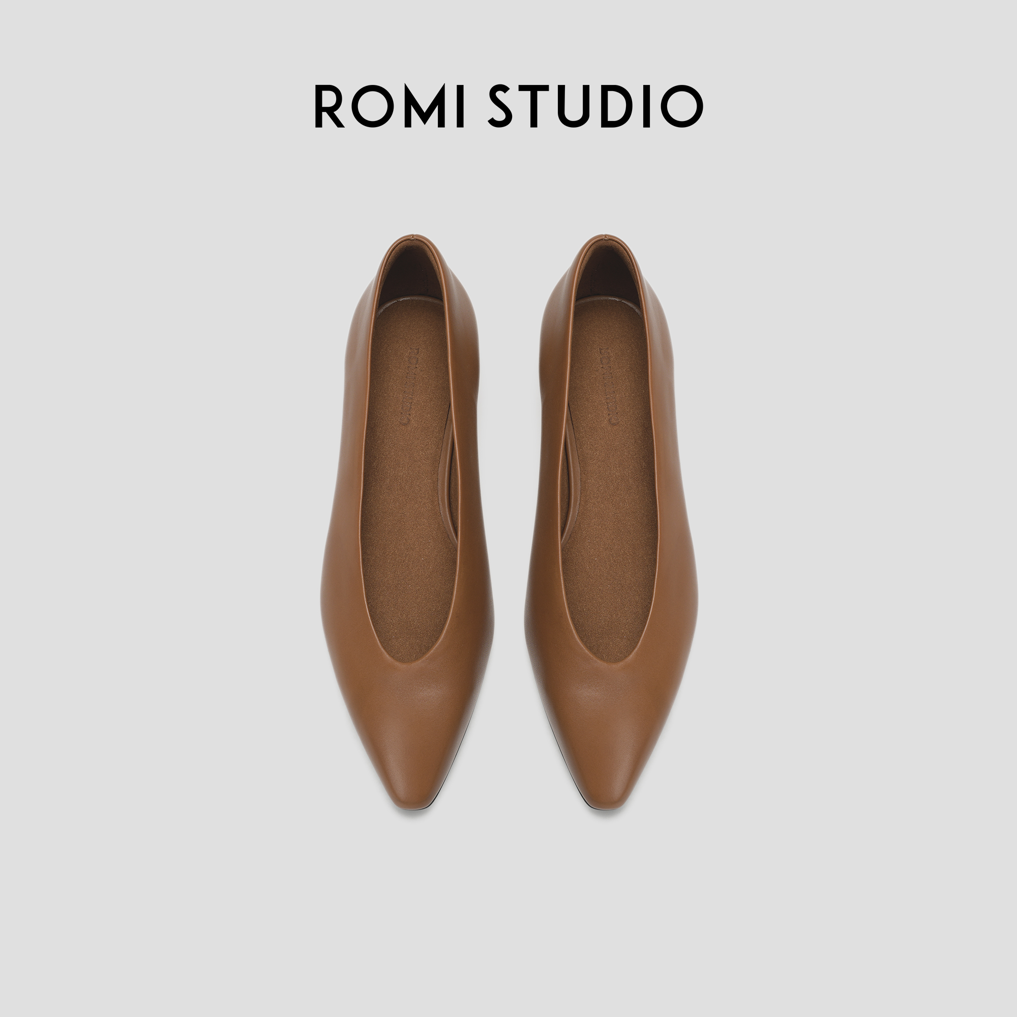 ROMI STUDIO“法式优雅”浅V口尖头平底焦糖棕一脚蹬皮鞋23AWS026