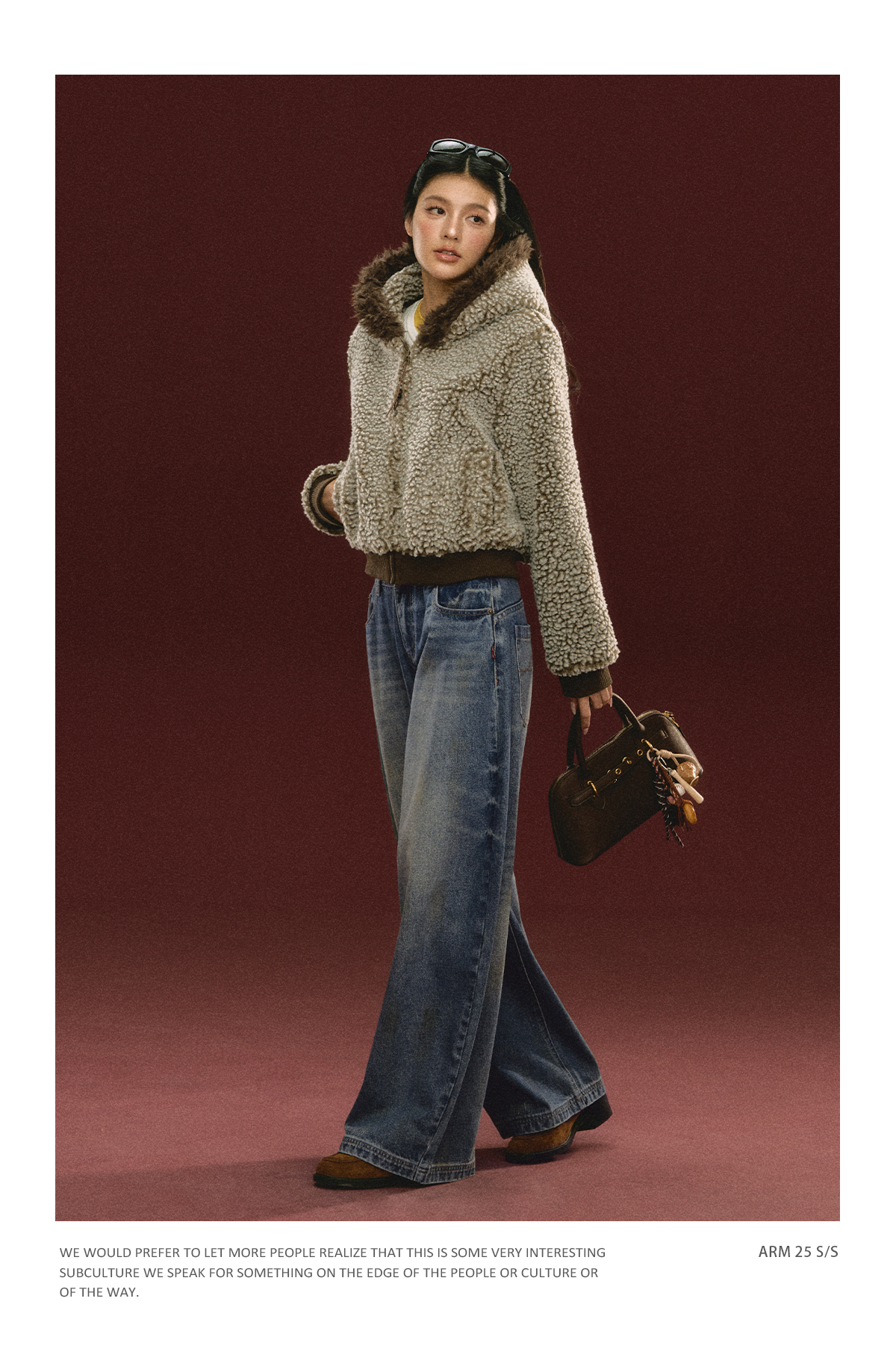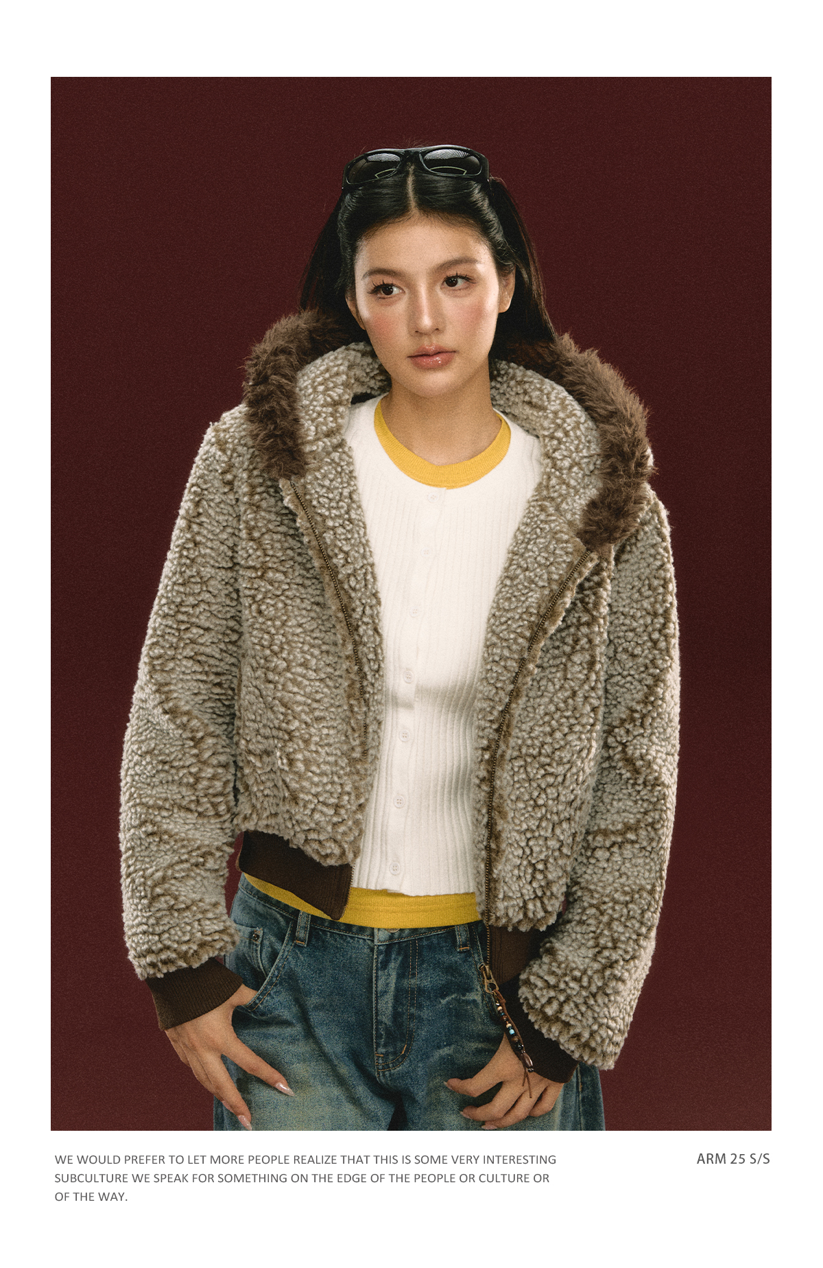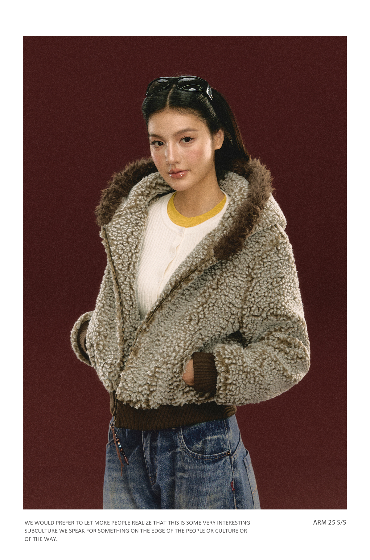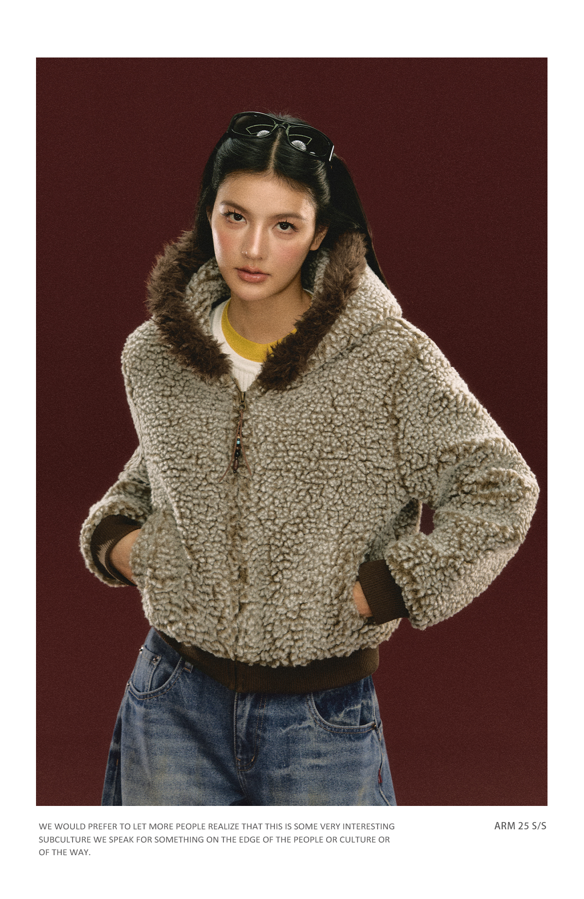 Ariseism 美式复古设计感羊羔绒连帽外套女秋冬新款保暖上衣
