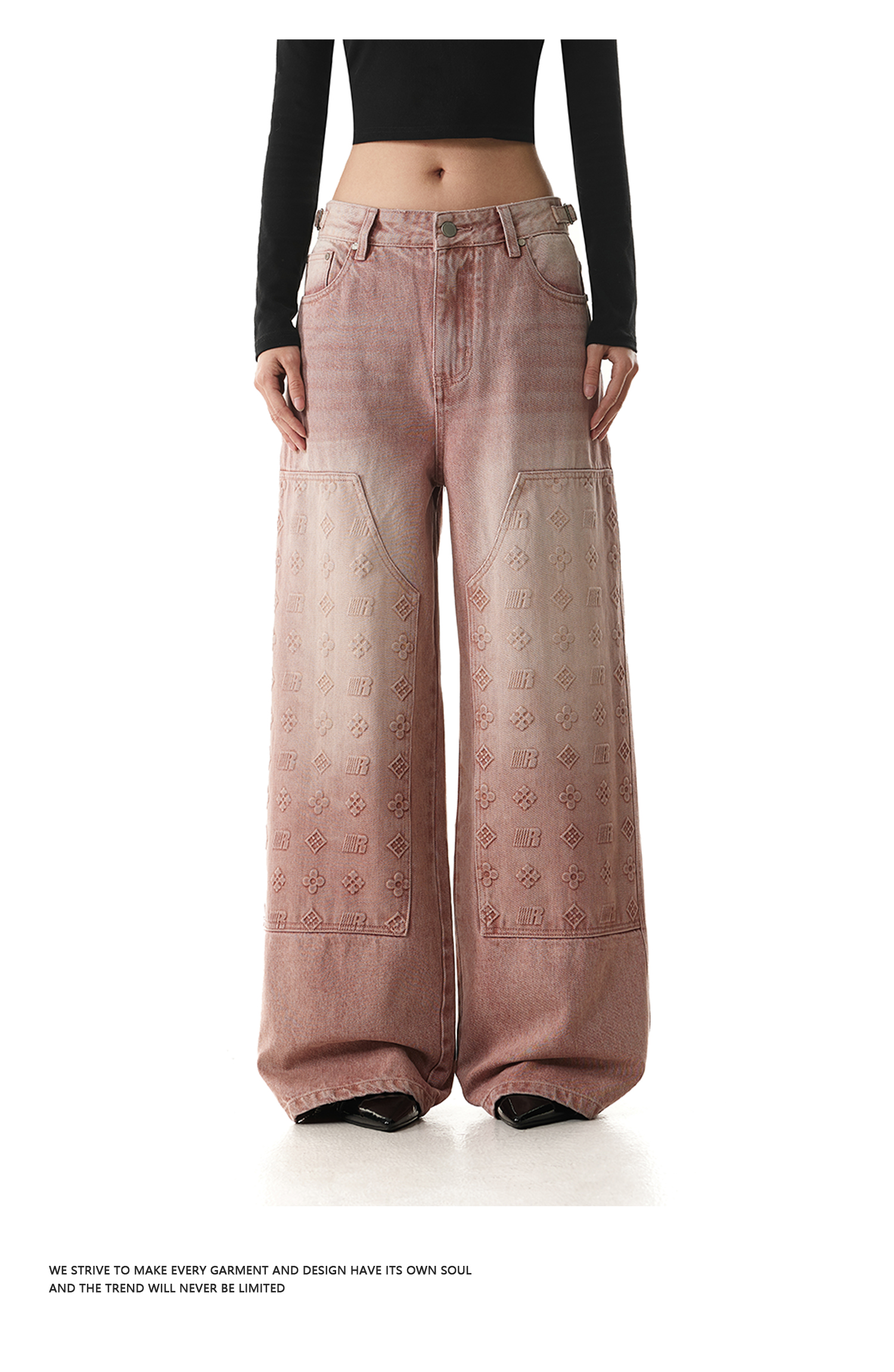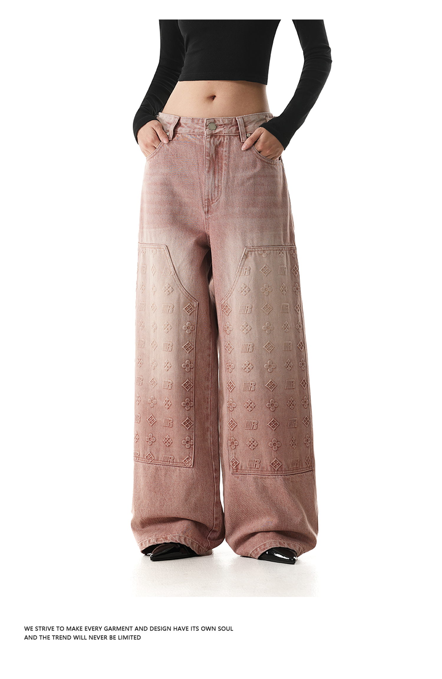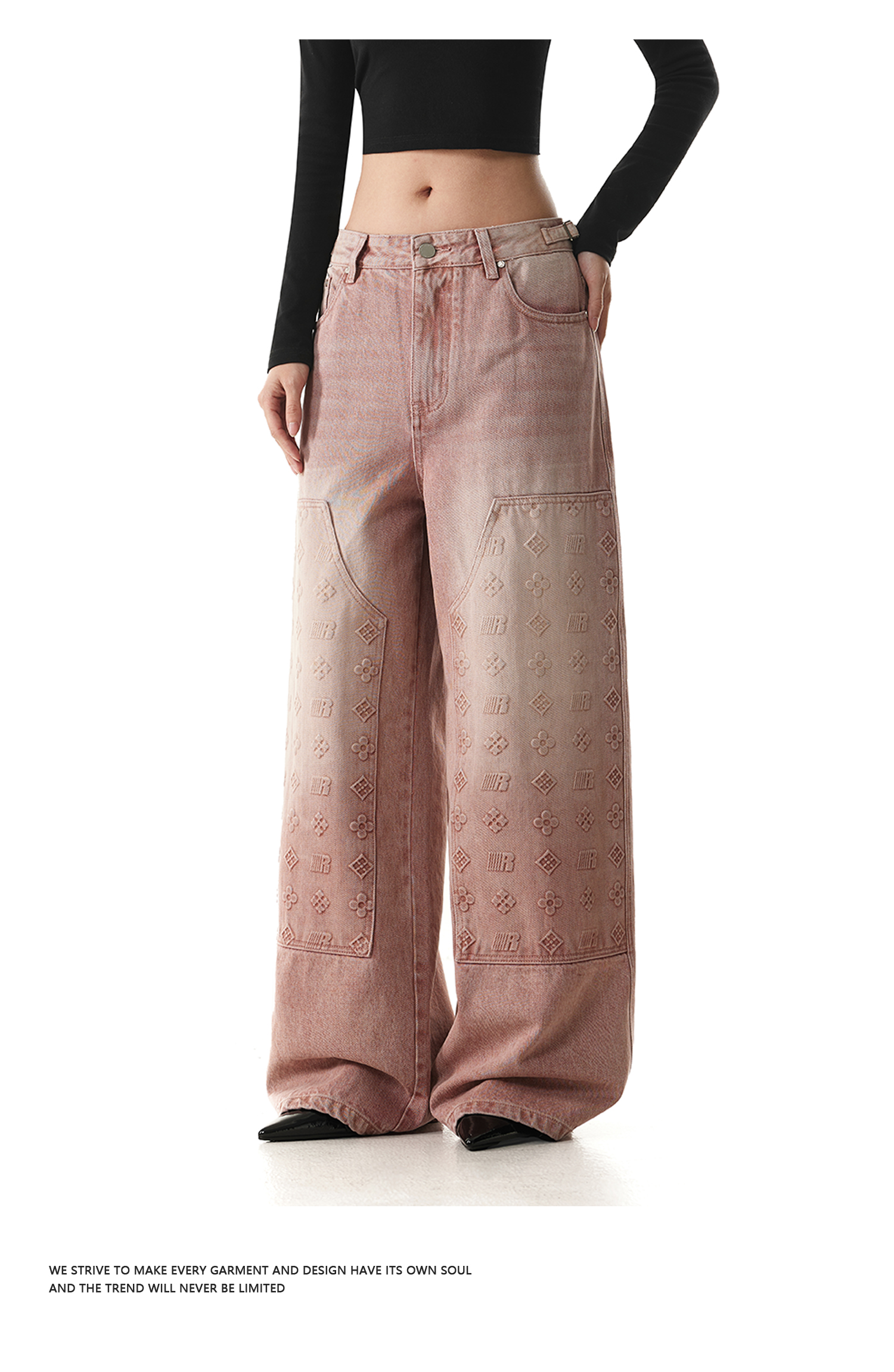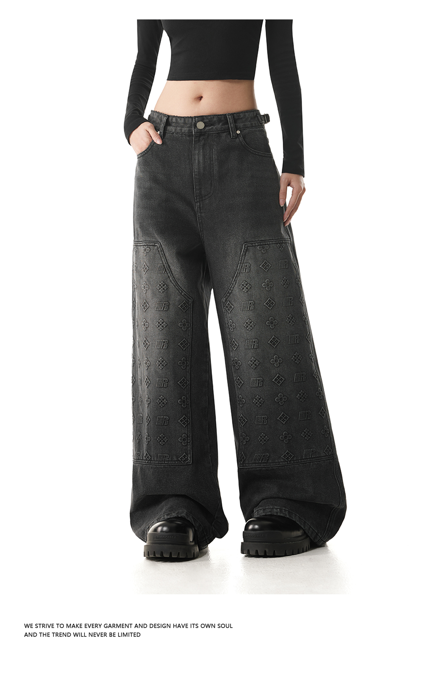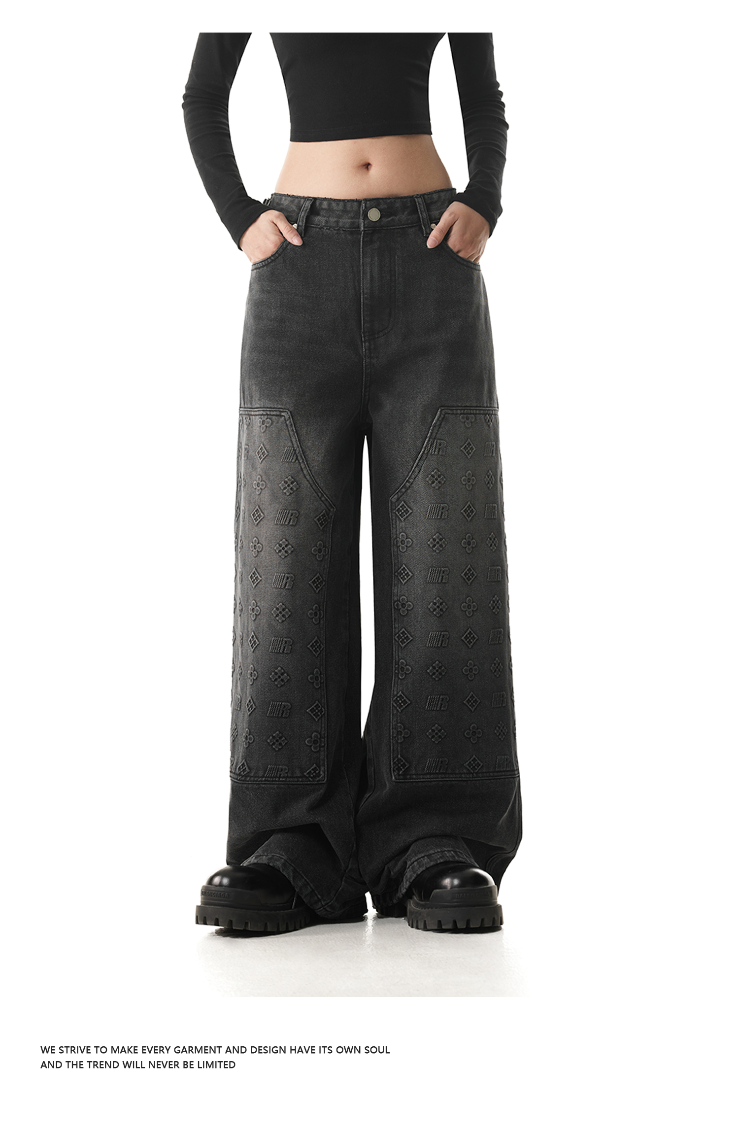 FDR官方店 美式复古压印牛仔裤男女情侣宽松直筒裤阔腿休闲长裤子