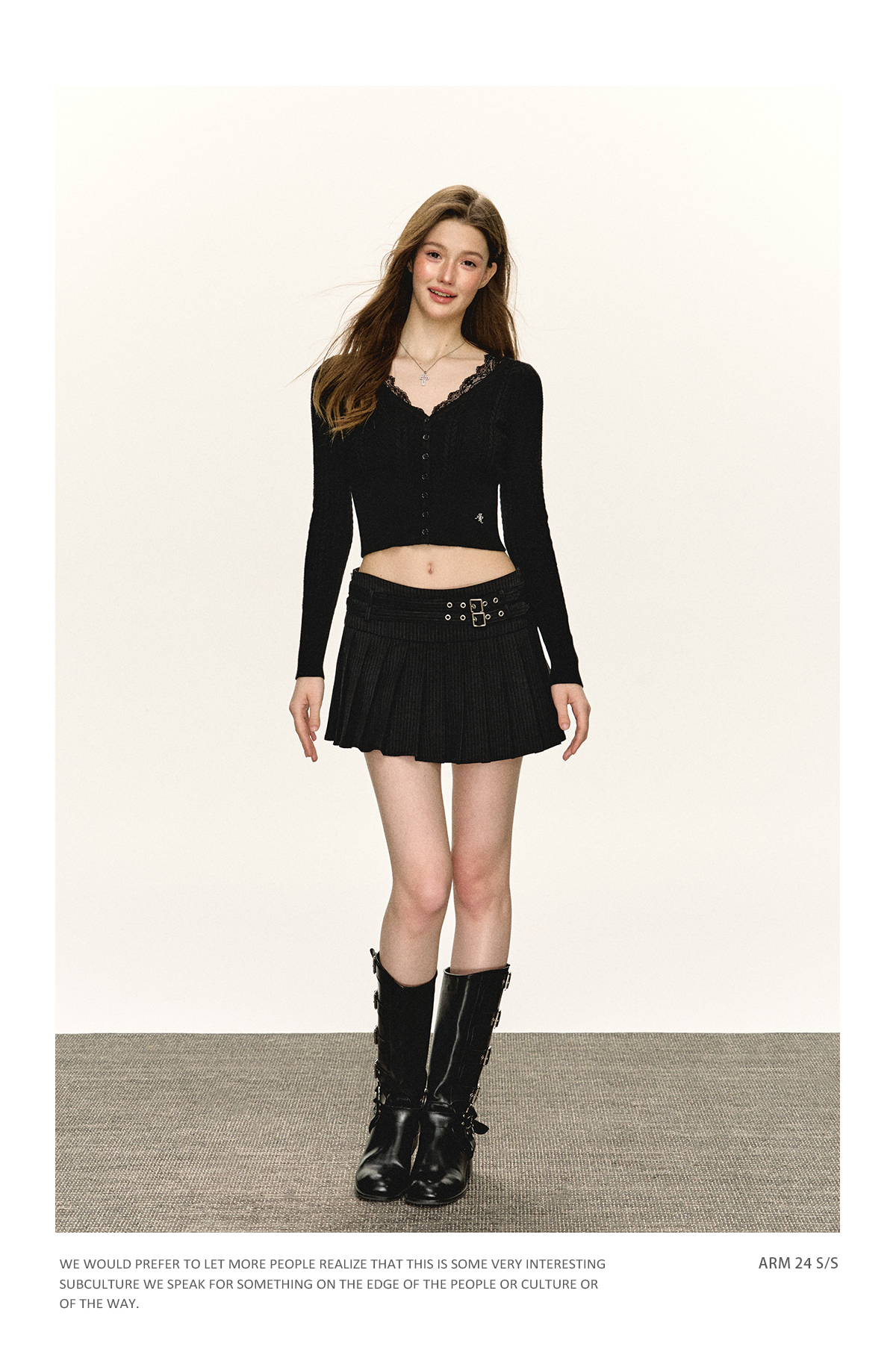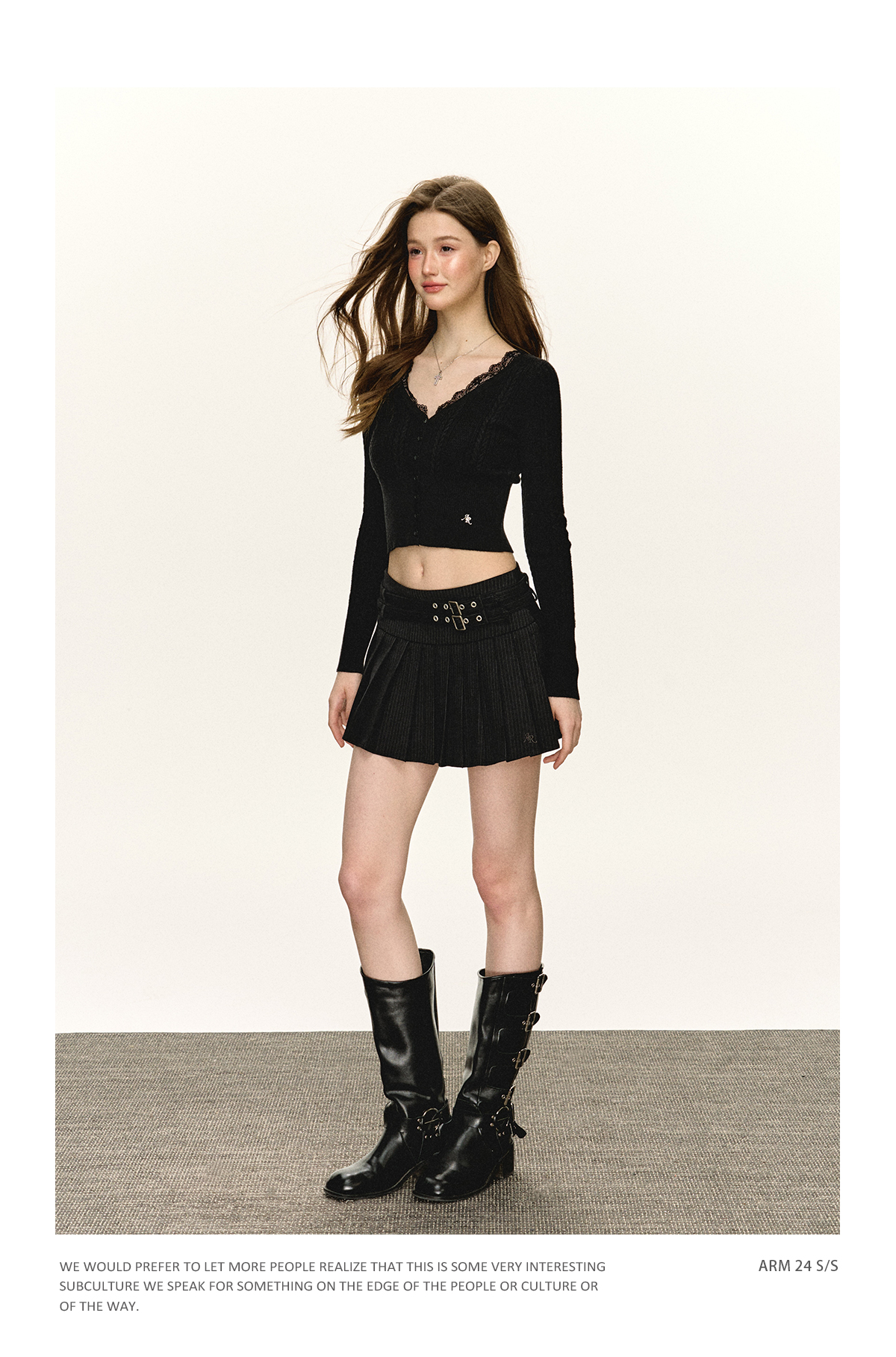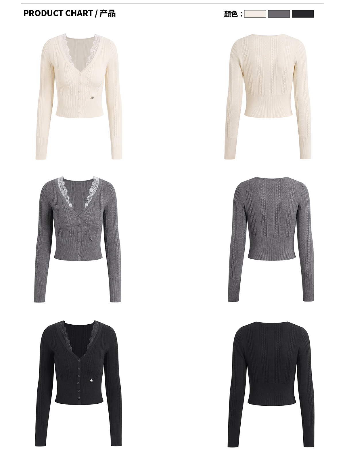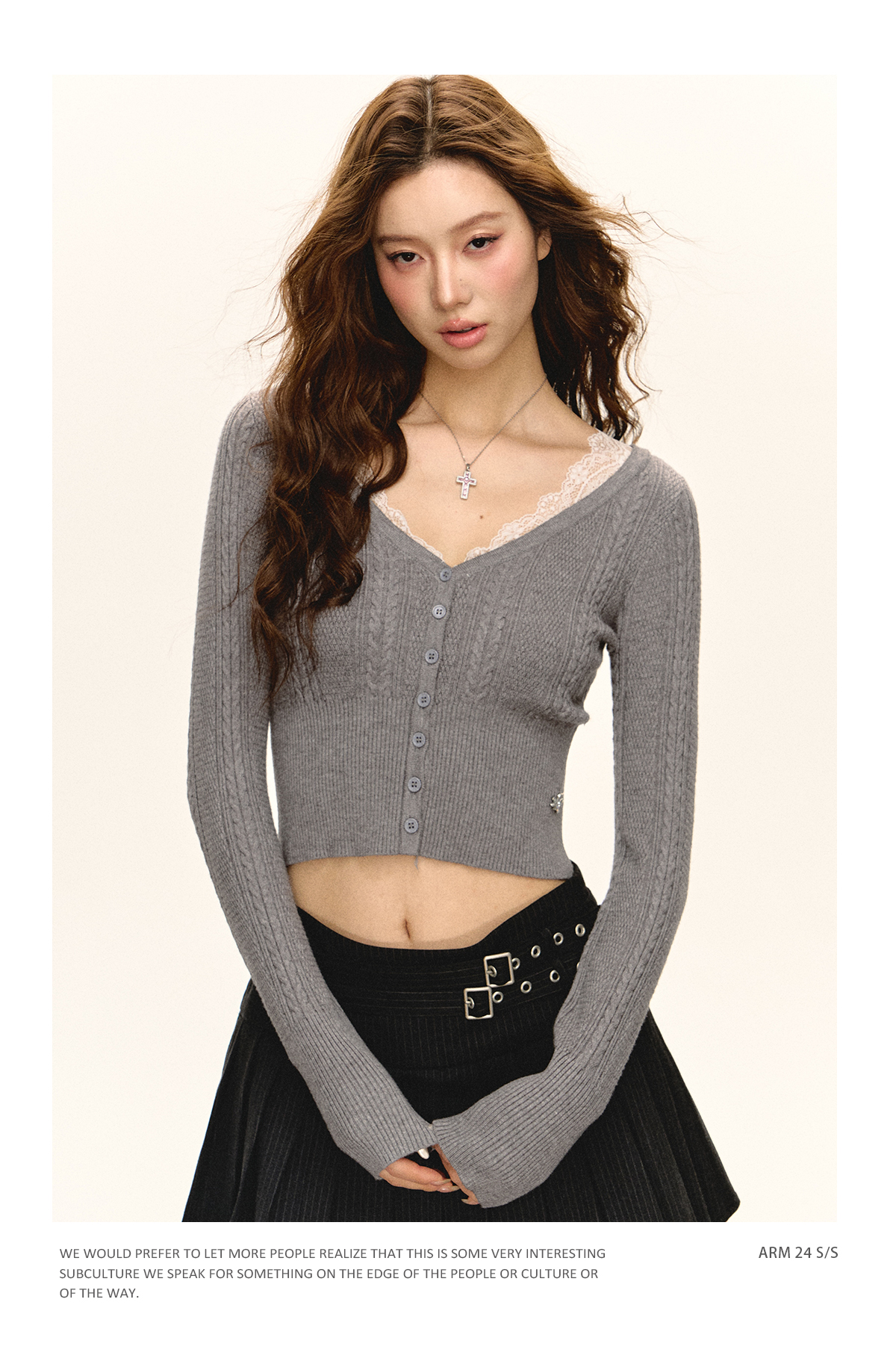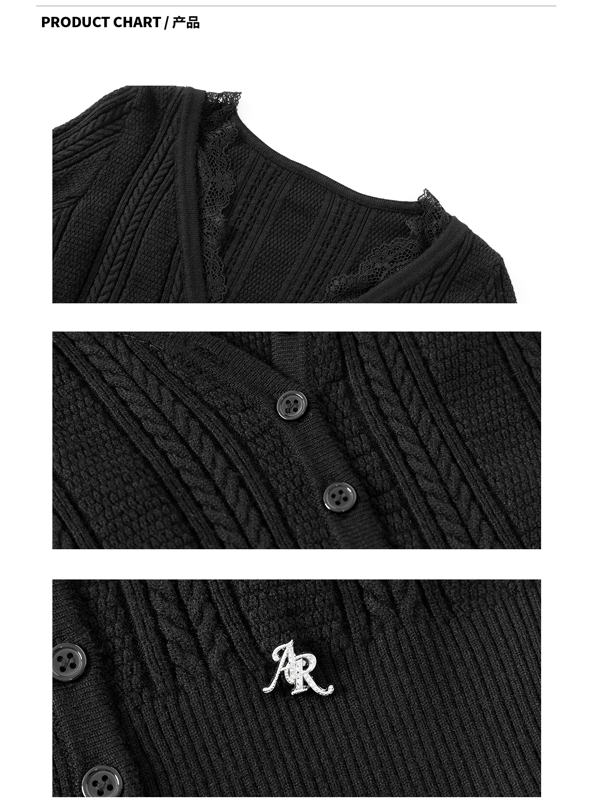 Ariseism 美式复古设计感蕾丝拼接修身针织衫女春季新款长袖上衣