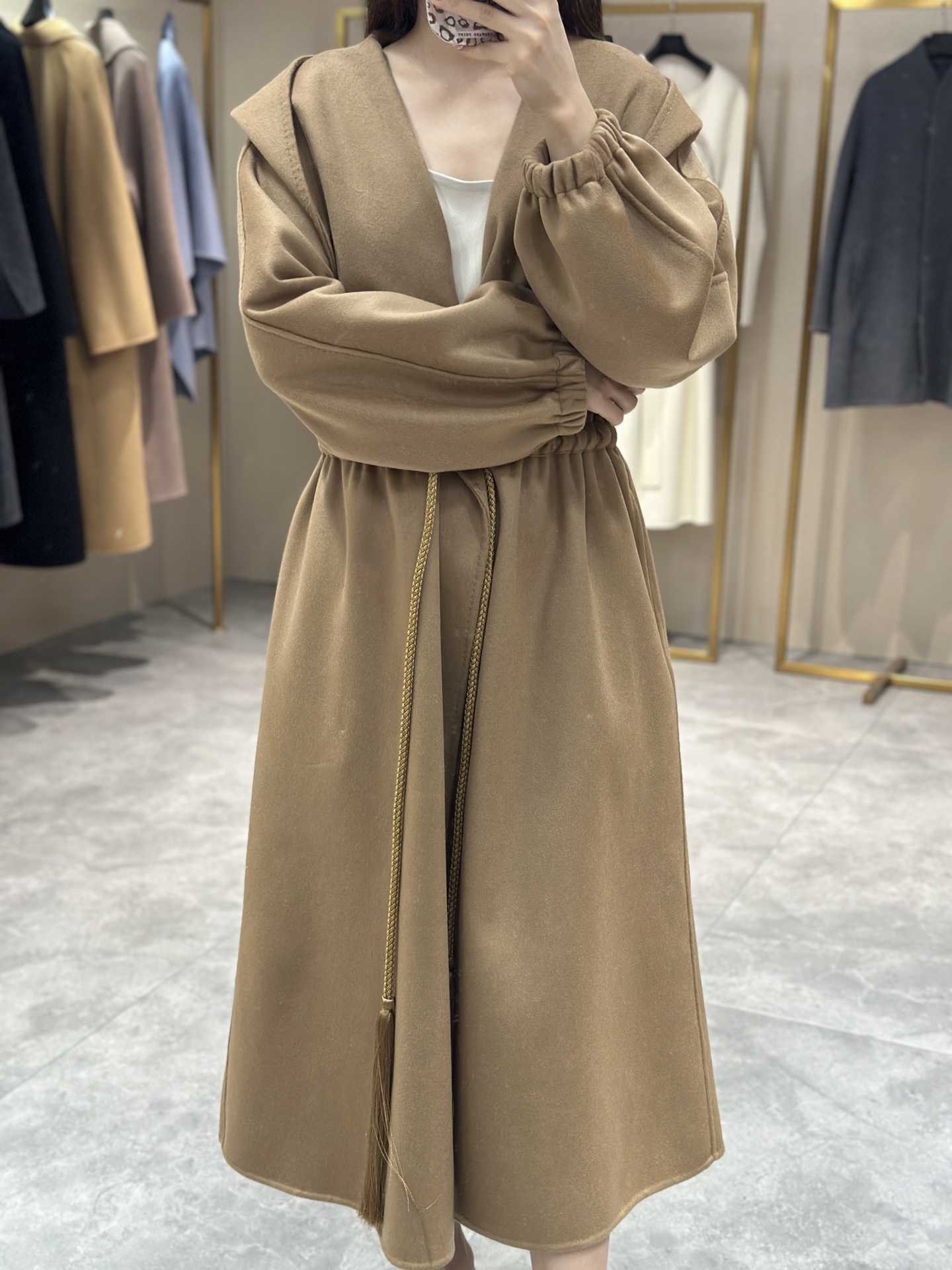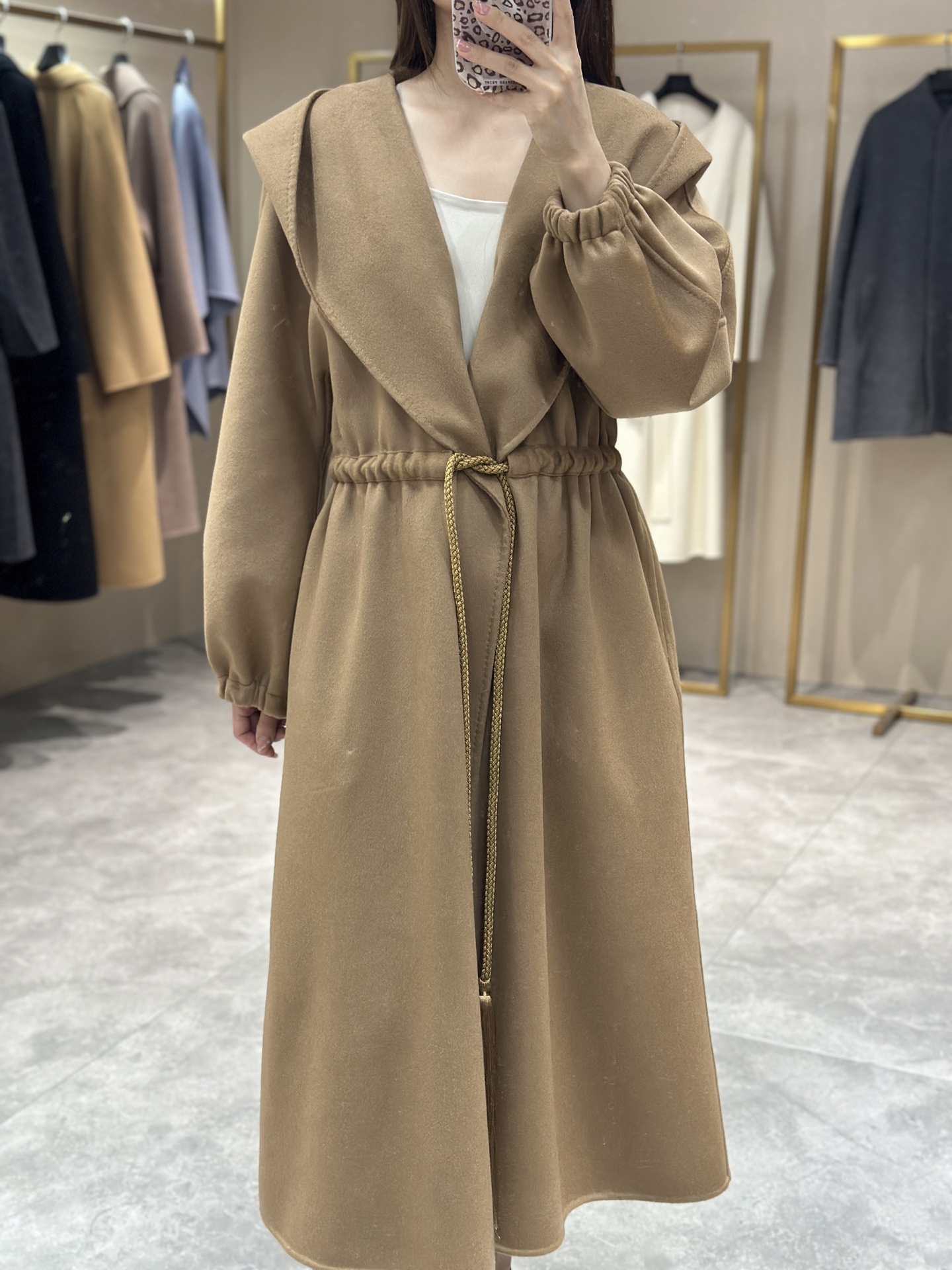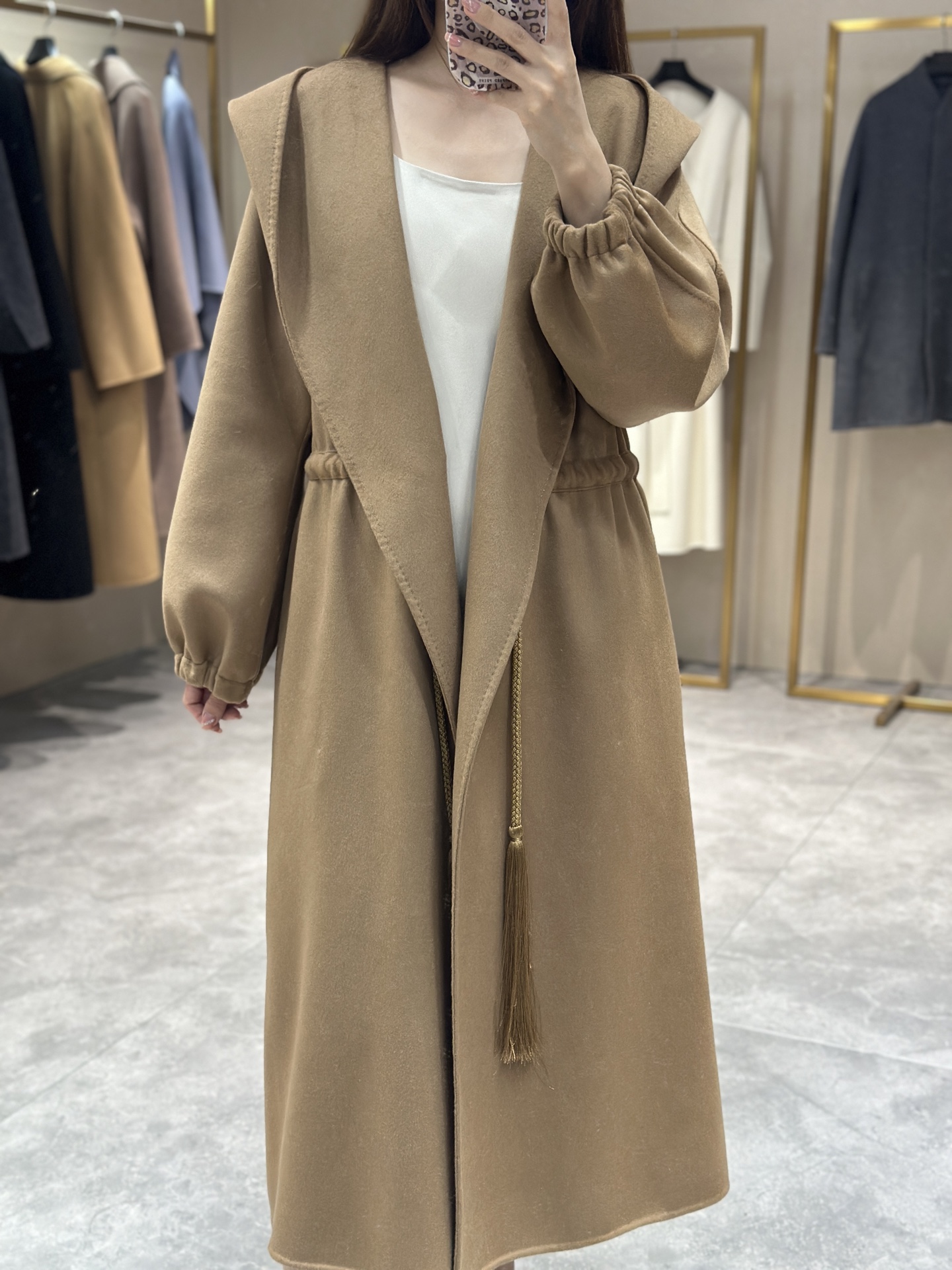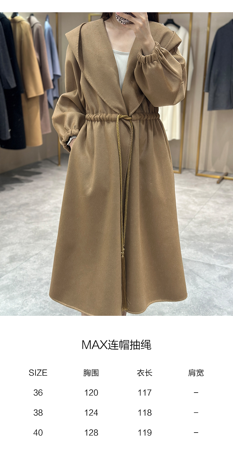 Max连帽抽绳羊绒大衣 Max这款驼色连帽大衣,经典驼色,保暖又有质感!宽松版型+腰带设计,随心调节,舒适又显高级。连帽增添休闲感,秋冬通勤或休闲都很适合。驼色百搭,配裙装裤装都好看,优雅实用兼具,秋冬衣橱必备单品!