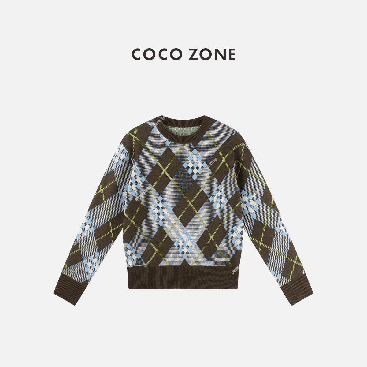 COCO ZONE 时尚撞色格子针织衫气质圆领长袖上衣CC2C1899