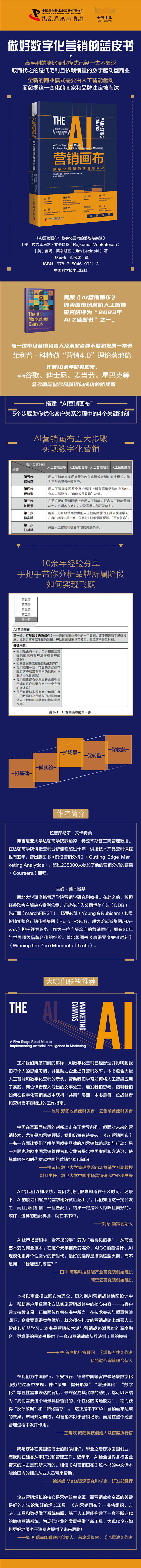 《AI营销画布》能够帮助营销、广告、市场等行业的负责人及从业人员将以客户为中心的战略营销付诸实践,创造数字化驱动的商业,最大限度上发挥人工智能与机器学习的价值。
