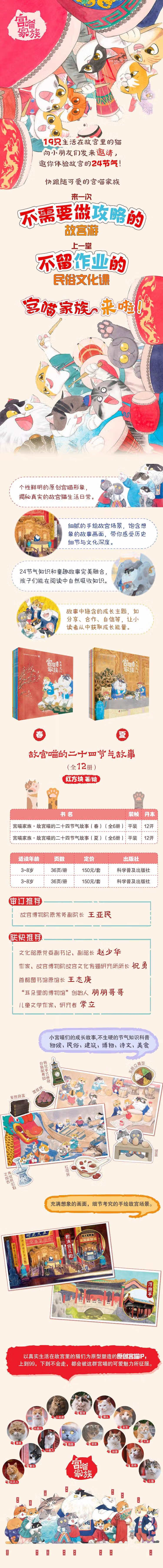故宫里生活的猫们为主角,小读者讲述二十四节气故事的系列绘本。系列绘本分24册,每册通过一个宫喵的小故事向小读者介绍相应节气的知识,与其他同类书不同,创作者将节气知识、故宫场景巧妙地融于故事中,让小读者在轻松、自发地在阅读中习得相关知识。值得一提的是,每一册故事都可以提炼出一个与孩子成长相关的故事主题(关键词),如分享、合作、自信、勇敢、认错等,创作团队希望这些故事还能让小读者汲取成长能量。