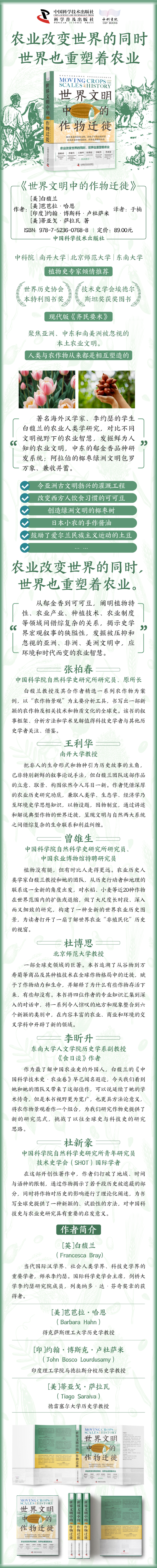 著名海外汉学家、李约瑟的学生白馥兰,及其伙伴芭芭拉哈恩、约翰博斯科卢杜萨米、蒂亚戈萨拉瓦共同进行的农业人类学研究。对比不同文明视野下的农业智慧,发掘鲜为人知的农业文明:中东的郁金香品种研发系统领先世界几百年;阿拉伯的椰枣绿洲文明包罗万象、兼收并蓄;令亚洲古文明勃兴的灌溉工程、改变西方人饮食习惯的可可豆、创造绿洲文明的椰枣树、日本小农的手作酱油、鼓励了爱尔兰民族主义运动的土豆……农业改变世界的同时,世界也重塑着农业