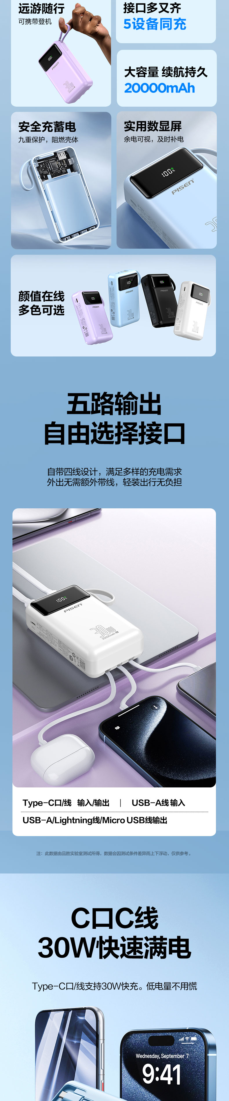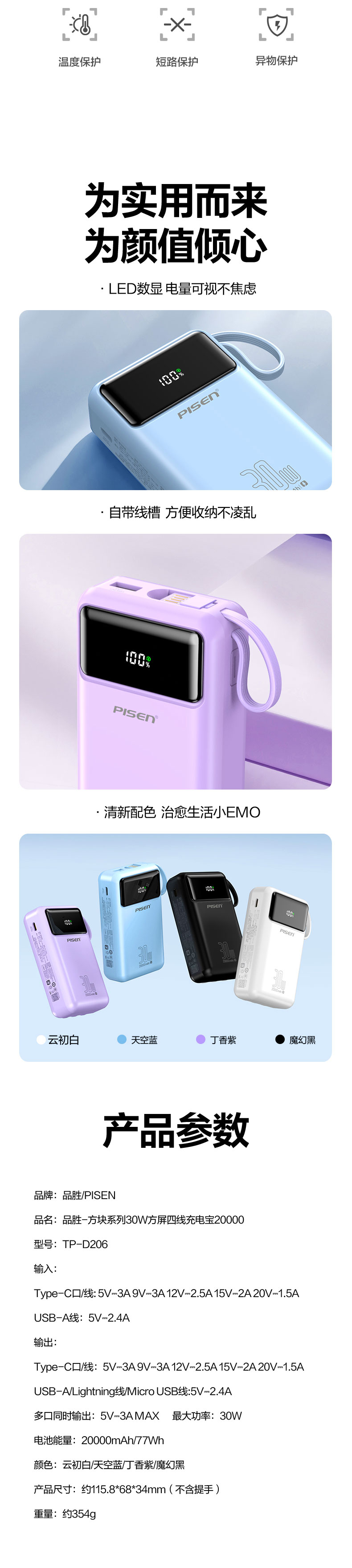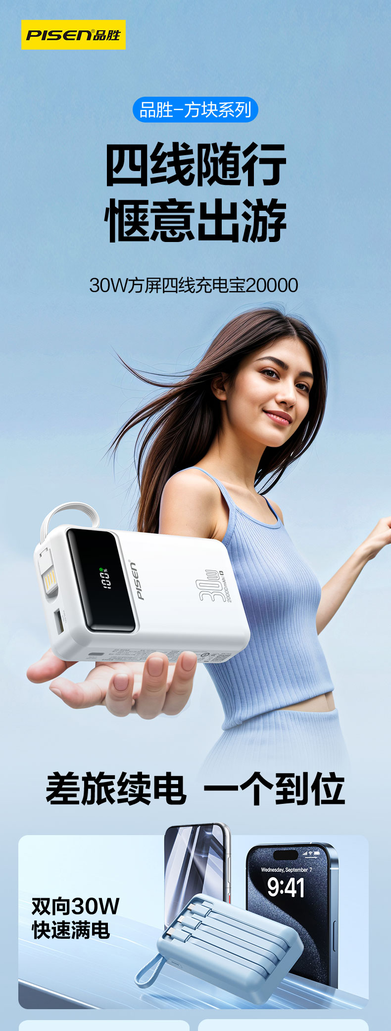 品胜 方块系列30W方屏四线充电宝20000毫安 自带四线苹果/安卓/C口数据线适用华为小米苹果手机支持PD快充移动电源