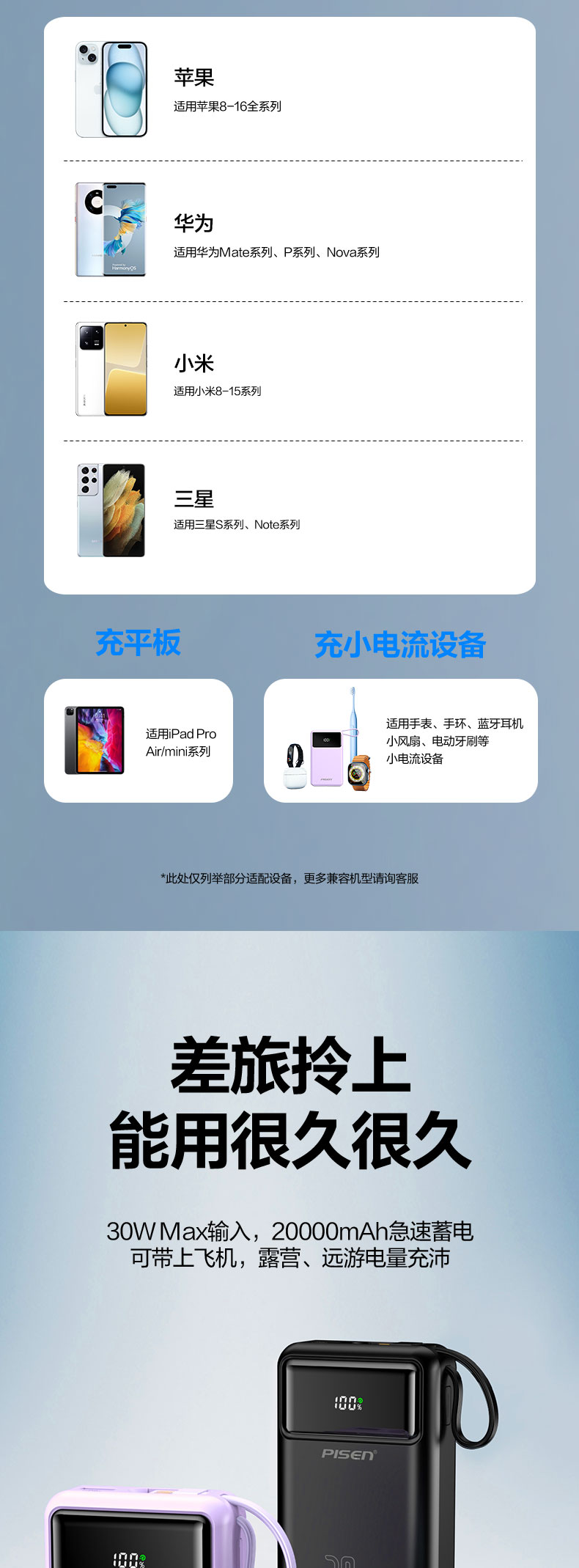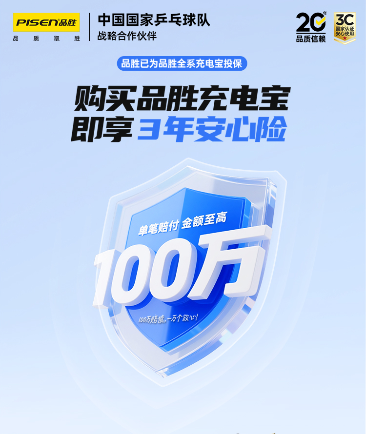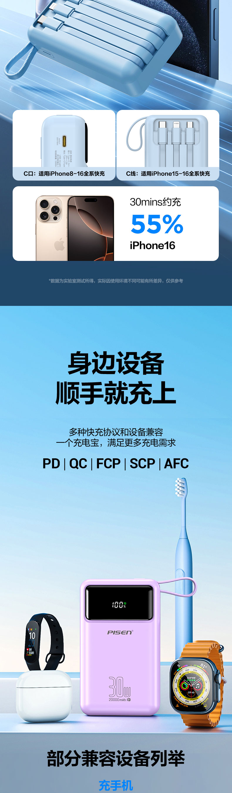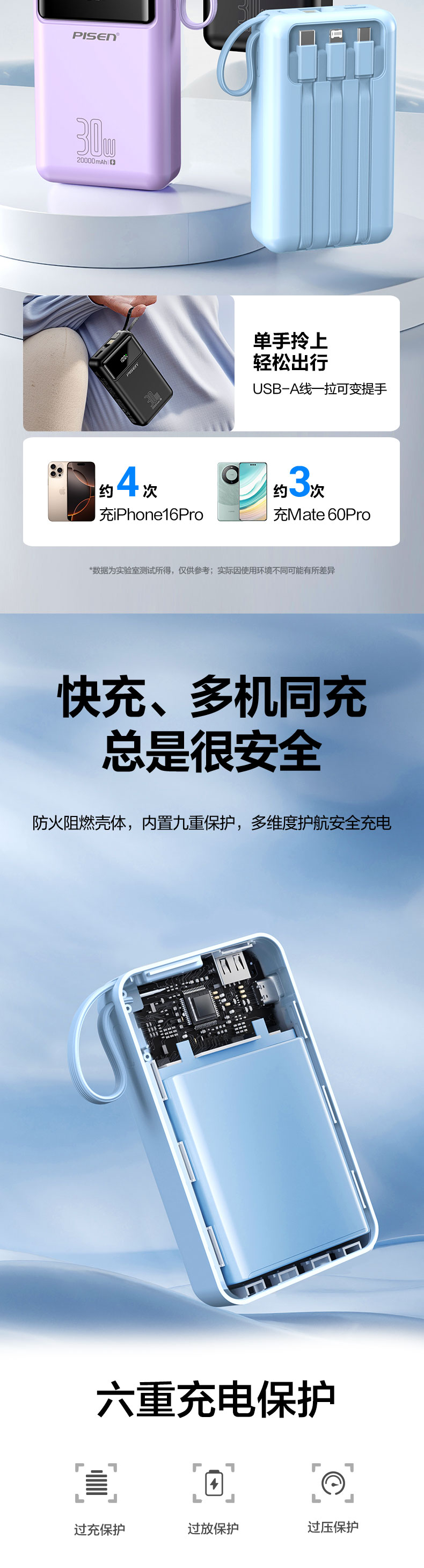 品胜 方块系列30W方屏四线充电宝20000毫安 自带四线苹果/安卓/C口数据线适用华为小米苹果手机支持PD快充移动电源
