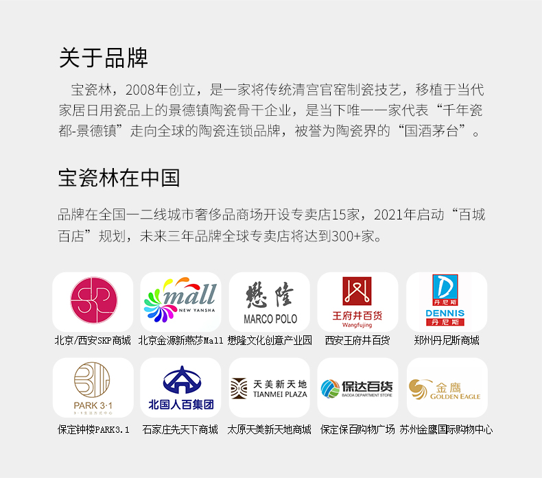 宝瓷林,2008年创立,是一家将传统清宫官窑制瓷技艺,移植于当代家居日用瓷品上的景德镇陶瓷骨干企业,是当下唯一一家代表“千年瓷都-景德镇”走向全球的陶瓷连锁品牌,被誉为陶瓷界的“国酒茅台”。