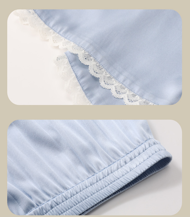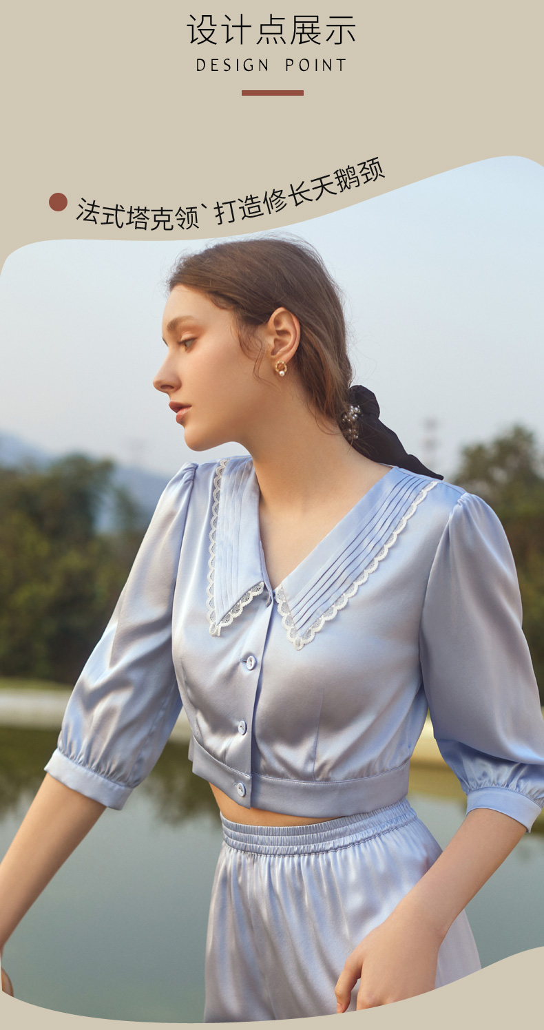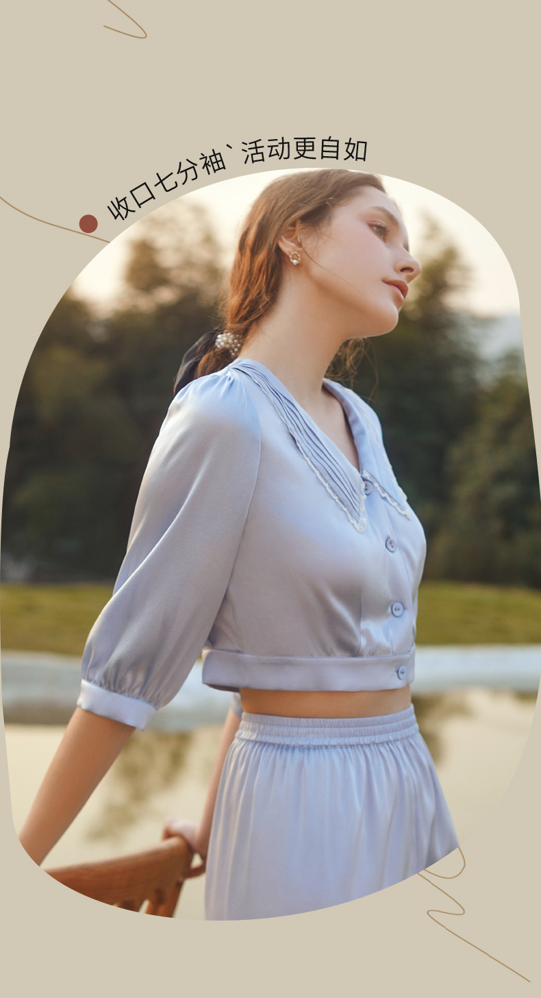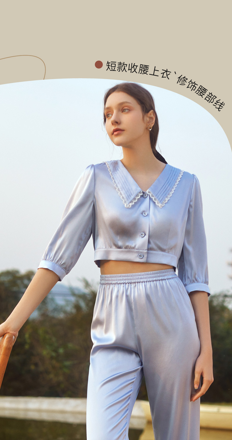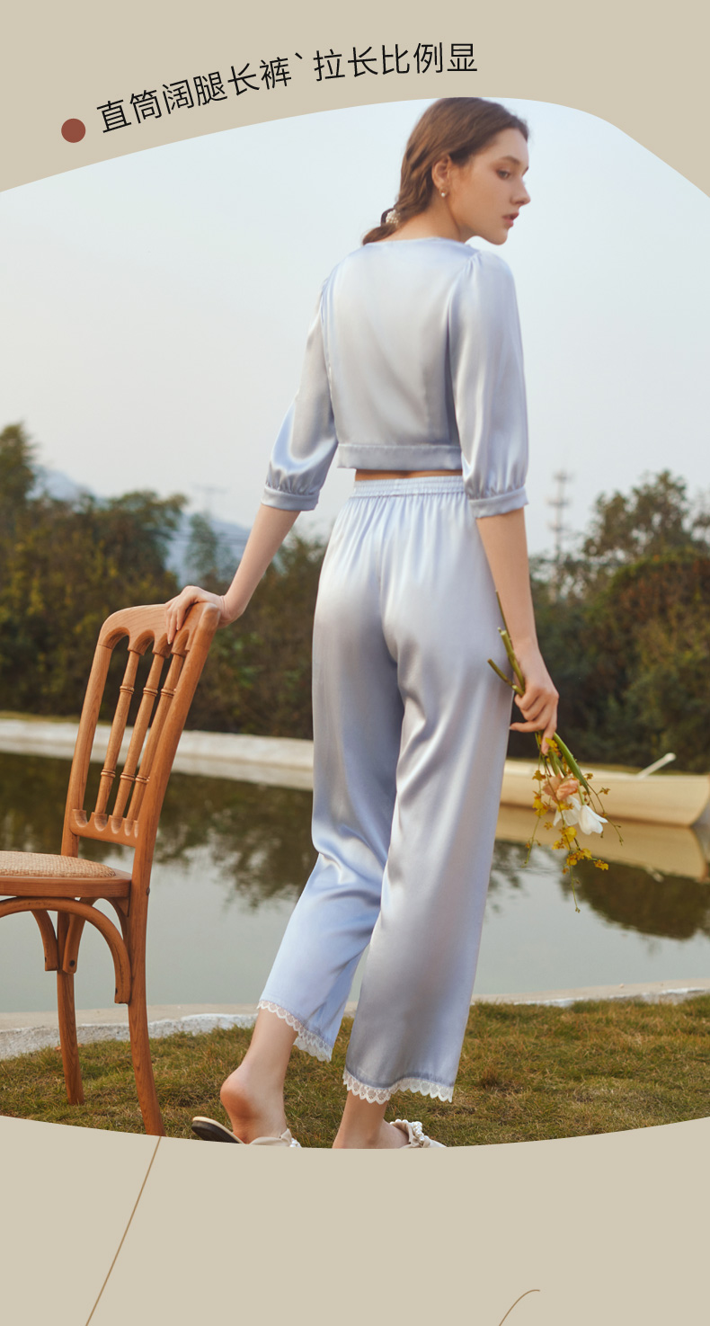 金三塔蓝铃草色真丝睡衣套女七分袖长裤可外穿两件套家居服 YSFCB299