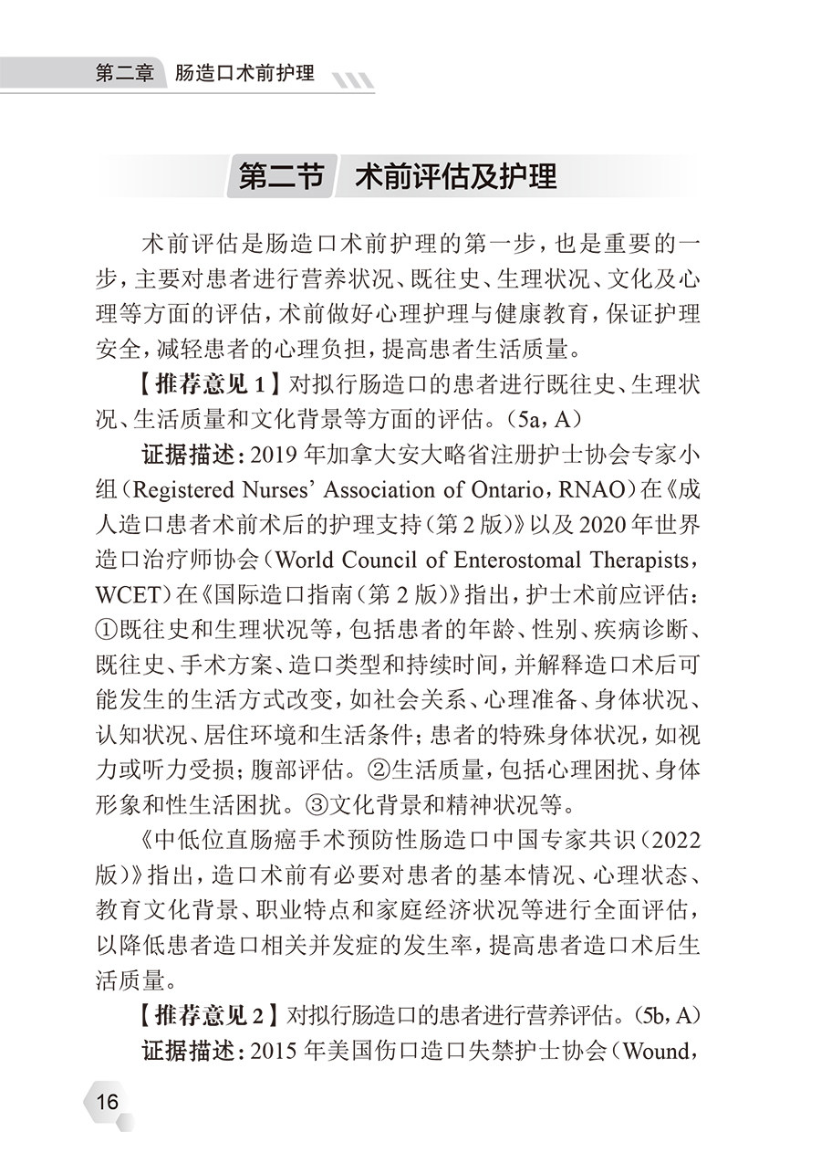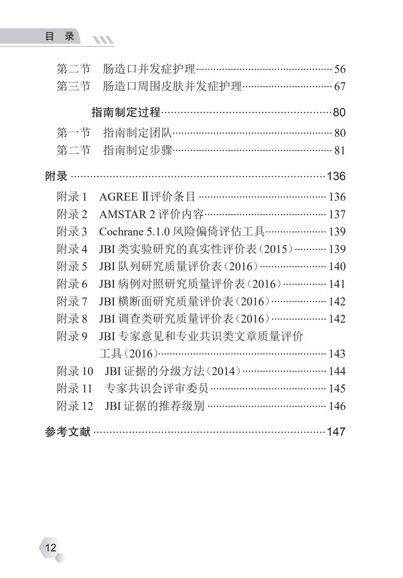 本指南主要包括指南介绍,肠造口术前护理、术后护理、康复期护理,肠造口及周围皮肤并发症,指南制定过程等。指南制定具体过程包括确立主题、证据检索、证据筛选和资料提取、证据评价、证据分级、形成推荐意见并达成教授学者共识、形成指南初稿、教授外审和定稿。 造口护理是一项专业性较强的护理技能,尤其是造口及周围皮肤并发症的观察和治疗,对临床护理人员的专业护理知识和技能有较高要求。随着快速康复外科理念的推广,患者在院内掌握必要的造口护理知识、技能的时间相应减少。肠造口病人出院准备度处于中等水平,住院期间所获得的健康指导尚不能满足病人需求,病人在出院后很长一段时间内仍不能适应造口生活。79.69%的肠造口病人希望从社区得到肠造口日常生活护理的指导,但实际目前国内社区护理人员对于肠造口护理知晓率低、利用率低以及满足率低。因此,迫切需要一部专门的成人肠造口护理的循证指南以指导临床医护人员、社区护理人员、患者及其家属进行肠造口护理,从而提高肠造口患者生活质量。 本指南由中华护理学会伤口造口失禁护理专委会组织全国相关领域教授学者进行编写,严格筛选具有丰富的压力性损伤预防和护理经验及理论知识的编者,分为指南指导委员会、指南制订小组、评审小组、系统评价小组,其中1名循证教授兼任指南指导委员会和评审小组工作。