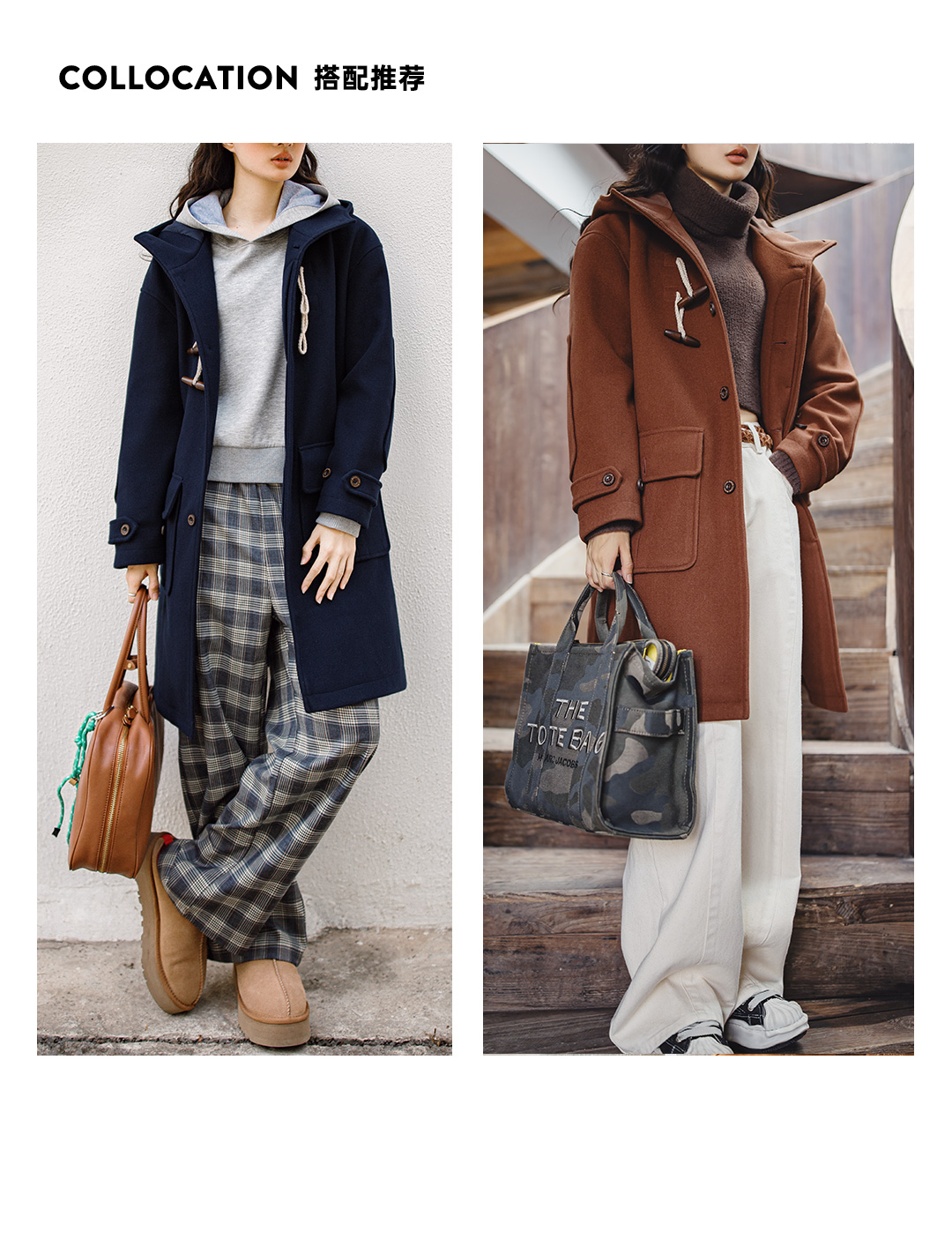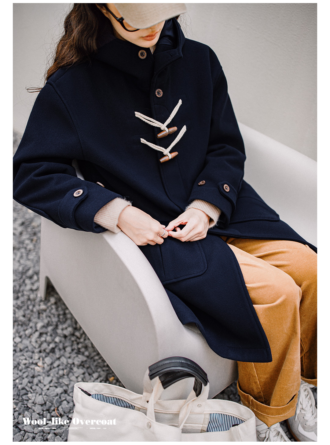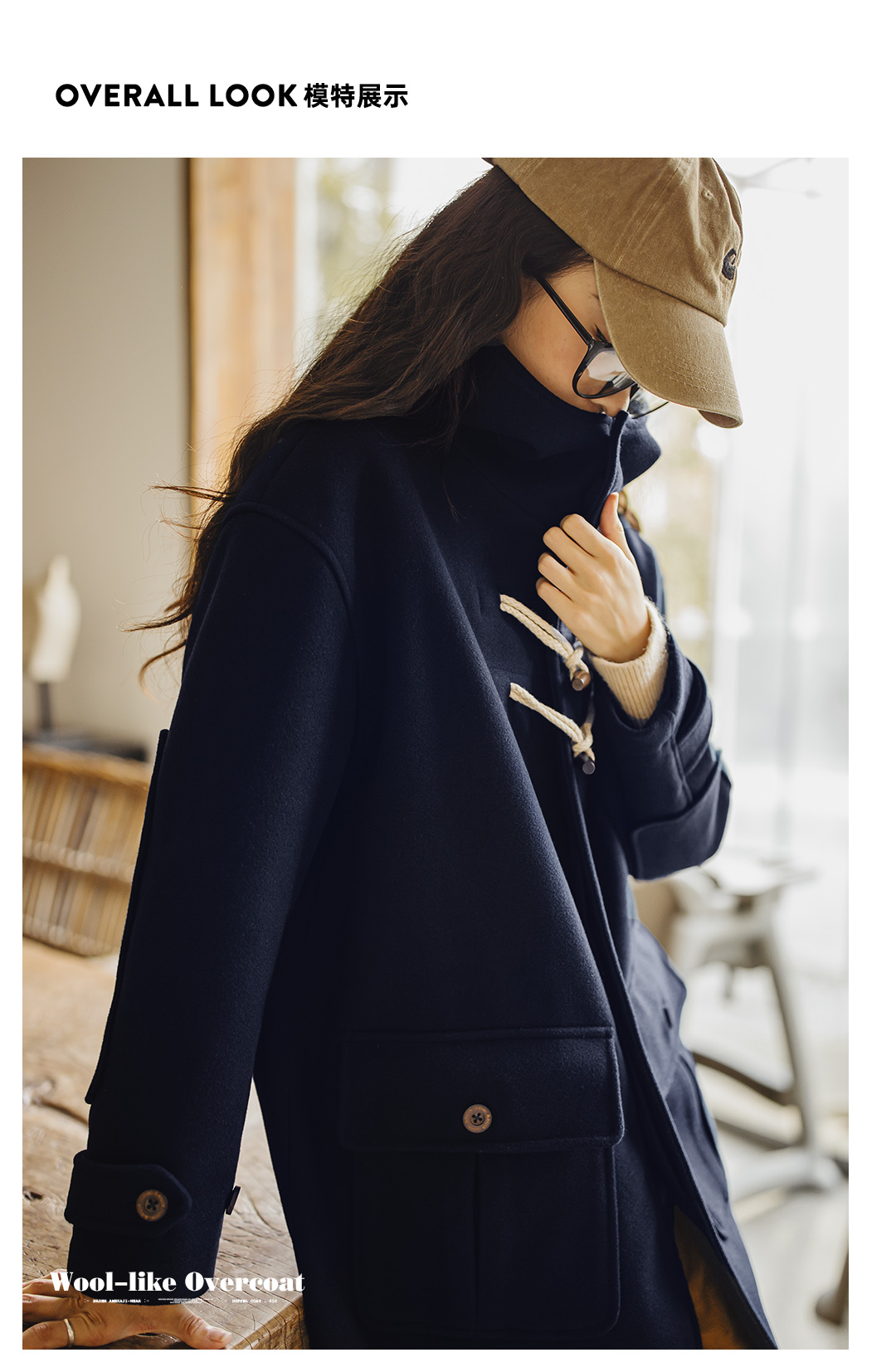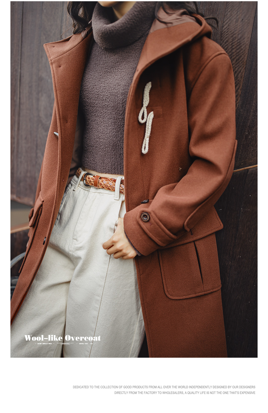 马登复古学院风牛角扣毛呢大衣中长款宽松通勤连帽厚外套冬季女