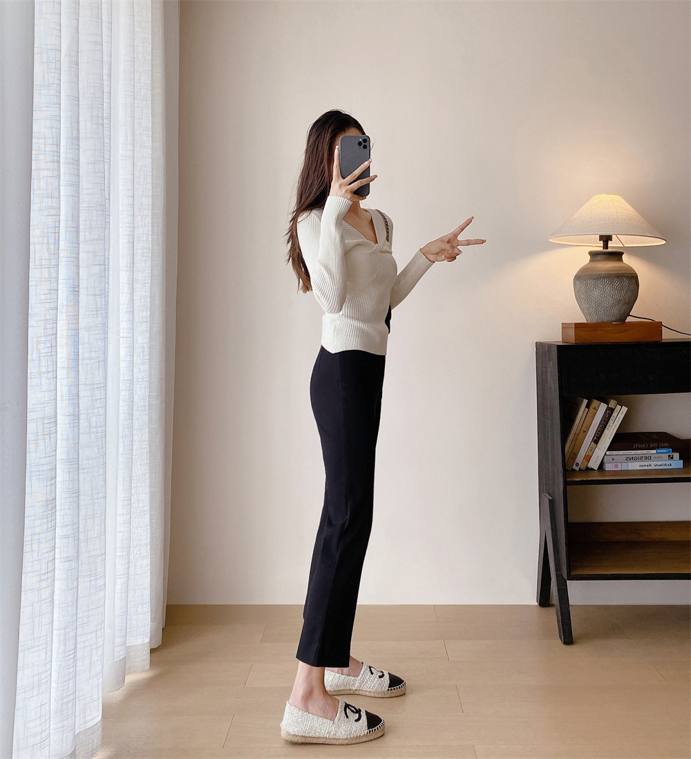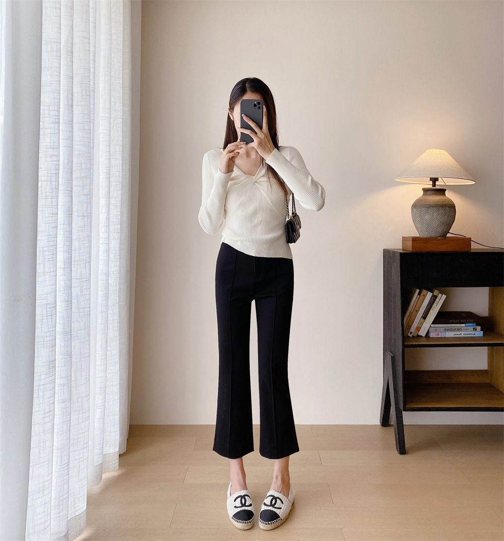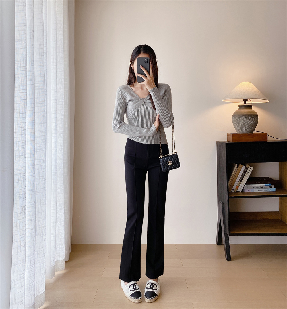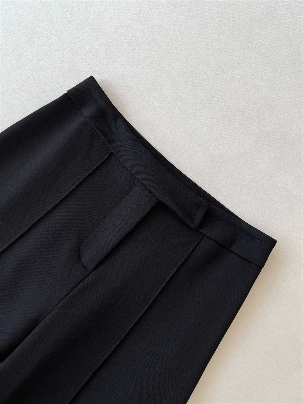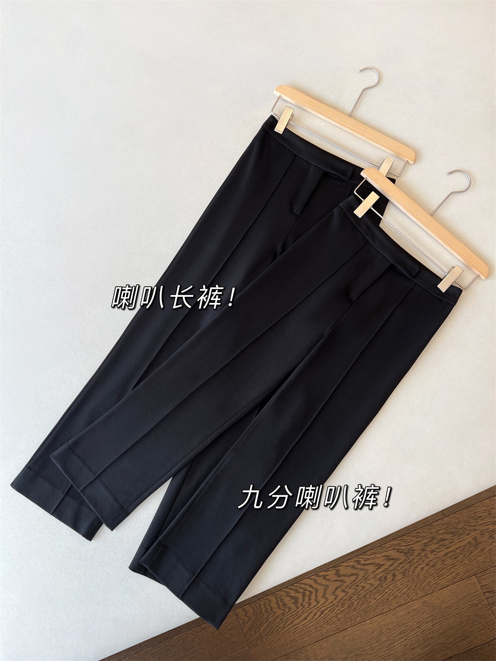 修身合体的喇叭裤型干净利落,上收而裤脚微放的设计