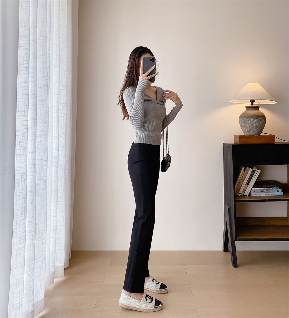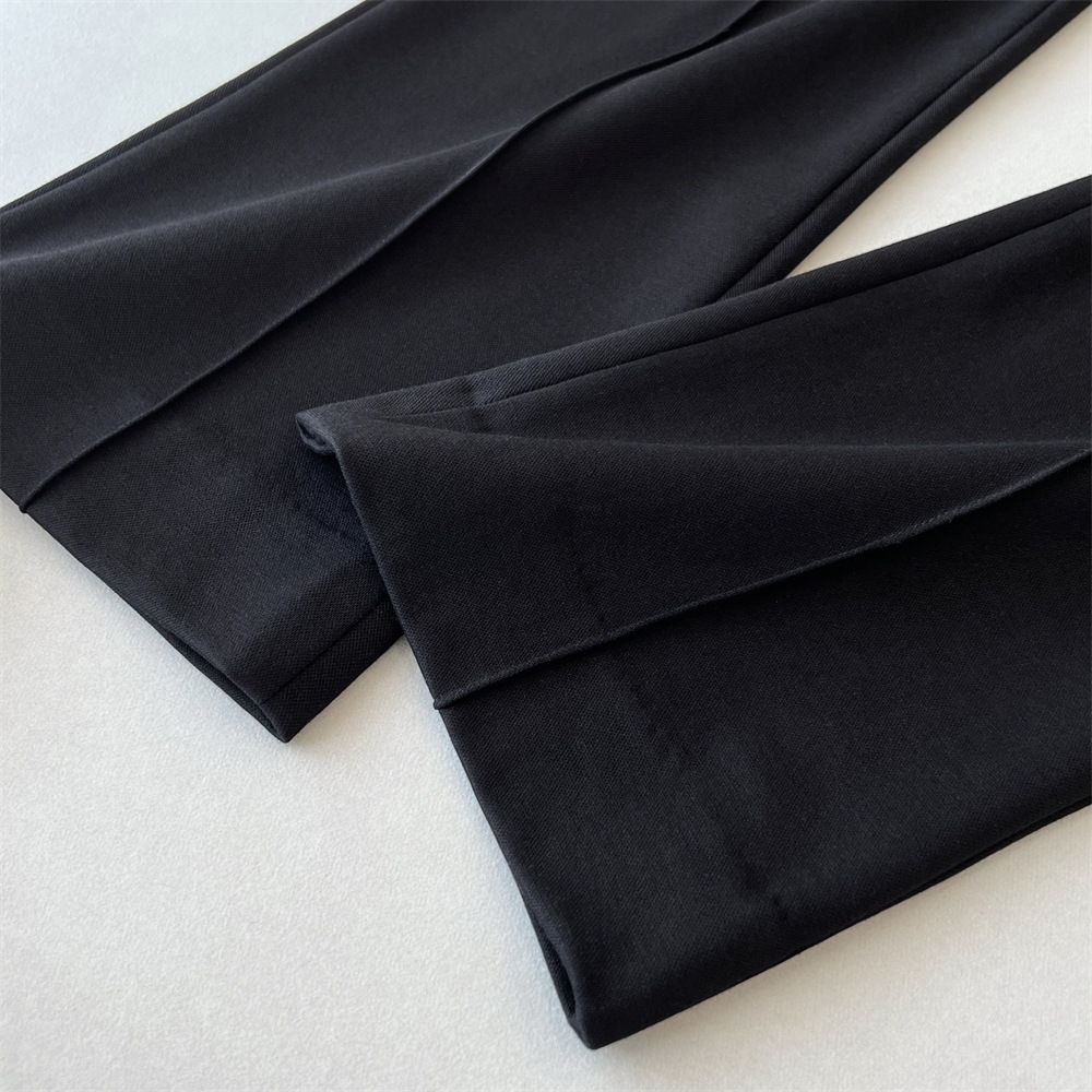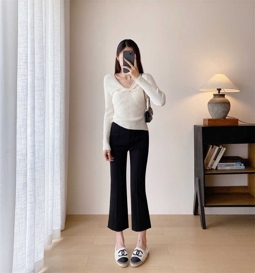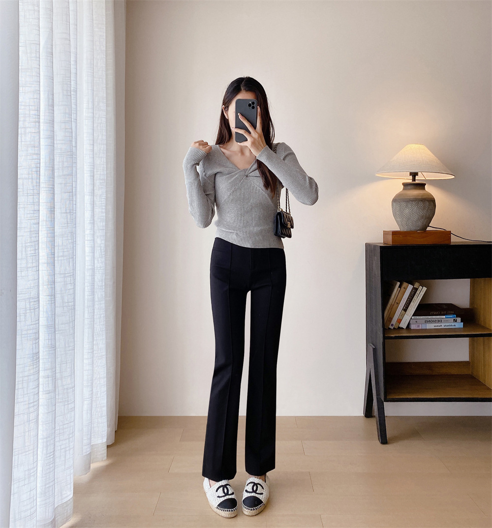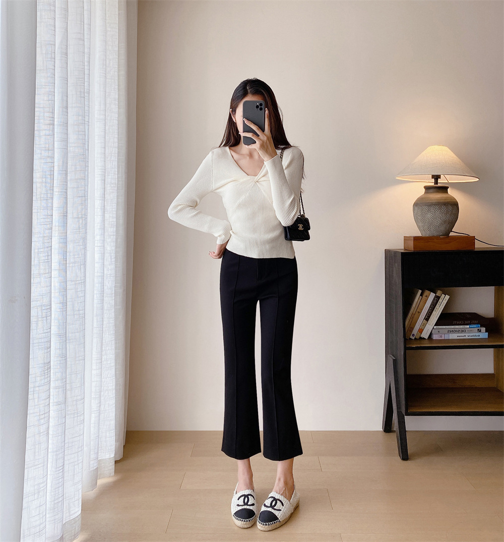 修身合体的喇叭裤型干净利落,上收而裤脚微放的设计