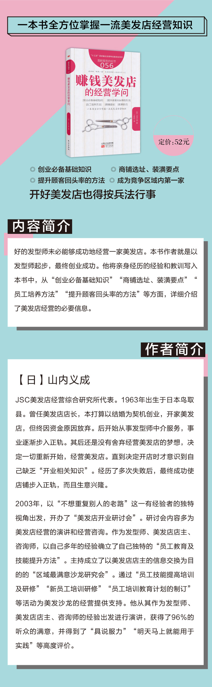 好的发型师未必能够成功地经营一家美发店。本书作者就是以发型师起步,最终创业成功。他将亲身经历的经验和教训写入本书中,从“创业必备基础知识”“商铺选址、装潢要点”“员工培养方法”“提升顾客回头率的方法”等方面,详细介绍了美发店经营的必要信息。