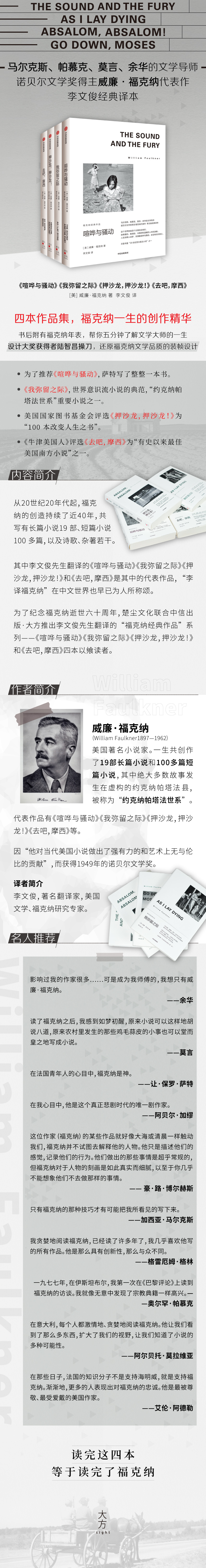 【1949年诺奖得主代表作】《福克纳经典作品》4册,读完这四本,等于读完了福克纳。马尔克斯、余华的文学导师,赠帆布袋