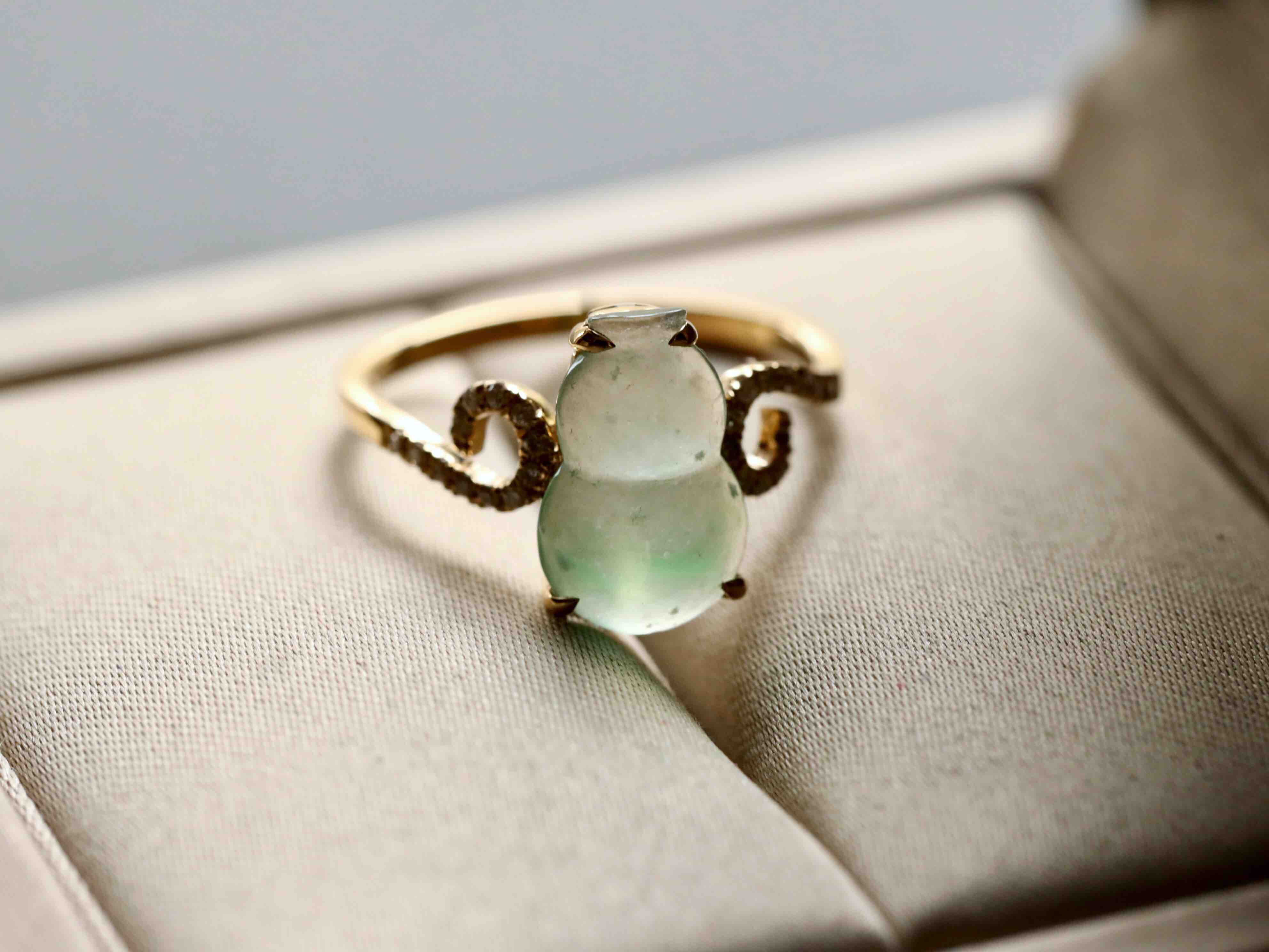 高冰到玻璃种阳绿雪花棉翡翠葫芦戒指18k黄金钻石镶嵌,精品推荐,一抹阳绿仙气十足,绿白分明,18k黄金钻石镶嵌,你们喜欢的简洁大方的款式,葫芦12.1×7.7×2.5mm,圈号13,可改大小,只要小四价位,强烈推荐