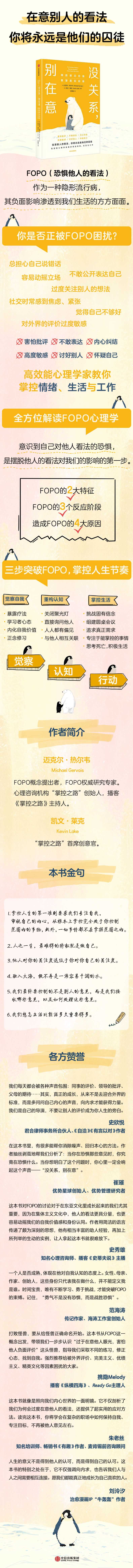 【媒体评论】我们每天都会被各种声音包围:同事的评价、领导的批评、父母的期待其实,真正的成长,从来不是去迎合外界的标准,而是多问问自己内心的声音,向内求才能获得力量。我们是自己的导演,不要让别人的评价成为你人生的旁白。 史欣悦 君合律师事务所合伙人、《自洽》《有言以对》作者 在这本书里,有很多能帮你消除噪声、回归本心的方法。作者抽丝剥茧地帮我们分析了:当你在恐惧那些意见时,你究竟在恐惧什么。当你想明白了这个问题时,你心里一定会响起这个声音;没关系,别在意。 崔璀 优势星球创始人、优势管理研究者这本书对FOPO的讨论对于在东亚文化里成长起来的我们尤其重要,因为在集体主义文化中,他人的看法更具分量,也更容易动摇我们的自我价值感和身份认同。作者用简洁的语言传递了颇为深刻的思想,他有相当丰富的助人经验,再加上所列举的生动的实例,让人拿起这本书就很难放下。史秀雄知名心理咨询师、播客《史蒂夫说》主播一个人是否成熟,体现在他对自我认知的态度上。女性、母亲、作家、创始人,这些身份只代表我在做什么,并不能定义我是谁。时间宝贵,唯有不断学习、勇于挑战,才能突破FOPO的束缚。记住,;勇气不是没有恐惧,而是战胜恐惧。范海涛传记作家、海涛工作室创始人打败怪兽,要从给怪兽正确命名开始。这本书从FOPO这一概念出发,带领我们一步步认识;过于在意他人眼光,害怕他人负面评价这头怪兽,指导我们采取不同的练习,修正心态,找到自我。强烈推荐给被外界评价、完美主义、优绩主义、精英文化等因素困扰的大家。携隐Melody播客《纵横四海》、Ready Go主理人 这本书就像是照向我们内心世界的一面明镜。它不仅剖析了我们为何会过度在意他人的看法,还提供了超实用的应对方法。读完这本书,你将学会在复杂的职场中如何保持自我、专注目标,不再被他人意见左右。 朱老丝 知名培训师、畅销书《有趣》作者、麦肯锡前咨询顾问 人生的意义不是得到他人的认可,而是得到自己的认可。这本书的特别之处在于,它不仅强调向内求,也告诉我们人与人之间需要相互连接。愿我们都能真正地成长为自己喜欢的人。 刘泠汐治愈漫画IP;牛轰轰作者
